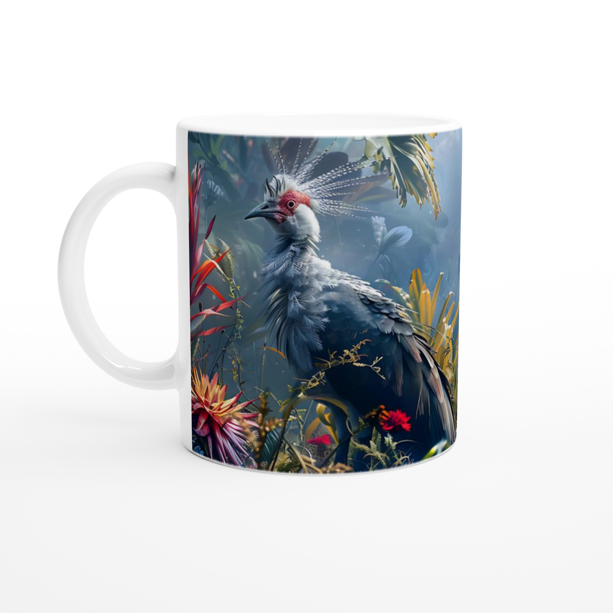 Lyft varje kaffestund med vår premium keramikmugg – stilren, hållbar och skapad för att låta ditt motiv glänsa. Denna mugg fångar den mystiska skönheten hos en exotisk fågel i en dimhöljd djungel, med rika röda, guldiga och gröna toner som skapar en drömlik atmosfär. Den blanka vita ytan ger ett skarpt och levande tryck som verkligen sticker ut, oavsett om det är en personlig design, ett roligt citat eller en present till någon du tycker om.