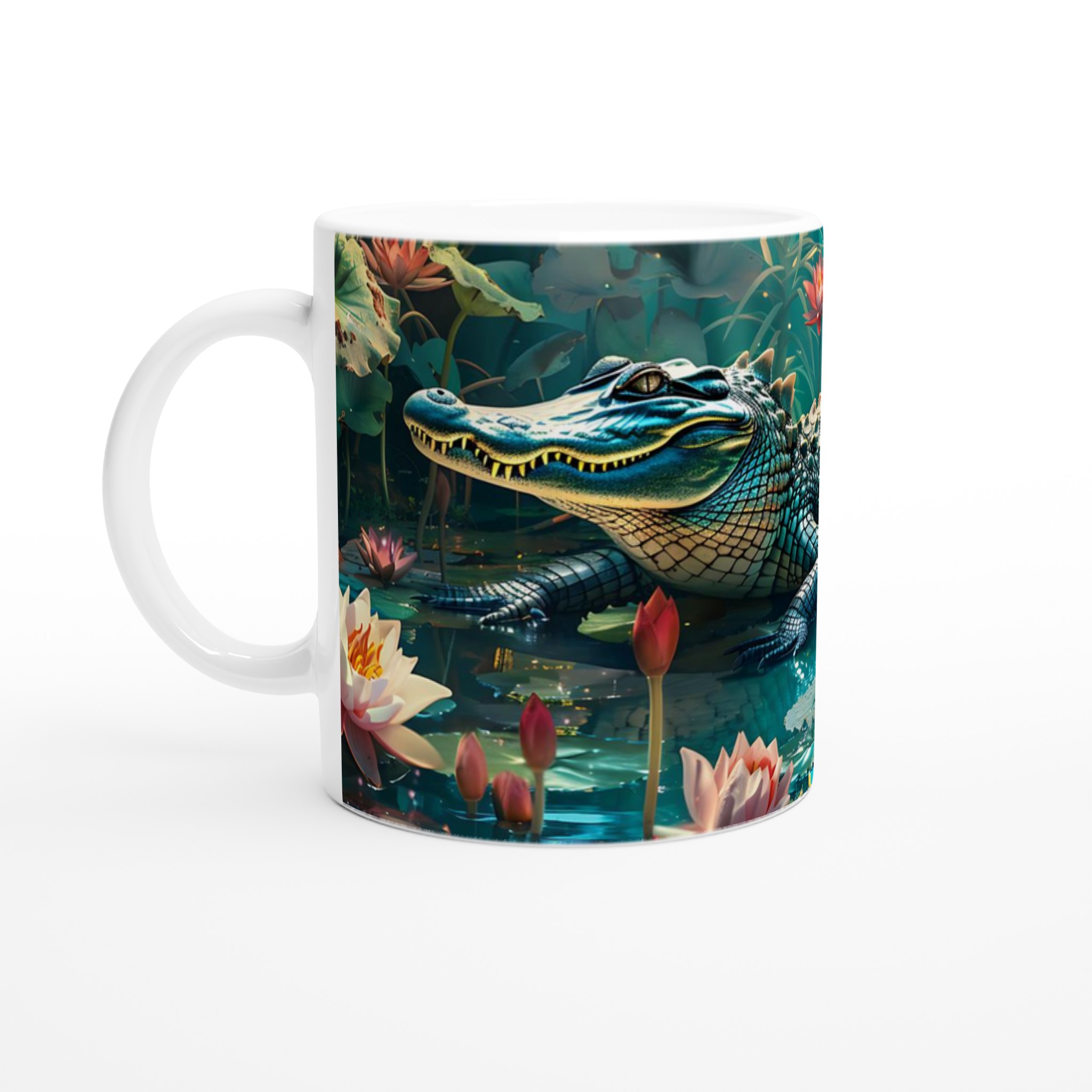 Inspirerad av djungelns mystik och tropiska färgprakt, bär denna mugg ett unikt tryck av en glödande krokodil omgiven av fantastiska lotusblommor. Den blanka vita ytan ger ett skarpt och levande tryck som verkligen sticker ut, oavsett om det är en personlig design, ett roligt citat eller en present till någon du tycker om.