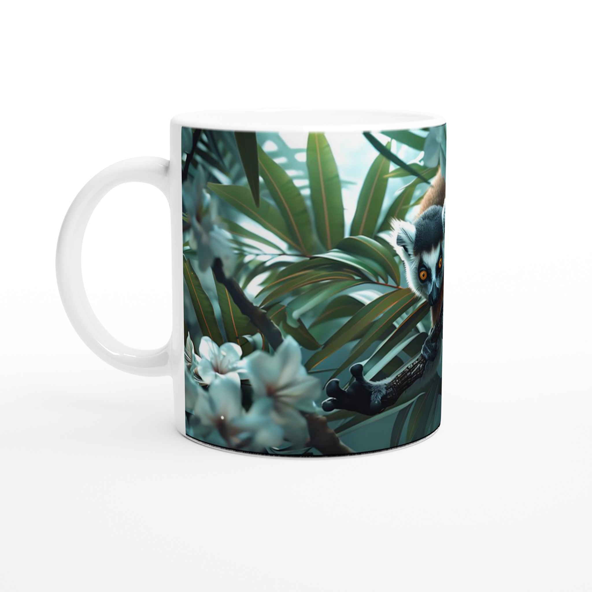 Inspirerad av den mystiska skönheten hos djurlivet i regnskogen, med en lemur som blickar fram genom frodiga bladverk och delikata vita blommor, ger den här muggen en känsla av äventyr till din vardag. Den blanka vita ytan ger ett skarpt och levande tryck som verkligen sticker ut, oavsett om det är en personlig design, ett roligt citat eller en present till någon du tycker om.