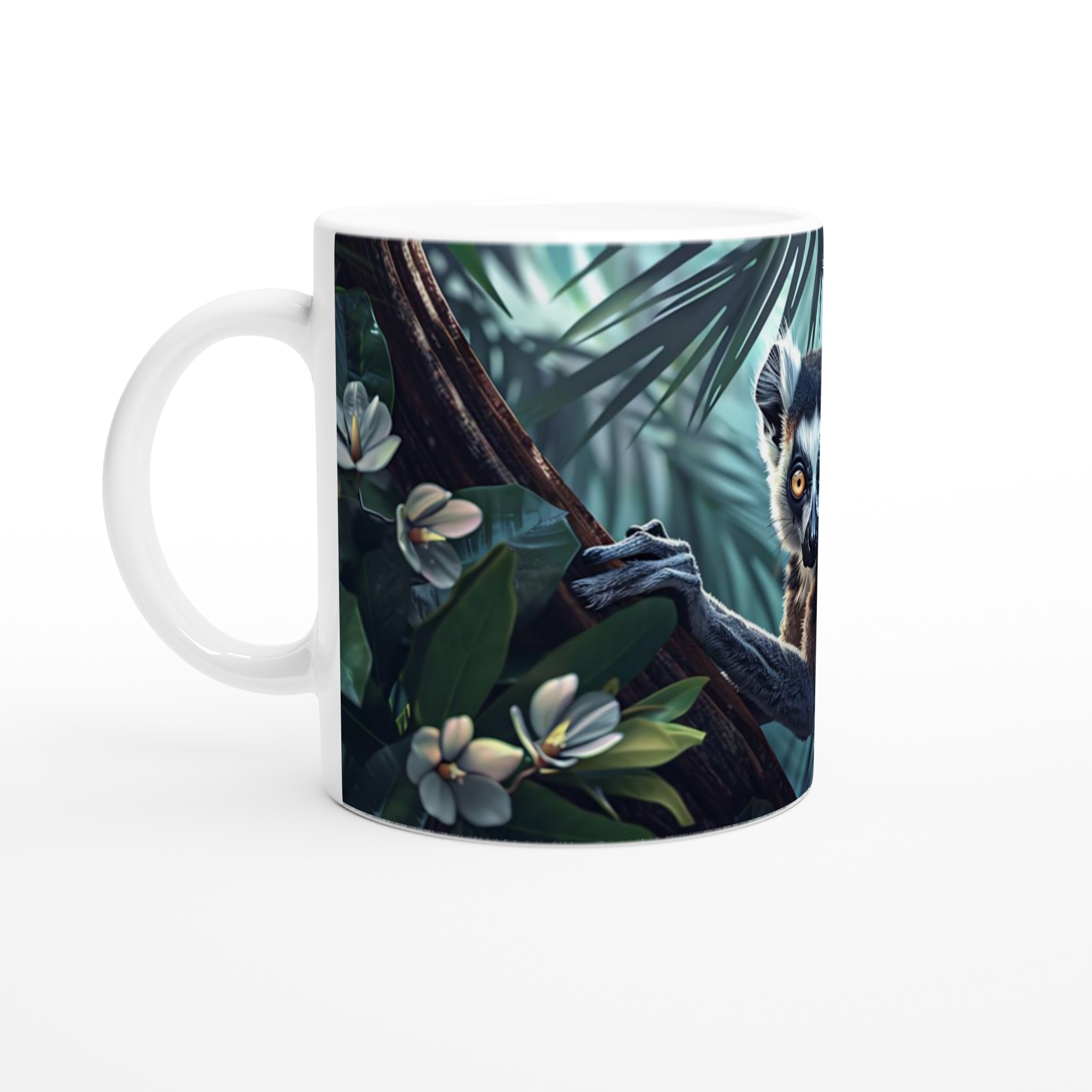Denna mugg fångar den fängslande blicken från en exotisk lemur, omgiven av frodig djungelgrönsk. Med levande färger och skarpa detaljer, blir varje klunk en resa till en tropisk oas. Den blanka vita ytan ger ett skarpt och levande tryck som verkligen sticker ut, oavsett om det är en personlig design, ett roligt citat eller en present till någon du tycker om.