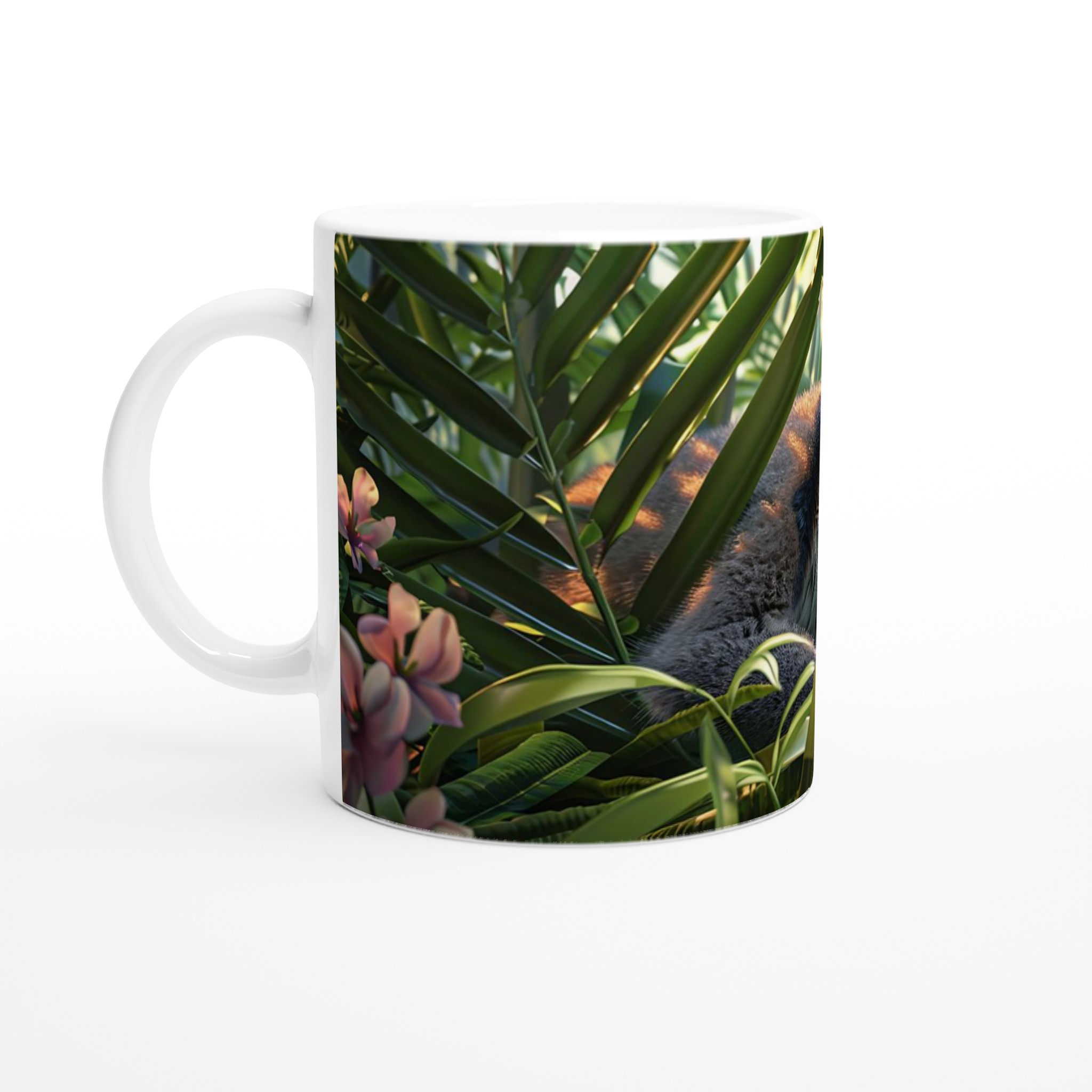 Fånga blicken med denna charmiga mugg med en lekfull lemur som kikar fram bland frodiga gröna blad och exotiska blommor. Den detaljrika designen med varma guldtoner och en lugnande färgpalett skapar en känsla av äventyr och natur. Välj din favoritfärg bland våra sju livfulla alternativ, inklusive klassisk Ceramic White, solig Ceramic Yellow, drömsk Ceramic Pink, fridfull Ceramic Green, energisk Ceramic Red, djup Ceramic Black eller lugnande Ceramic Blue för att matcha din personliga stil eller ge bort som en unik gåva. Varje färg framhäver den fantastiska designen och blir ett personligt uttryck.