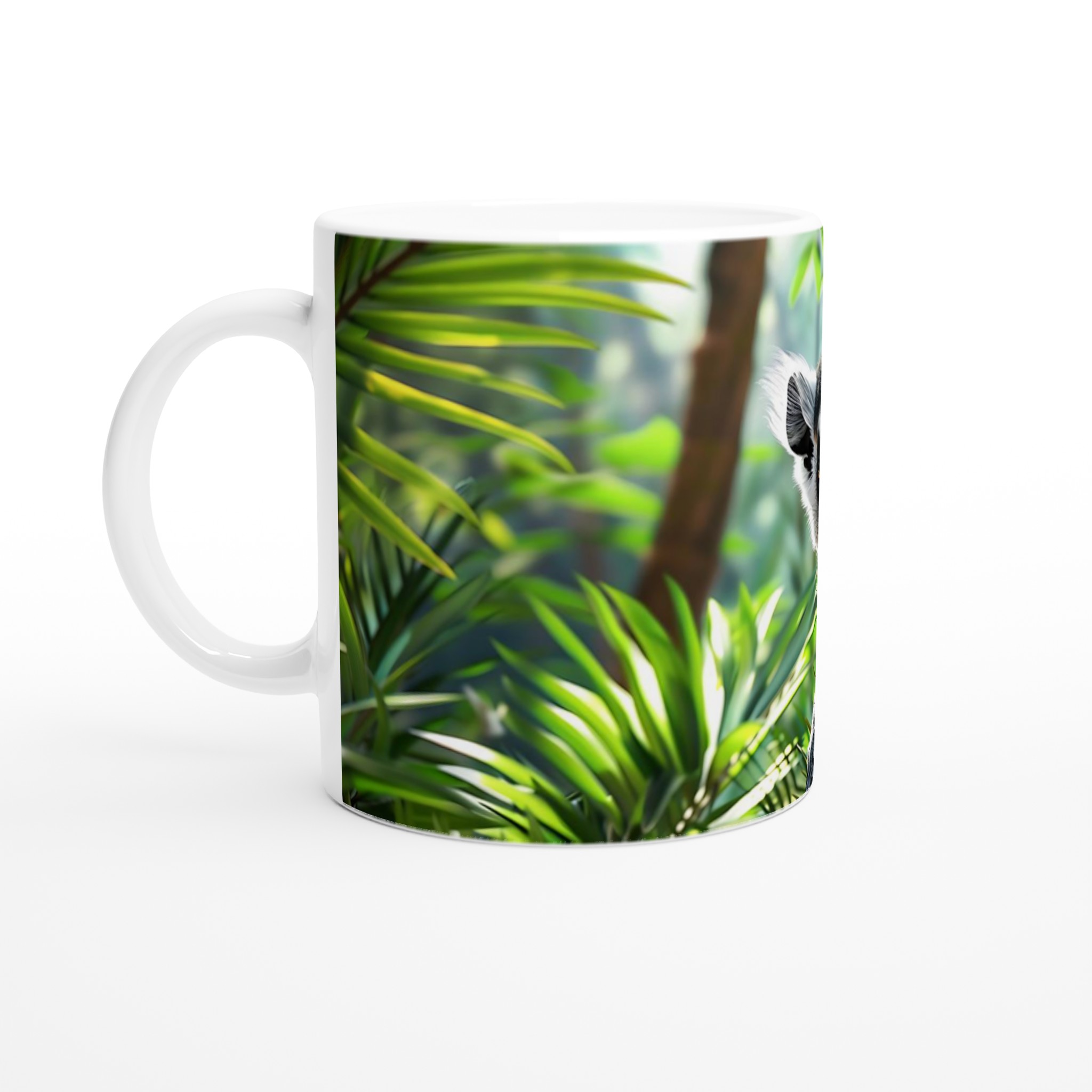 Lyft varje kaffestund med vår premium keramikmugg – stilren, hållbar och skapad för att låta ditt motiv glänsa. Föreställ dig att starta dagen med den fängslande blicken från en exotisk lemur, omgiven av frodig grönska. Denna mugg är inte bara en dryckesbehållare, utan en liten bit av naturens under som förgyller din paus, oavsett om det är en personlig design, ett roligt citat eller en present till någon du tycker om.