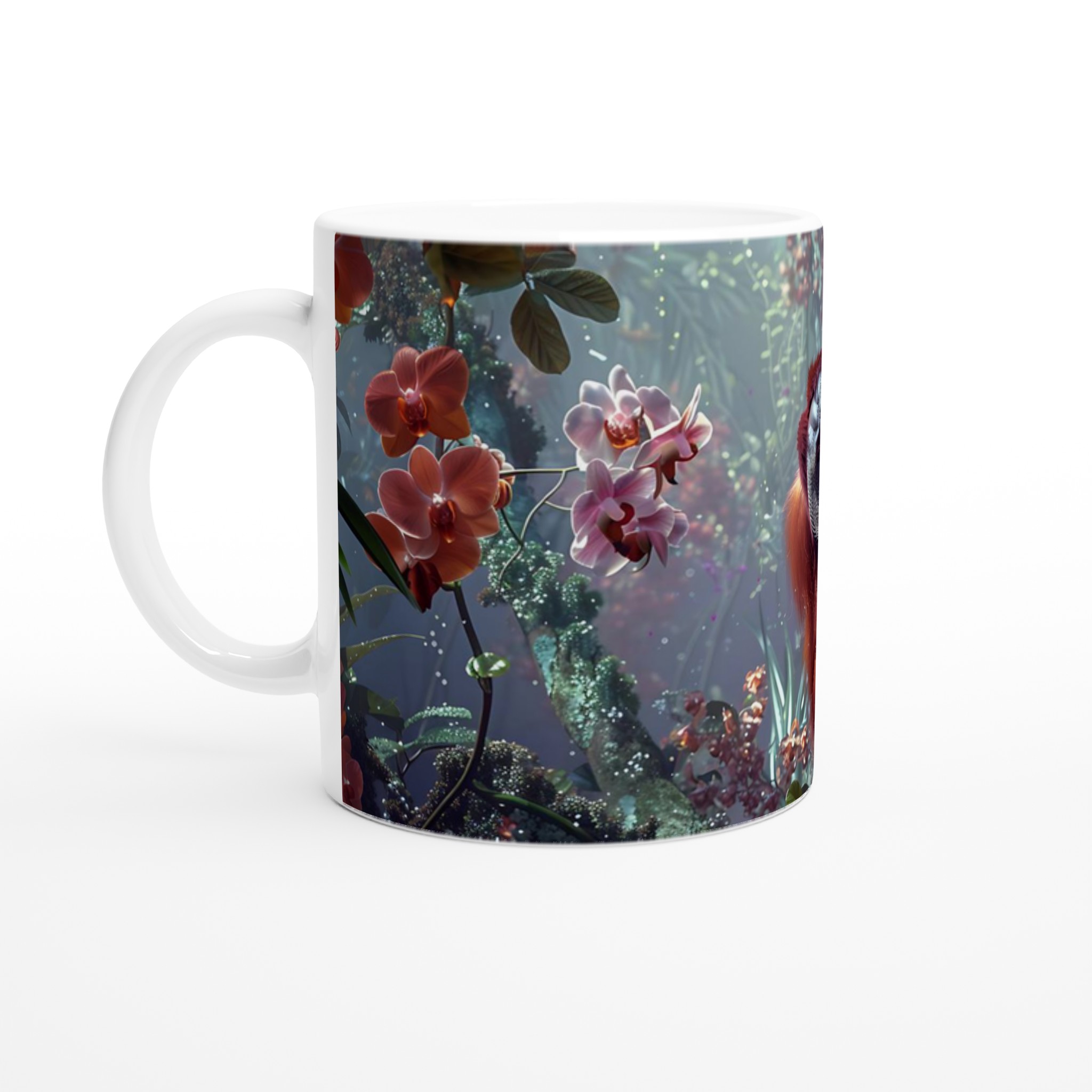 Inspirerad av den mystiska skönheten i en frodig djungel, fångar denna mugg den lugna men majestätiska andan hos en orangutang omgiven av blomstrande orkidéer i varma korall- och rosa nyanser. Den blanka vita ytan ger ett skarpt och levande tryck som verkligen sticker ut, oavsett om det är en personlig design, ett roligt citat eller en present till någon du tycker om.