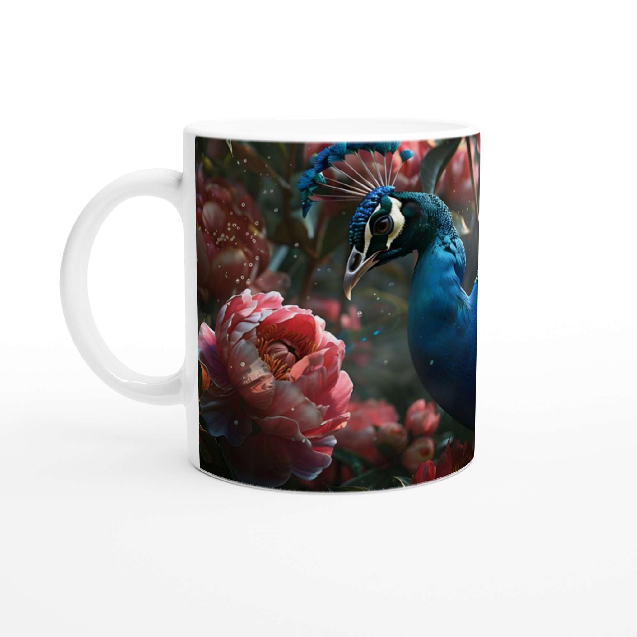Inspirerad av den majestätiska påfågeln som vilar bland frodiga pioner, fångar denna design en känsla av mystik och naturlig skönhet. Den blanka vita ytan ger ett skarpt och levande tryck som verkligen sticker ut, oavsett om det är en personlig design, ett roligt citat eller en present till någon du tycker om.