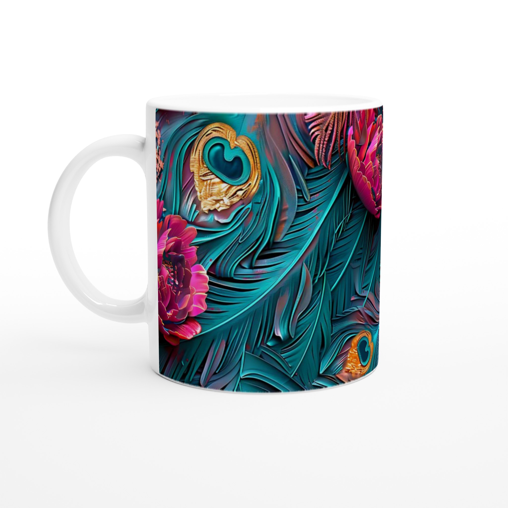Låt dig förtrollas av den exotiska skönheten från vår ”Exotisk Påfågel & Tropisk Blomsterprakt” mugg. Inspirerad av bilden, fångar denna mugg den rika, juvelliknande färgpaletten av turkosblå påfågelfjädrar med glittrande guldaccenter, elegant kombinerat med frodiga, fuchsiafärgade tropiska blommor. Den blanka vita ytan ger ett skarpt och levande tryck som verkligen sticker ut, oavsett om det är en personlig design, ett roligt citat eller en present till någon du tycker om.