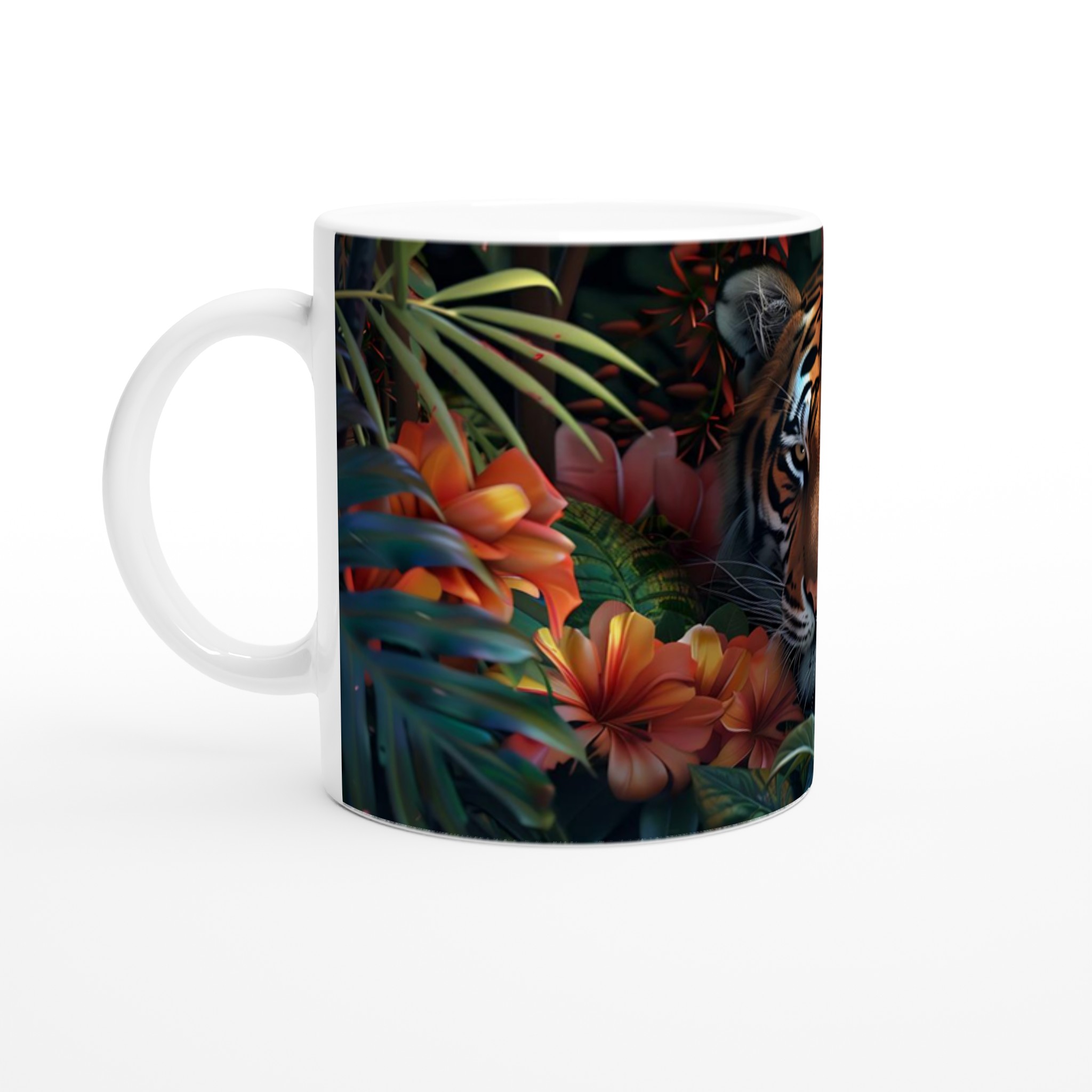 Inspirerad av djungelns mystik och naturens färgsprakande palett, är denna mugg en hyllning till det vilda och vackra. Den blanka vita ytan ger ett skarpt och levande tryck som verkligen sticker ut, oavsett om det är en personlig design, ett roligt citat eller en present till någon du tycker om.