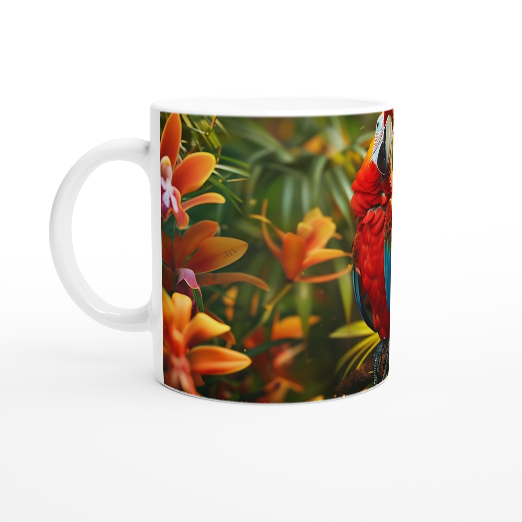 Inspirerad av djungelns pulserande energi, presenterar denna mugg en majestätisk papegoja omgiven av frodiga orkidéer och tropiska lövverk. Den blanka vita ytan ger ett skarpt och levande tryck som verkligen sticker ut, oavsett om det är en personlig design, ett roligt citat eller en present till någon du tycker om.