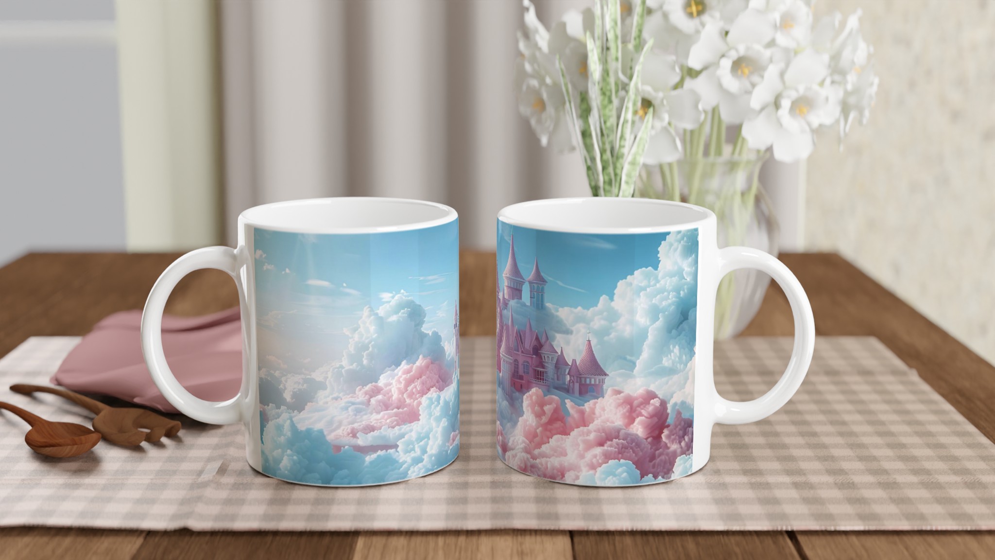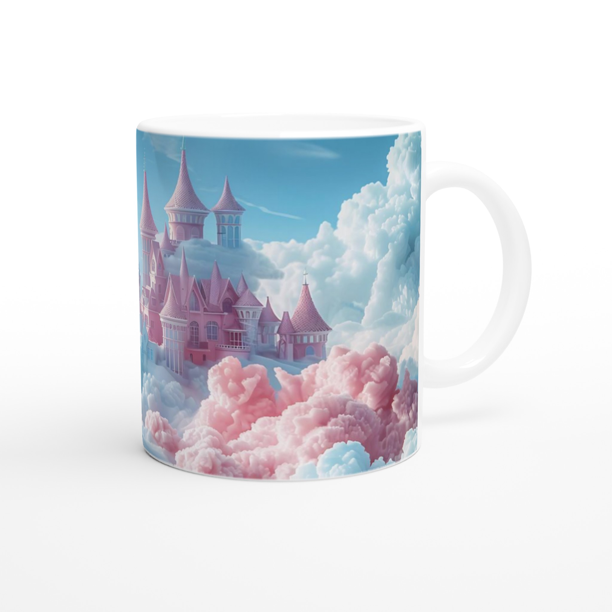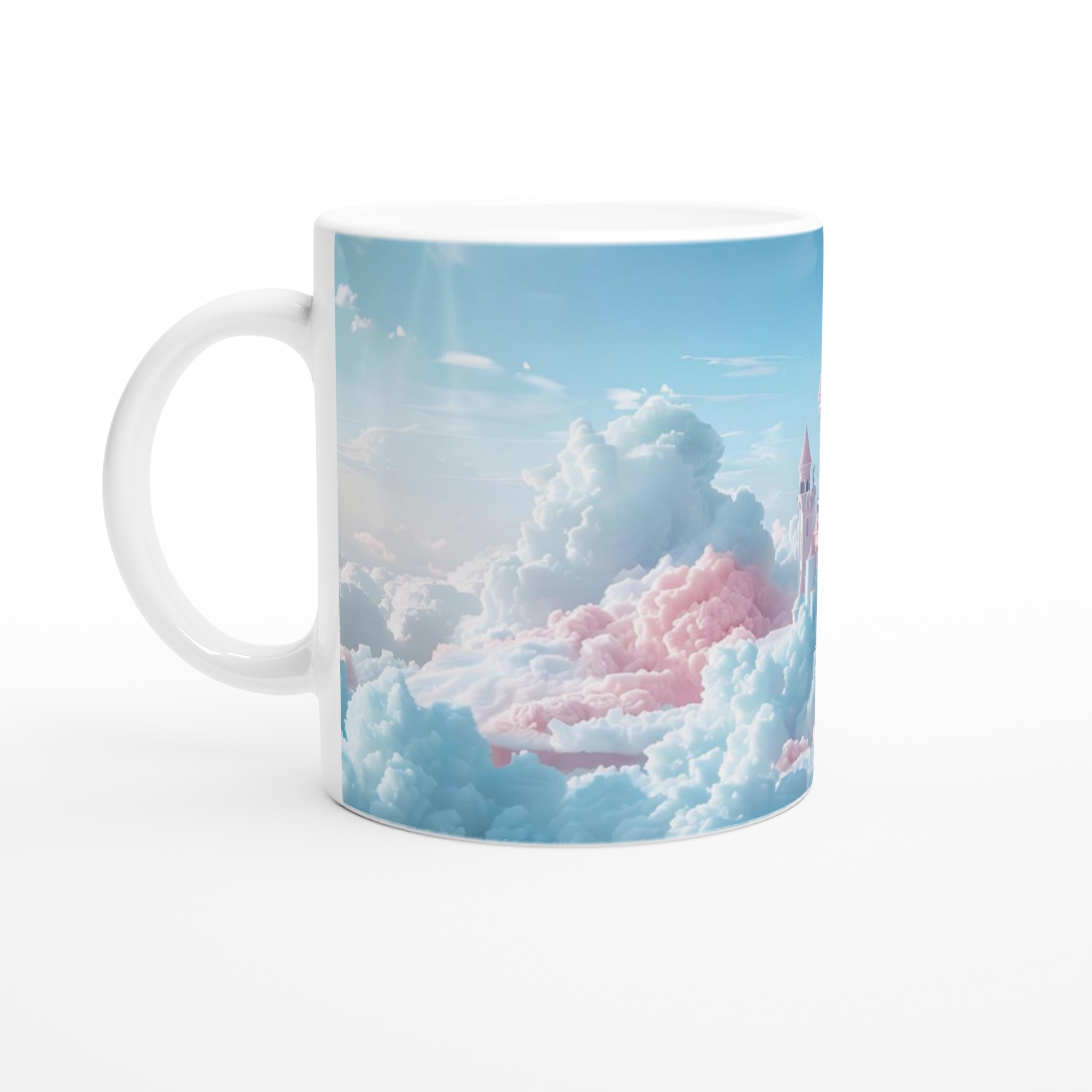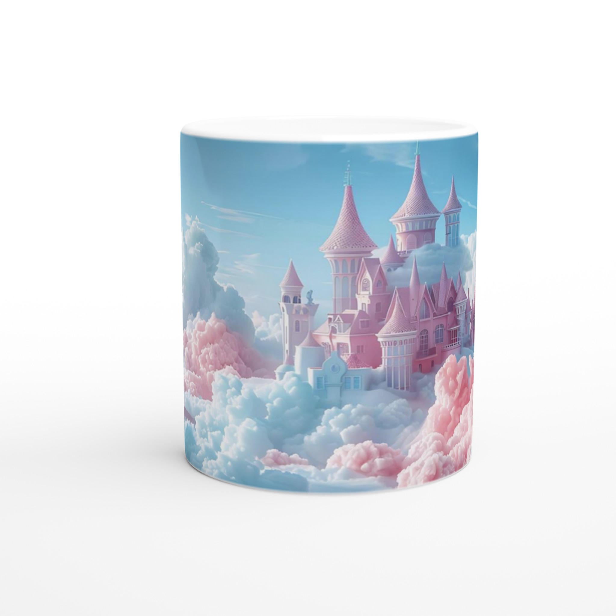 Dröm dig bort till ett sagoslott bland molnen med denna förtrollande keramiska mugg! Med en design som fångar den eteriska skönheten hos ett drömskt slott omgivet av sockervaddsrosa och himmelsblå moln, är denna mugg mer än bara en kopp – den är en daglig påminnelse om magi och fantasi.