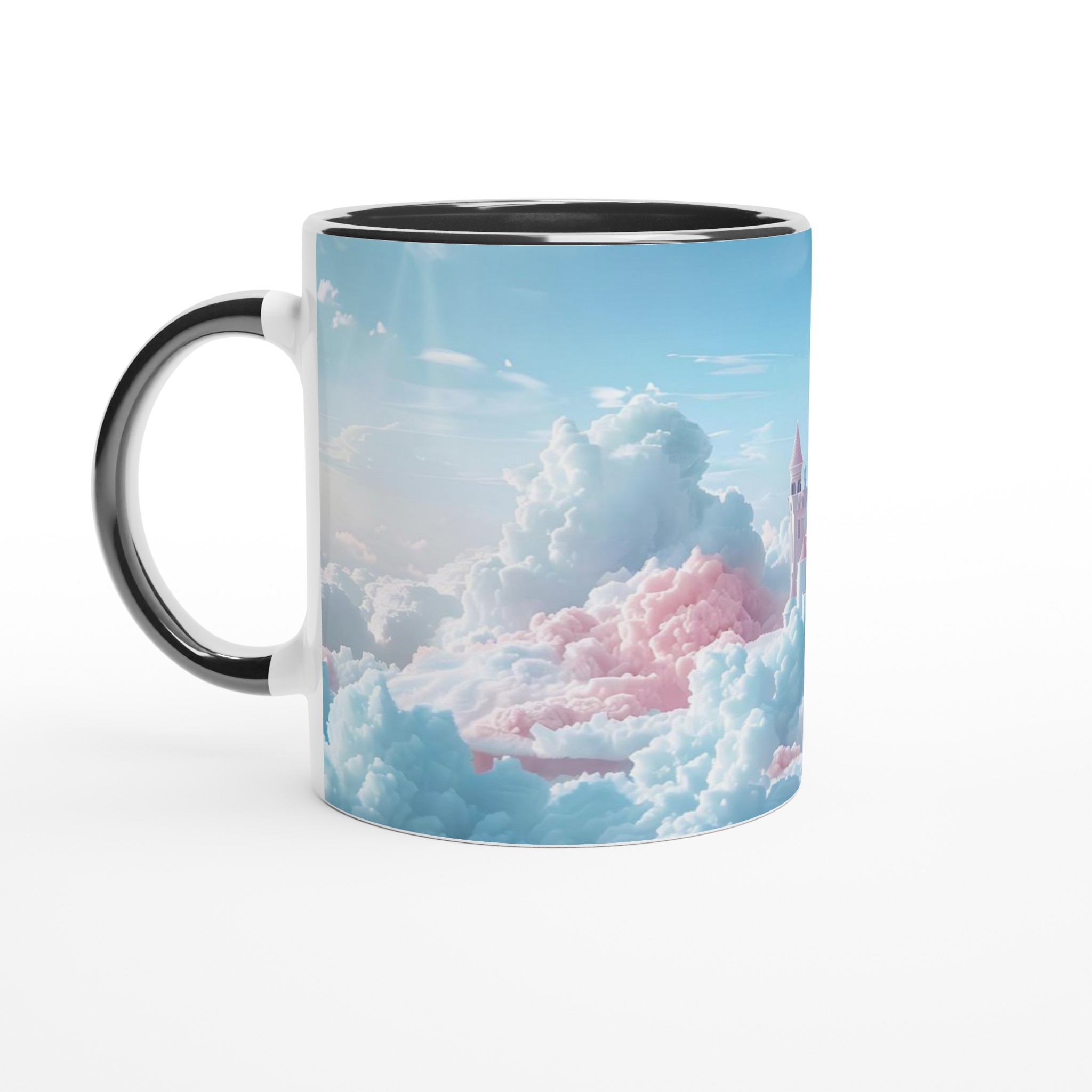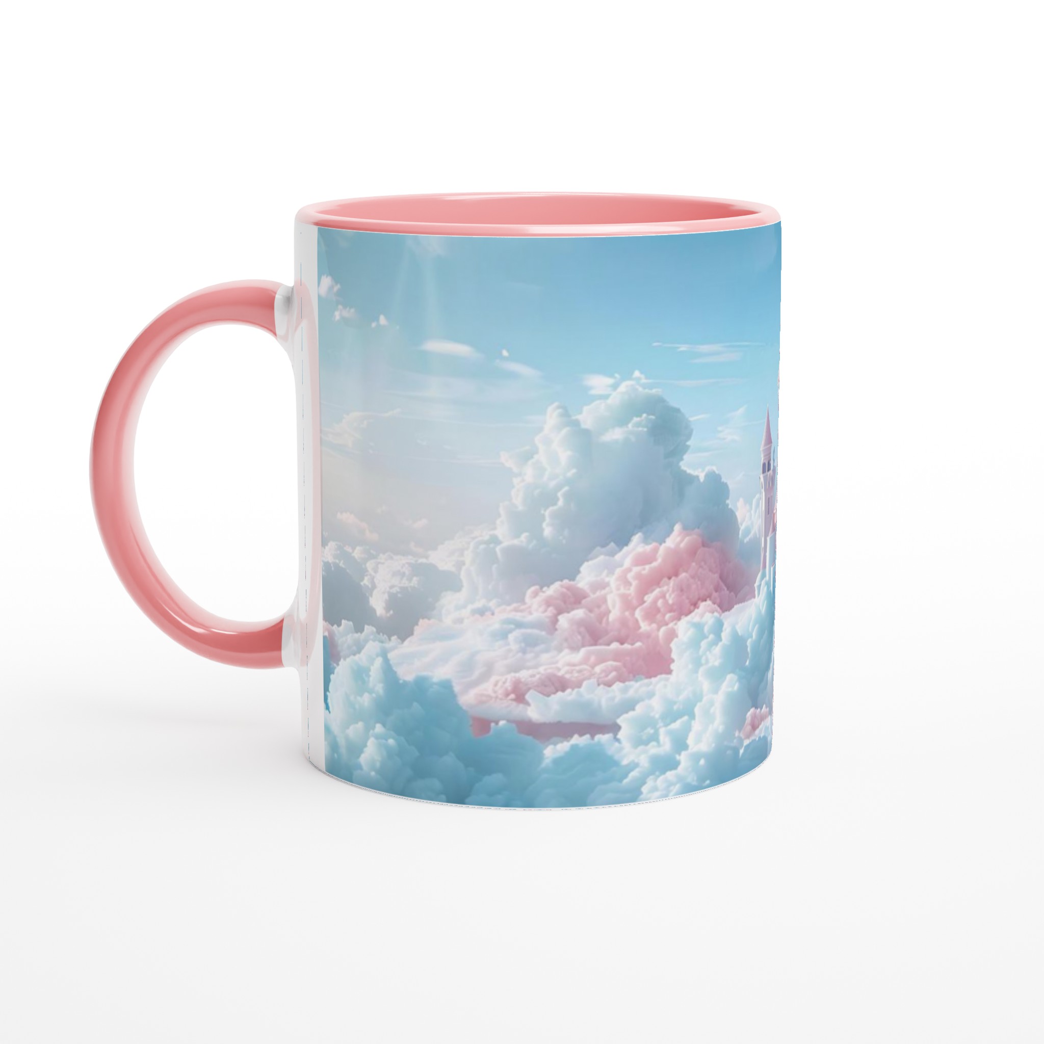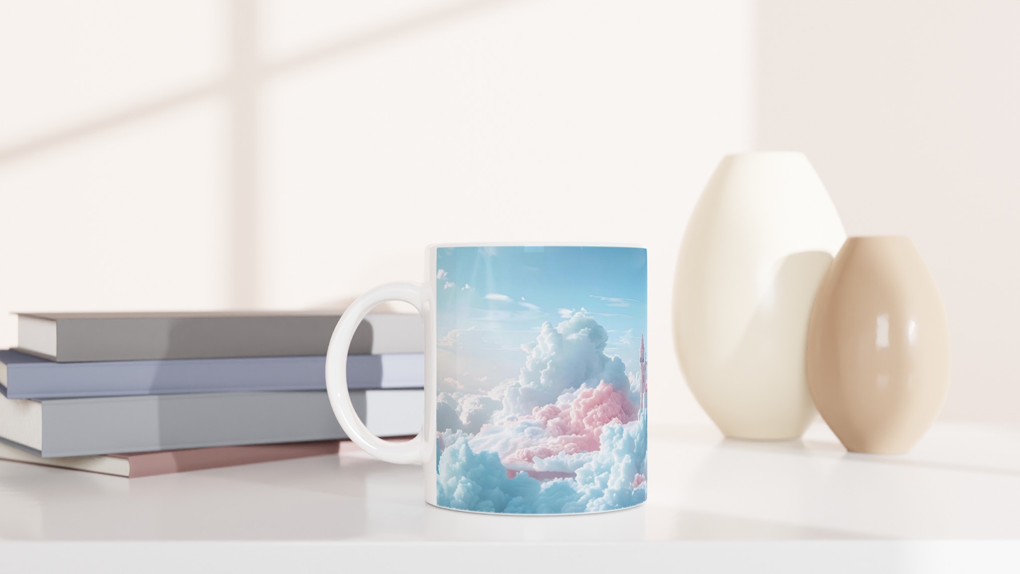 Dröm dig bort till ett sagoslott bland molnen med denna förtrollande keramiska mugg! Med en design som fångar den eteriska skönheten hos ett drömskt slott omgivet av sockervaddsrosa och himmelsblå moln, är denna mugg mer än bara en kopp – den är en daglig påminnelse om magi och fantasi.