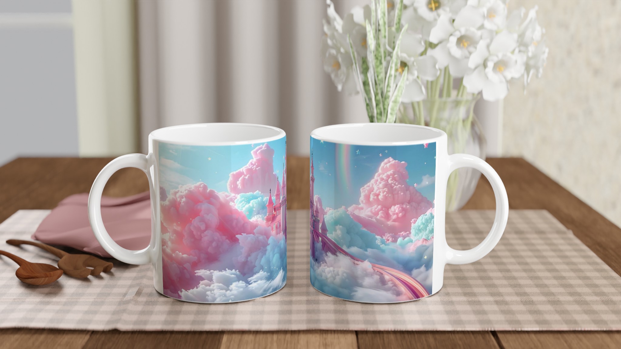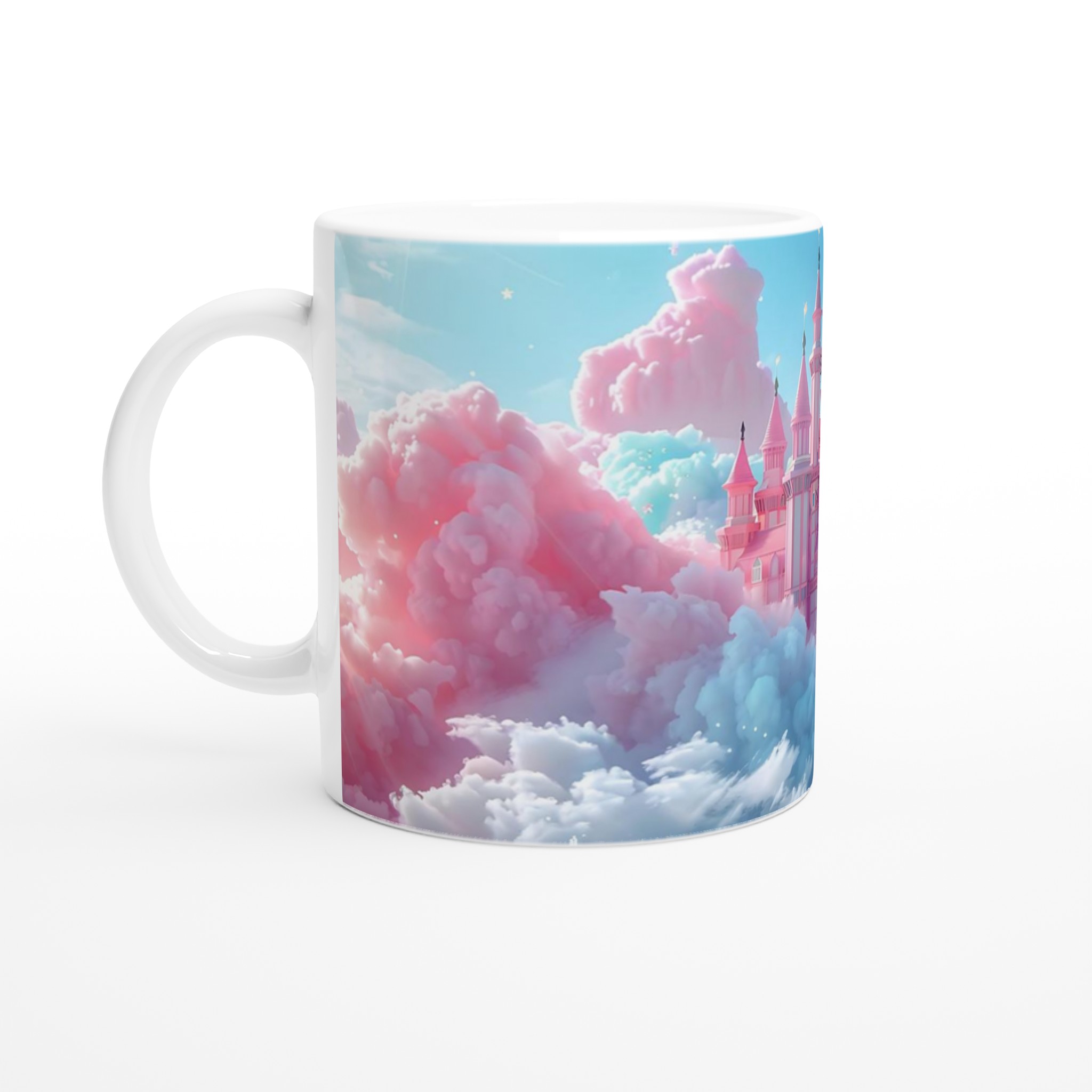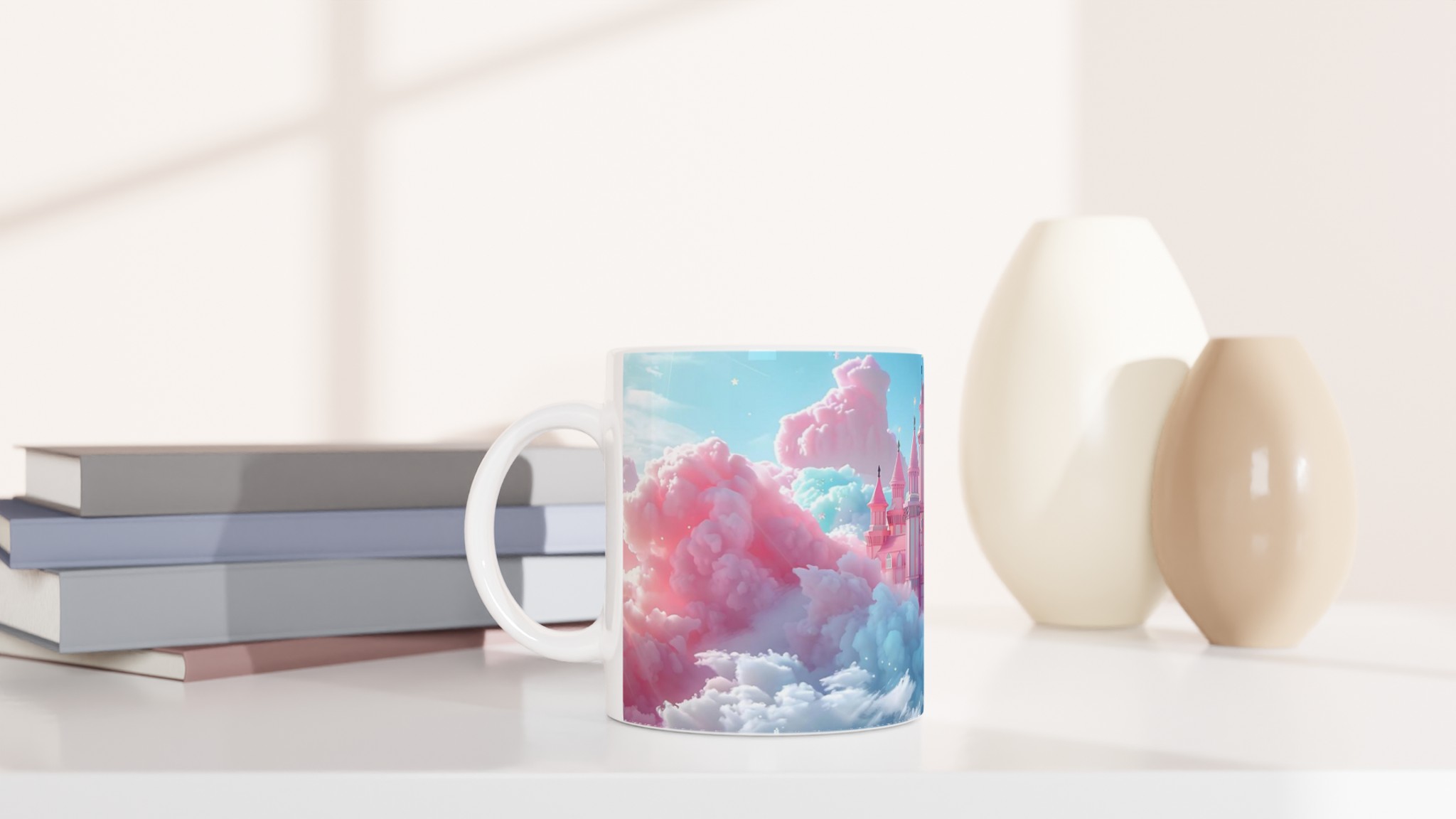 Stig in i en drömvärld varje gång du tar en klunk med denna förtrollande keramiska mugg, som fångar magin av ett sagoslott bland fluffiga pastellmoln. Inspirerad av bilden av ett rosa slott som svävar bland himmelsblå och sockervaddsrosa moln, är denna mugg mer än bara en dryckesbehållare – den är en daglig påminnelse om fantasi och under. Den blanka vita ytan gör att det drömska motivet framhävs med klara och levande färger, som håller sig fina även efter många turer i mikron och diskmaskinen.