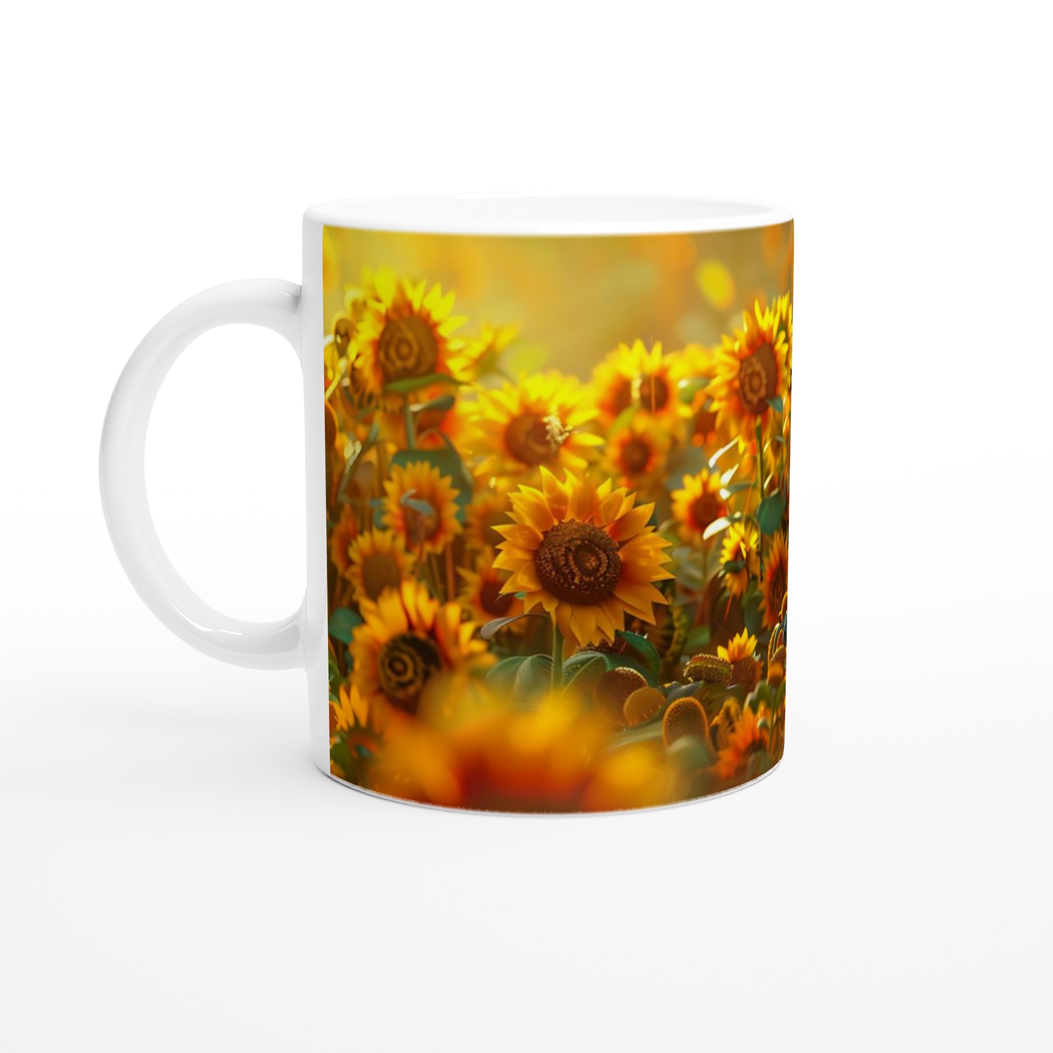 Gör ditt val bland en regnbåge av färger: Ceramic White, Ceramic Yellow, Ceramic Pink, Ceramic Green, Ceramic Red, Ceramic Black eller Ceramic Blue. Välj den nyans som bäst speglar din personlighet eller den magiska scenen med fantasivarelsen bland solrosorna. Skapa din egen unika mugg idag!