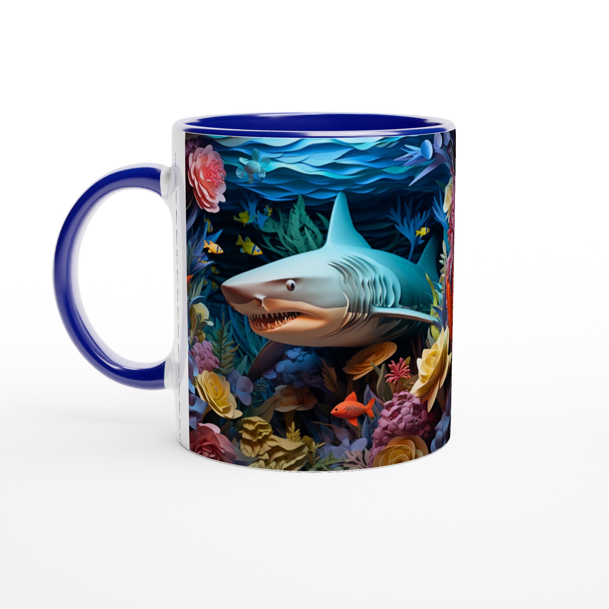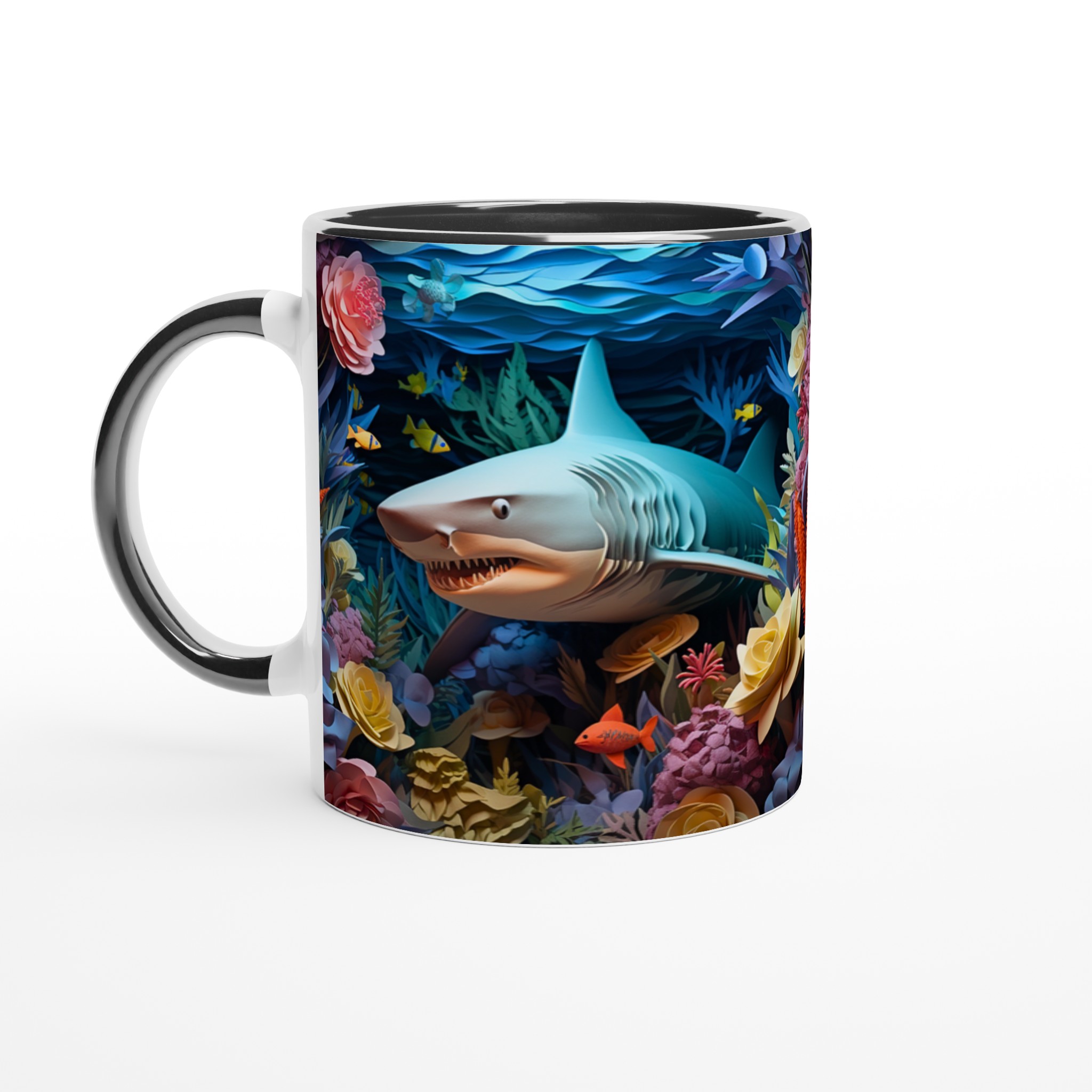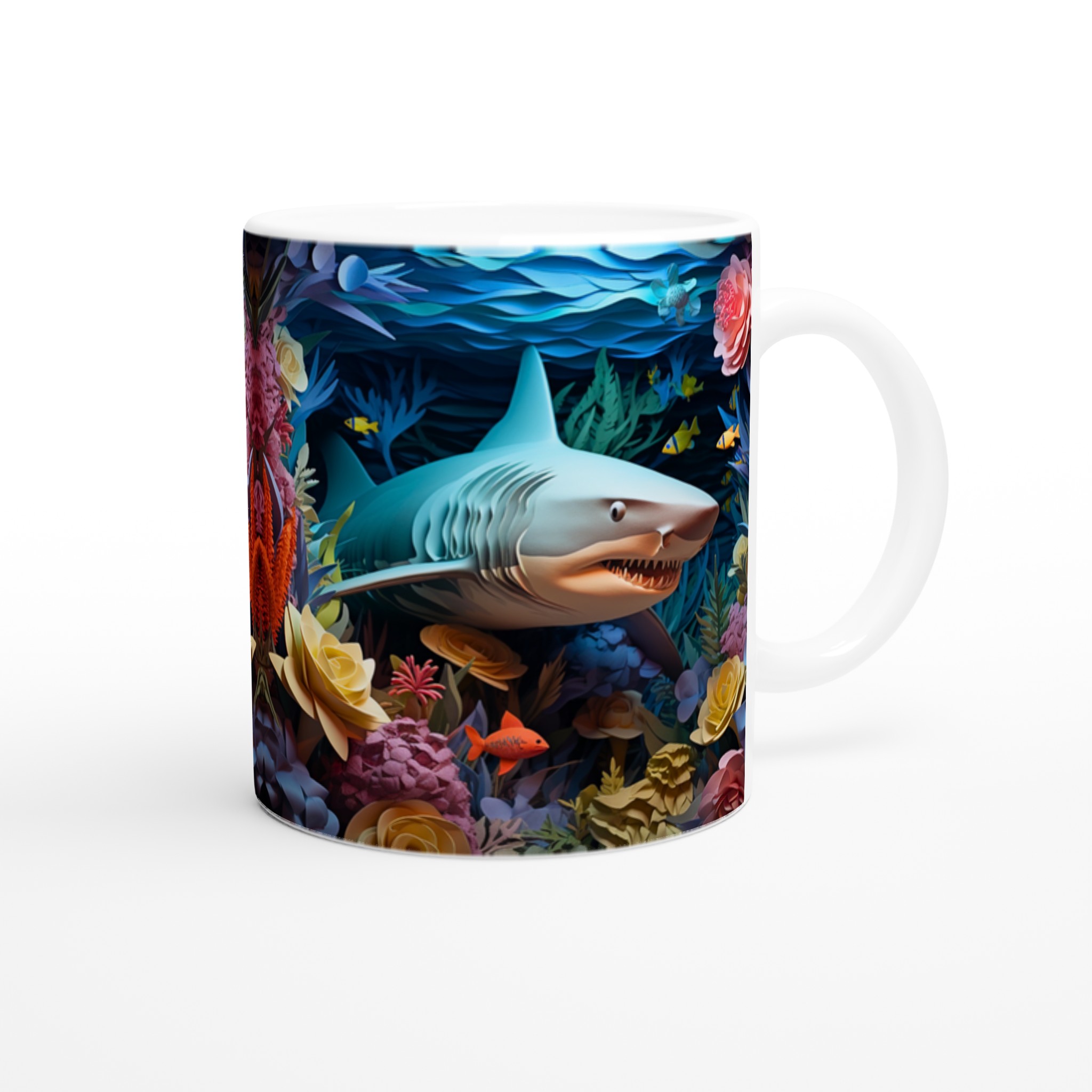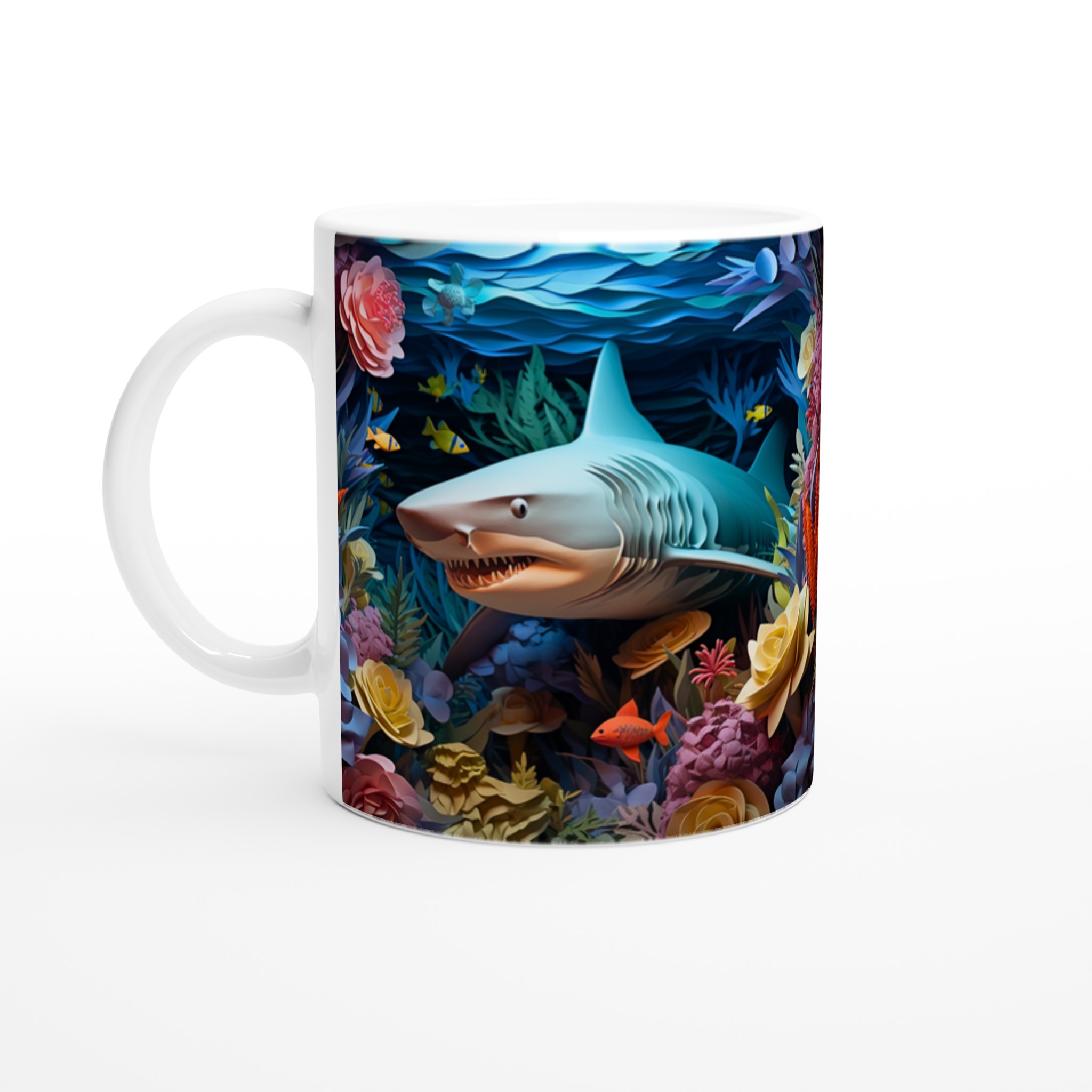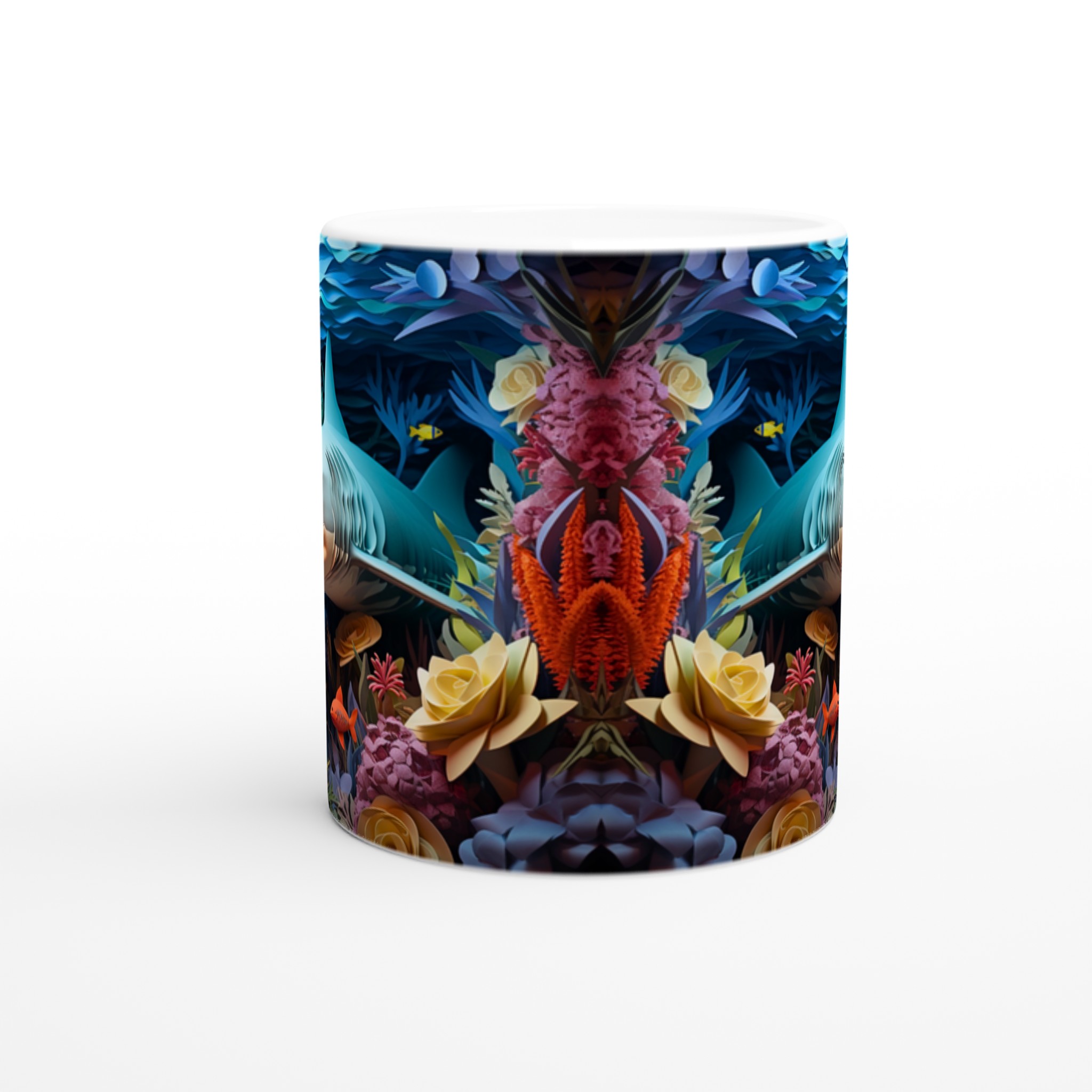 Dyk ner i en värld av färg och fantasi med vår spektakulära hajmugg. Med ett levande undervattensmotiv skapat med intrikata pappersutskärningar av hajar, färgglada fiskar och frodigt marint liv, är denna mugg mer än bara en kopp – den är ett konstverk. Den rika paletten av blått, grönt, rosa och orange väcker liv i varje detalj och skapar en känsla av äventyr med varje klunk.