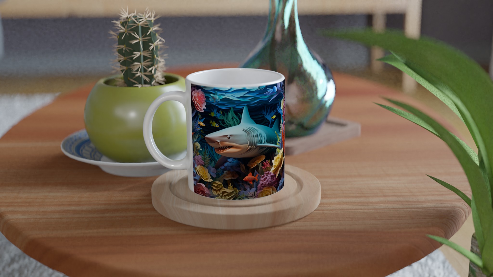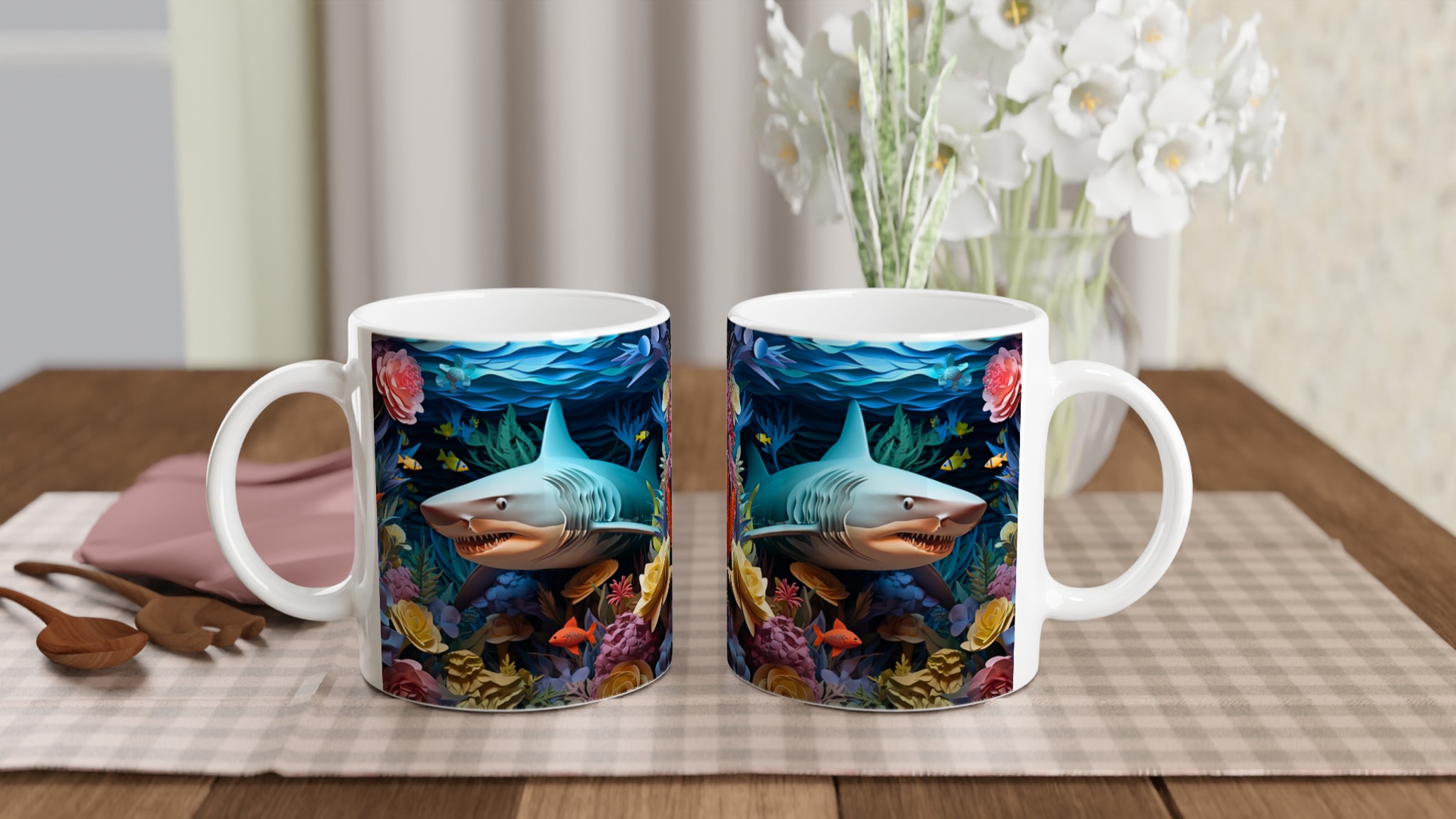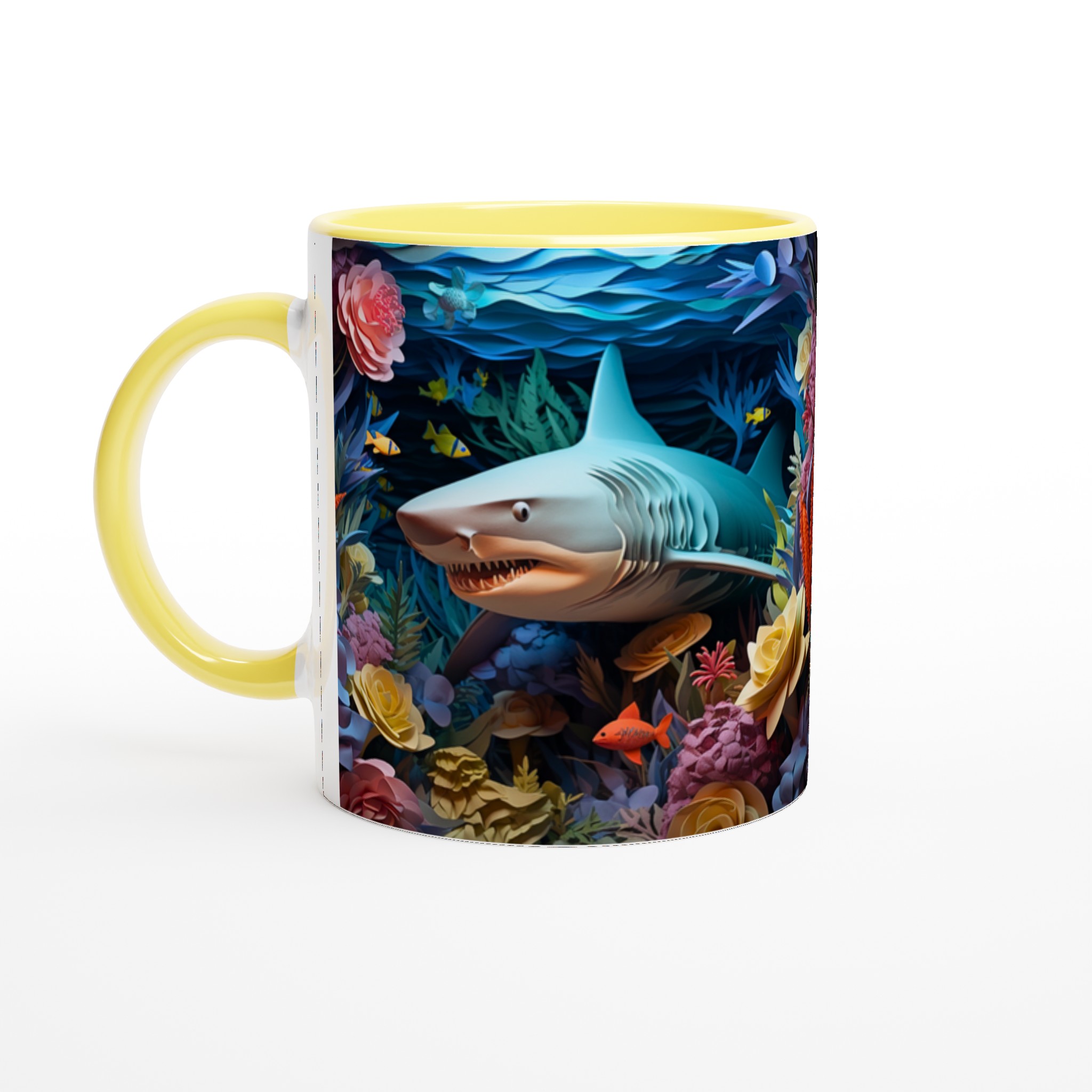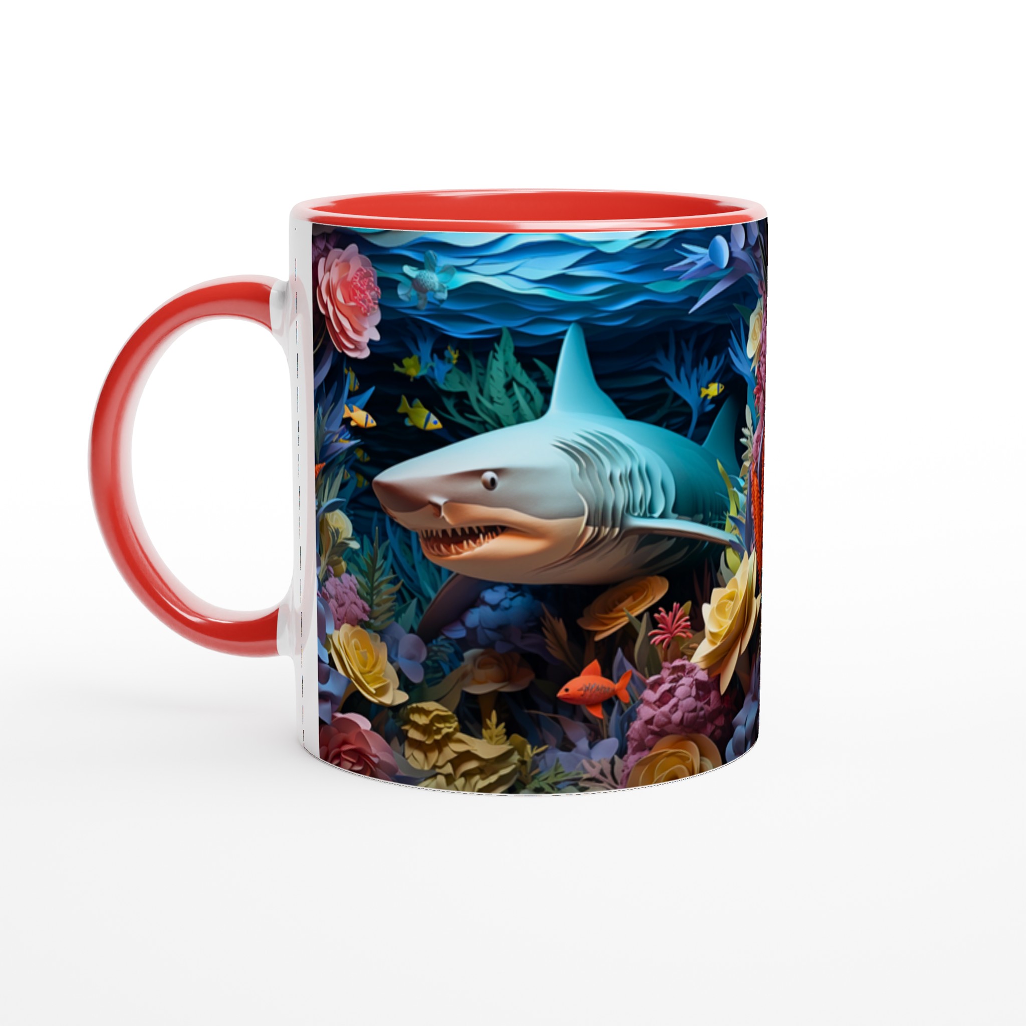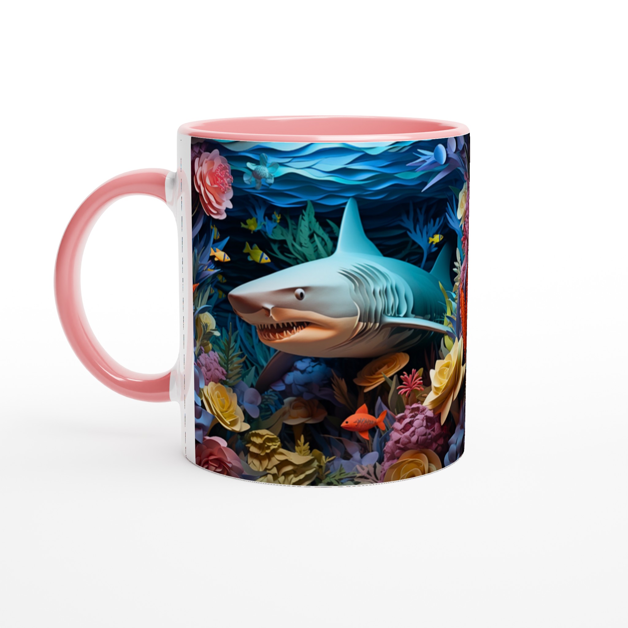 Dyk ner i en värld av färg och fantasi med vår spektakulära hajmugg. Med ett levande undervattensmotiv skapat med intrikata pappersutskärningar av hajar, färgglada fiskar och frodigt marint liv, är denna mugg mer än bara en kopp – den är ett konstverk. Den rika paletten av blått, grönt, rosa och orange väcker liv i varje detalj och skapar en känsla av äventyr med varje klunk.
