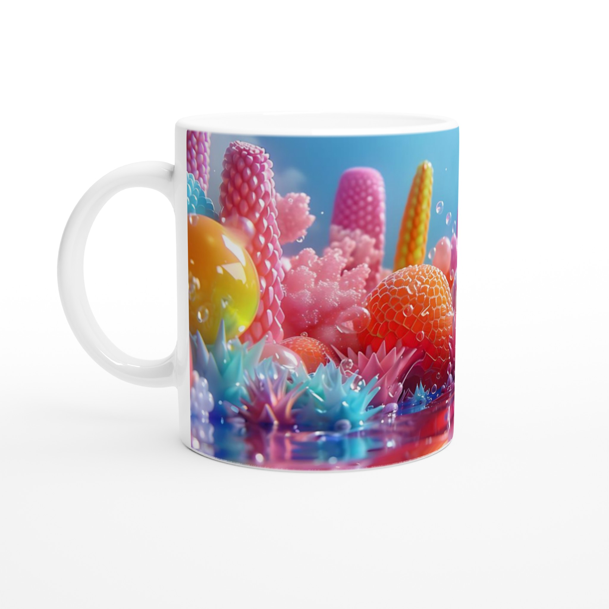 Dyk in i en värld av fantasifulla färger och lekfulla akvatiska former varje gång du tar en klunk! Denna 11oz keramiska mugg fångar den livfulla energin från korallrev och undervattensbubblor med sin blanka vita yta som ger ett skarpt och levande tryck som verkligen sticker ut. Oavsett om det är en personlig design, ett roligt citat eller en present till någon du tycker om, kommer de rika färgerna och det unika mönstret att göra varje dryck till en upplevelse.