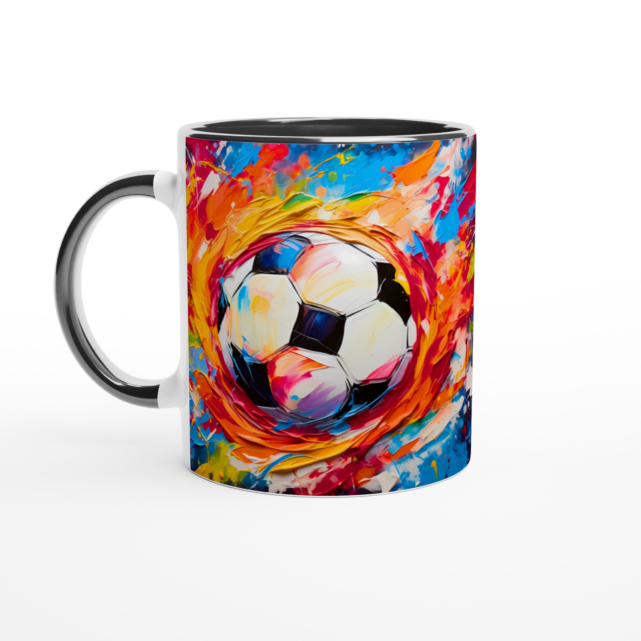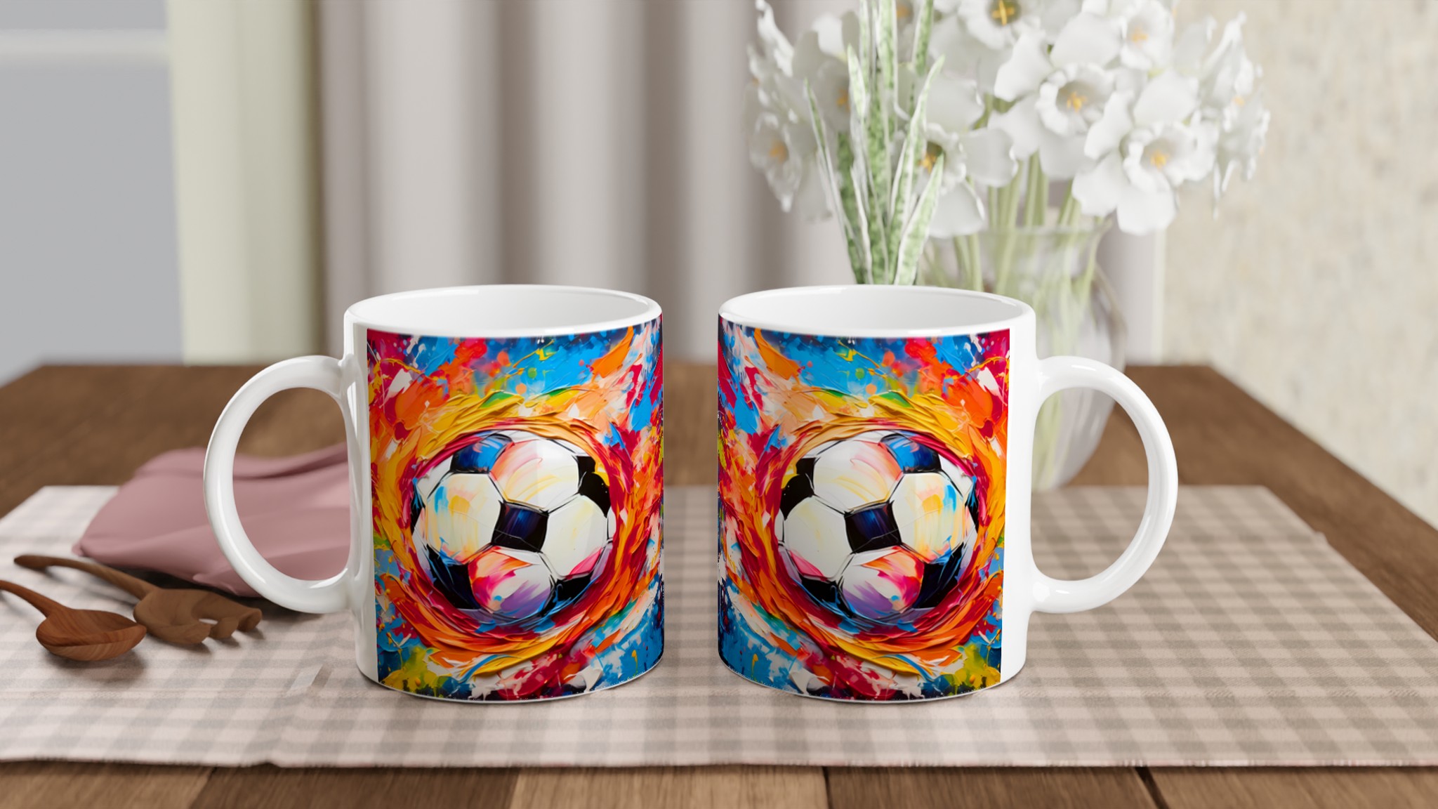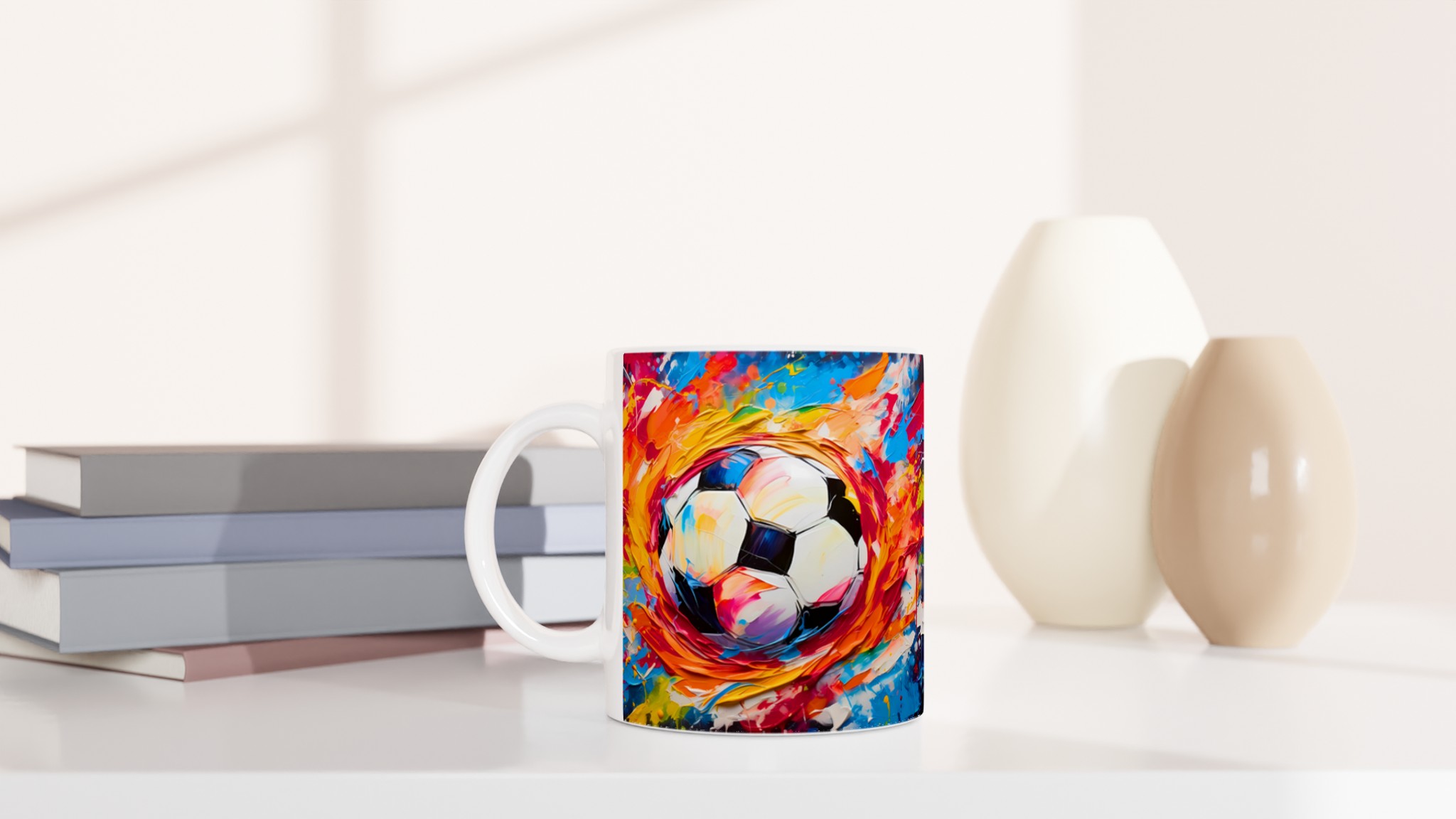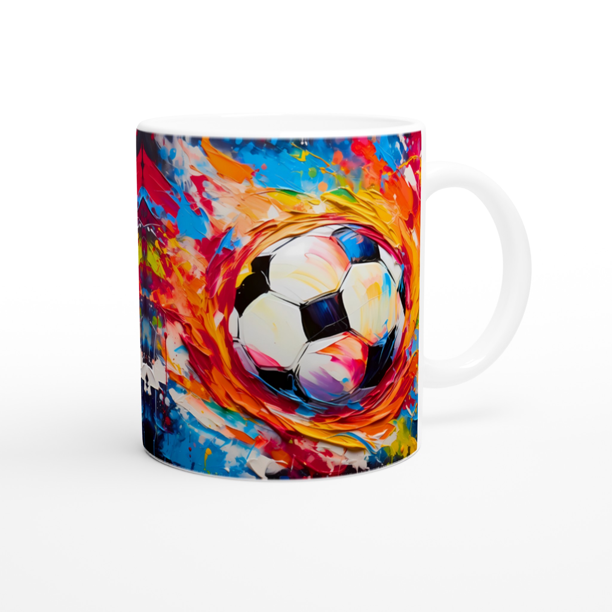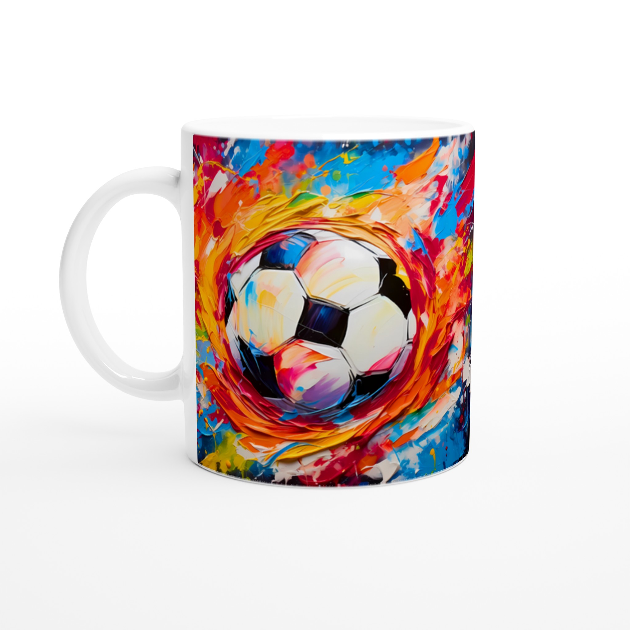 Sätt färg på din dag med denna levande keramiska mugg, prydd med ett dynamiskt fotbollsmotiv i en explosion av konstnärliga penseldrag. Varje morgon blir en firande av färg och passion, perfekt för morgonkaffet, kvällens varma choklad eller när du bara vill njuta av en kopp te. Den blanka ytan får de klara och levande färgerna att framhävas, som håller sig fina även efter många turer i mikron och diskmaskinen.
