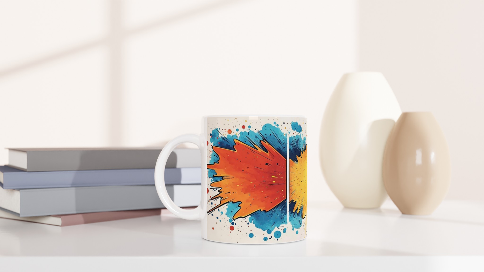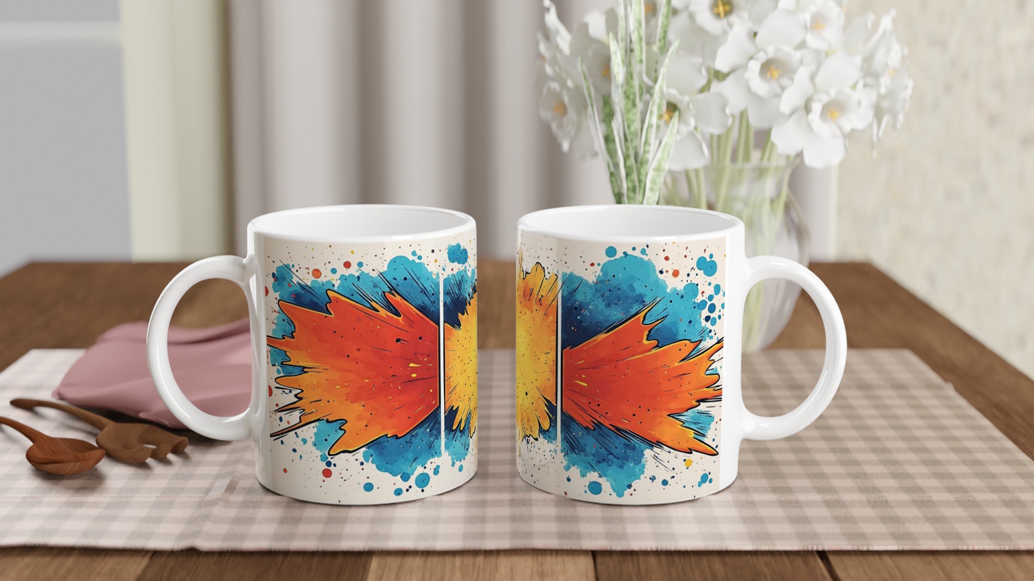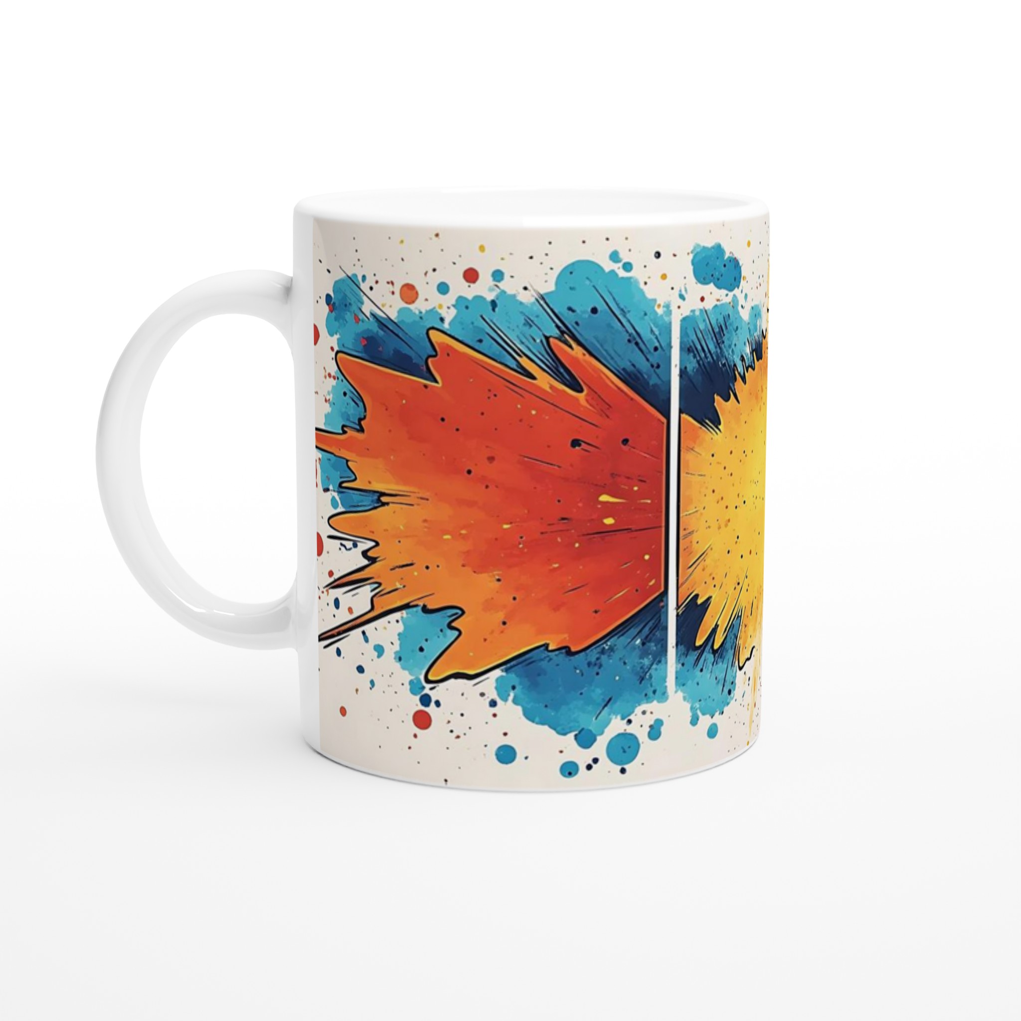 Väck dina sinnen varje morgon med denna livfulla keramiska mugg, inspirerad av en explosion av färg och glädje. De dynamiska penseldragen i energiska nyanser av orange, gult och blått mot den krispiga vita bakgrunden gör varje klunk till en liten konstupplevelse. Denna stilrena mugg blir snabbt en vardagsfavorit – perfekt för morgonkaffet, kvällens varma choklad eller när du bara vill njuta av en kopp te.
