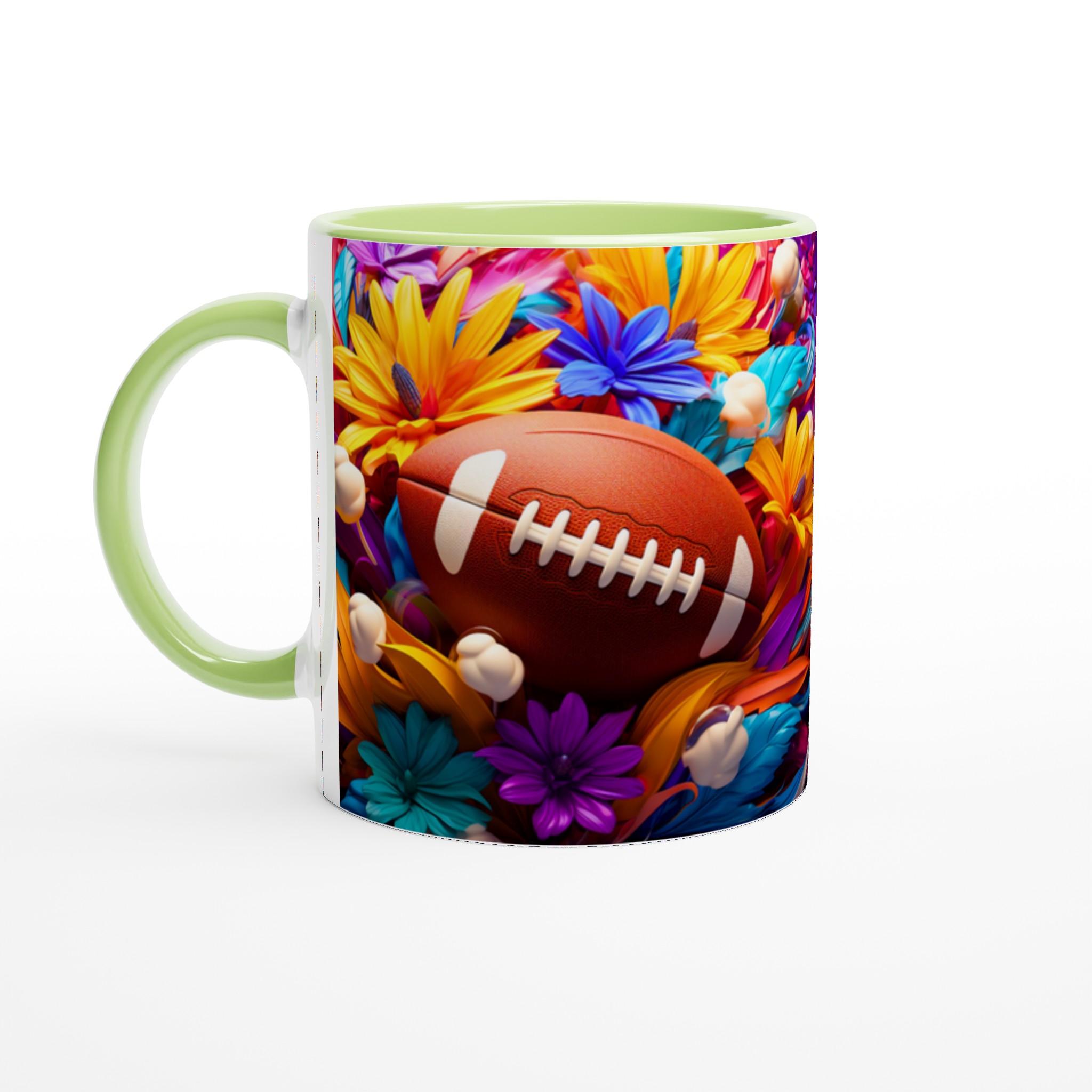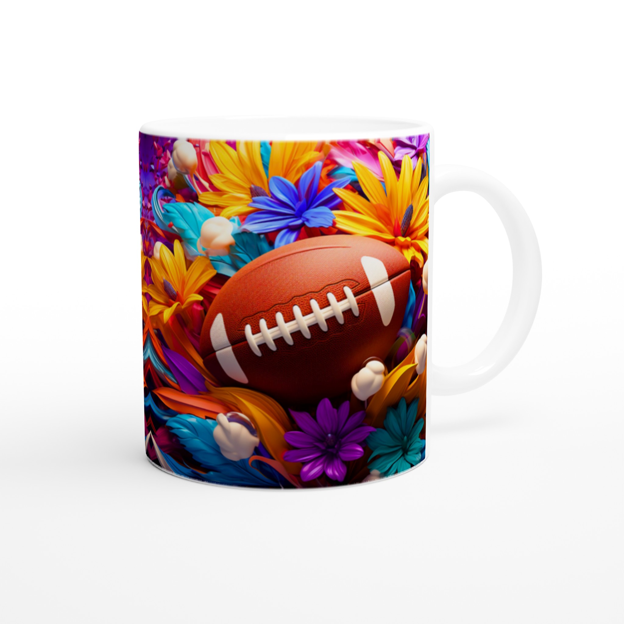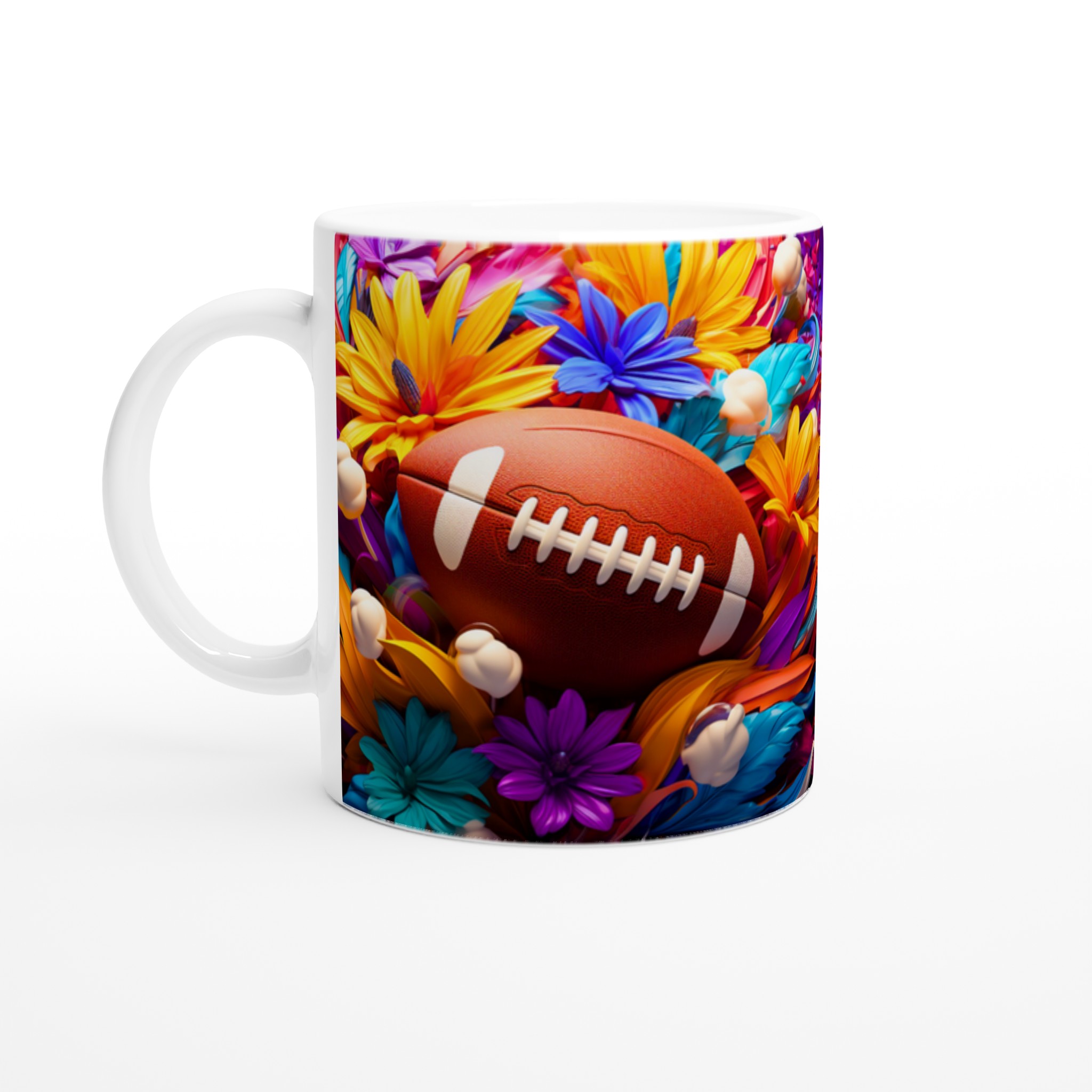Den här stilrena keramiska muggen blir snabbt en vardagsfavorit, som förvandlar varje sip till en färgsprakande upplevelse. Med ett unikt motiv av amerikansk fotboll omgiven av en explosion av livfulla blommor, är den perfekt för morgonkaffet, kvällens varma choklad eller när du bara vill njuta av en kopp te. Den blanka vita ytan gör att trycken framhävs med klara och levande färger, som håller sig fina även efter många turer i mikron och diskmaskinen.