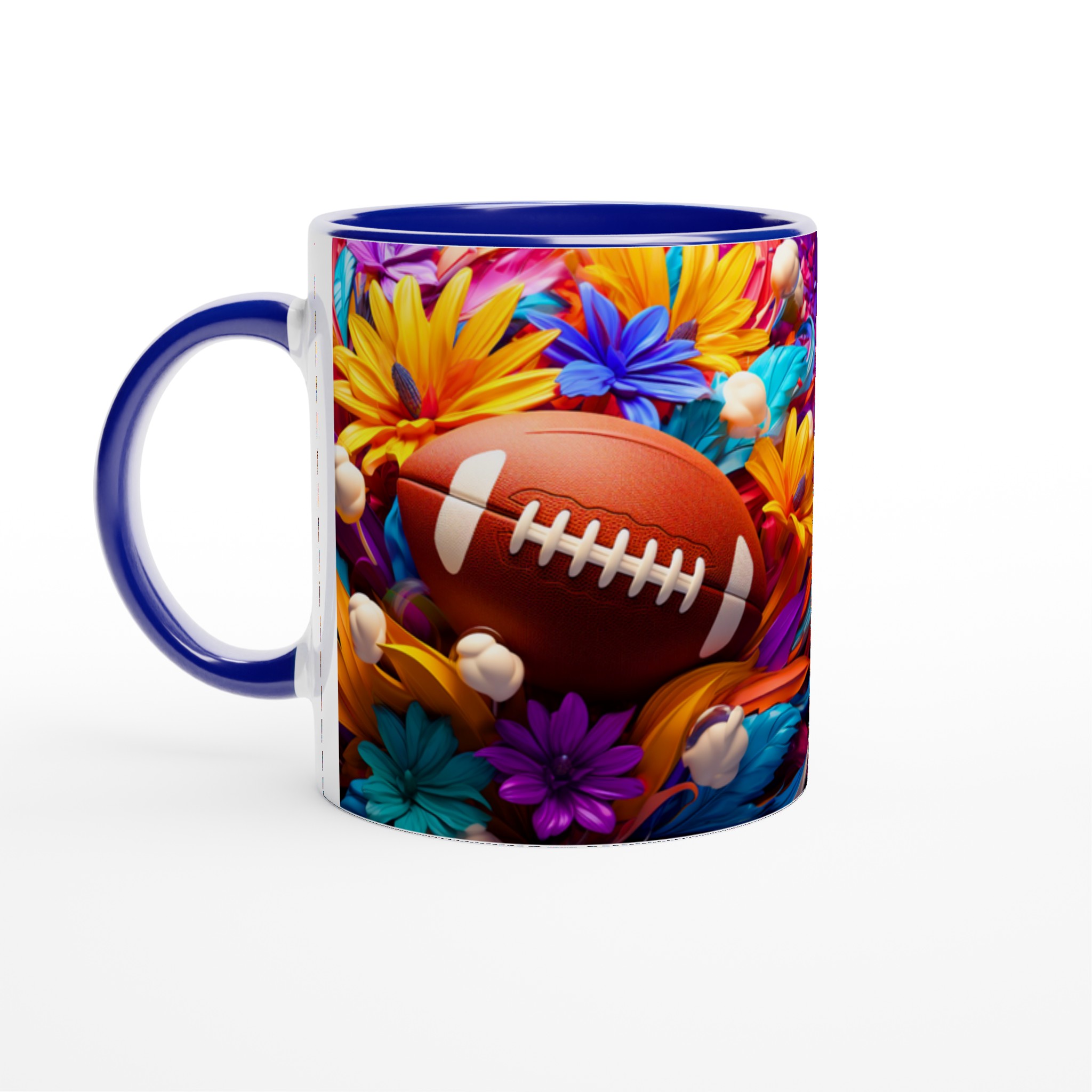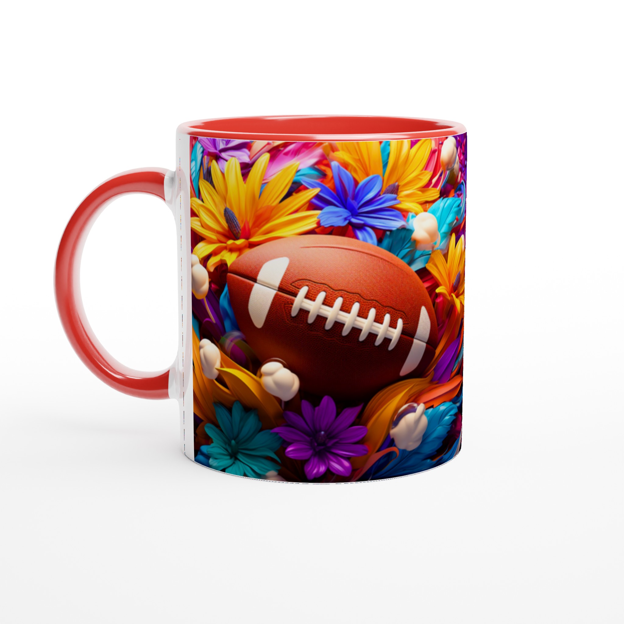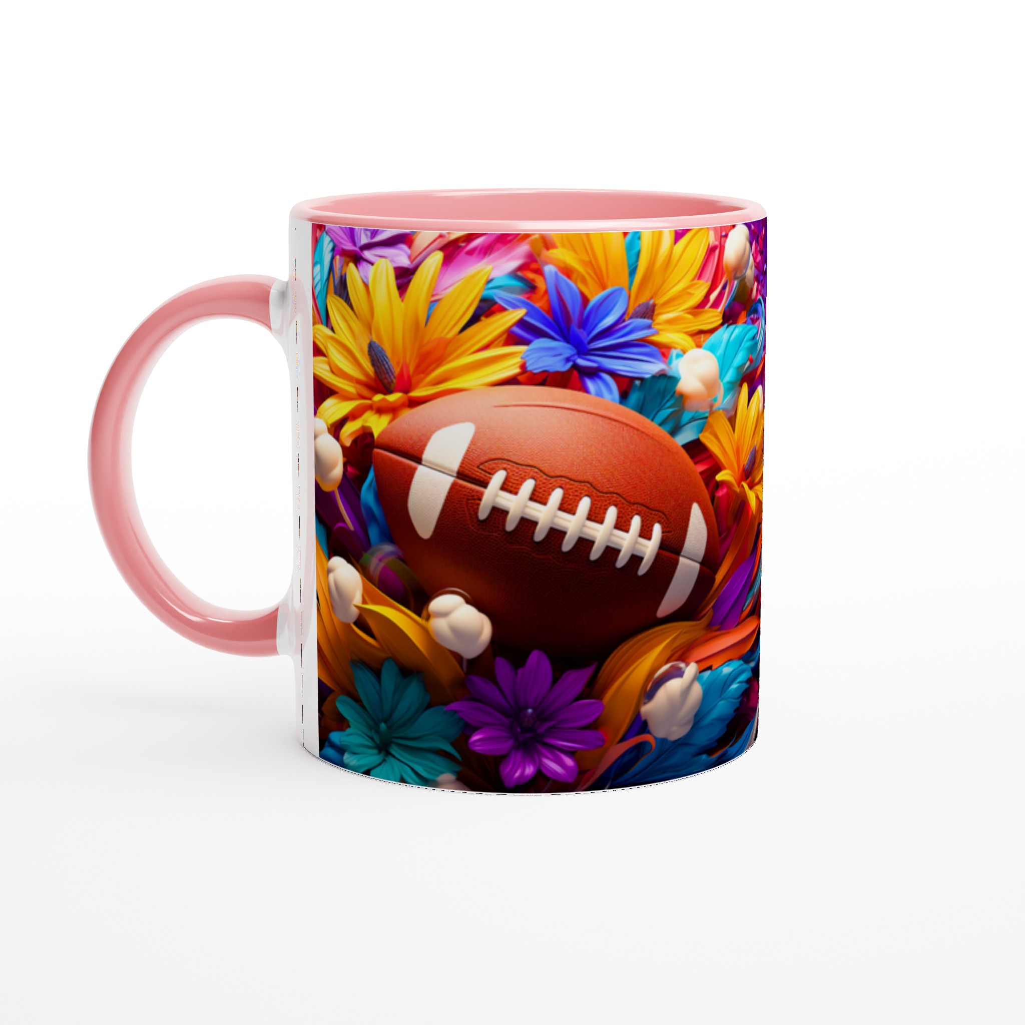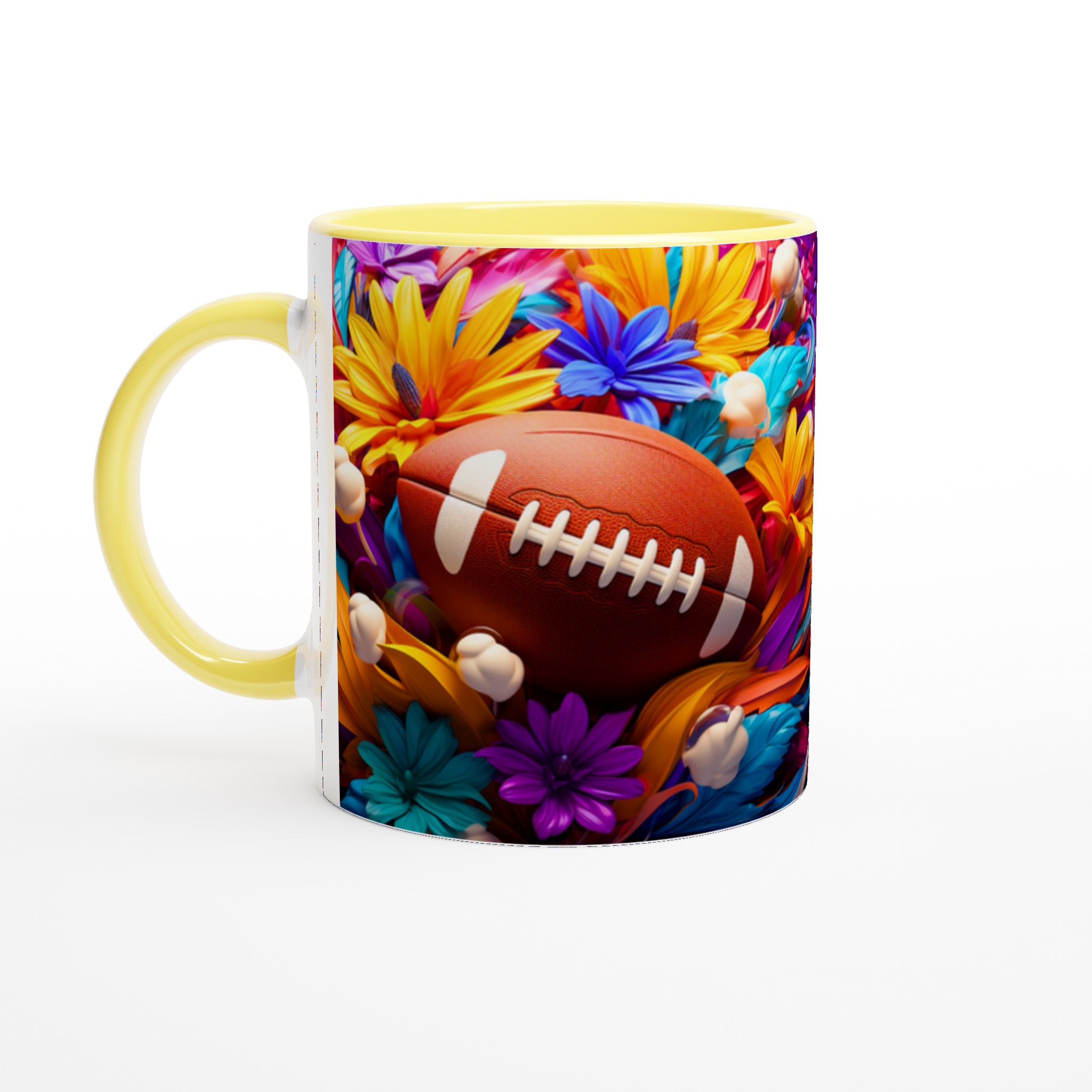Den här stilrena keramiska muggen blir snabbt en vardagsfavorit, som förvandlar varje sip till en färgsprakande upplevelse. Med ett unikt motiv av amerikansk fotboll omgiven av en explosion av livfulla blommor, är den perfekt för morgonkaffet, kvällens varma choklad eller när du bara vill njuta av en kopp te. Den blanka vita ytan gör att trycken framhävs med klara och levande färger, som håller sig fina även efter många turer i mikron och diskmaskinen.