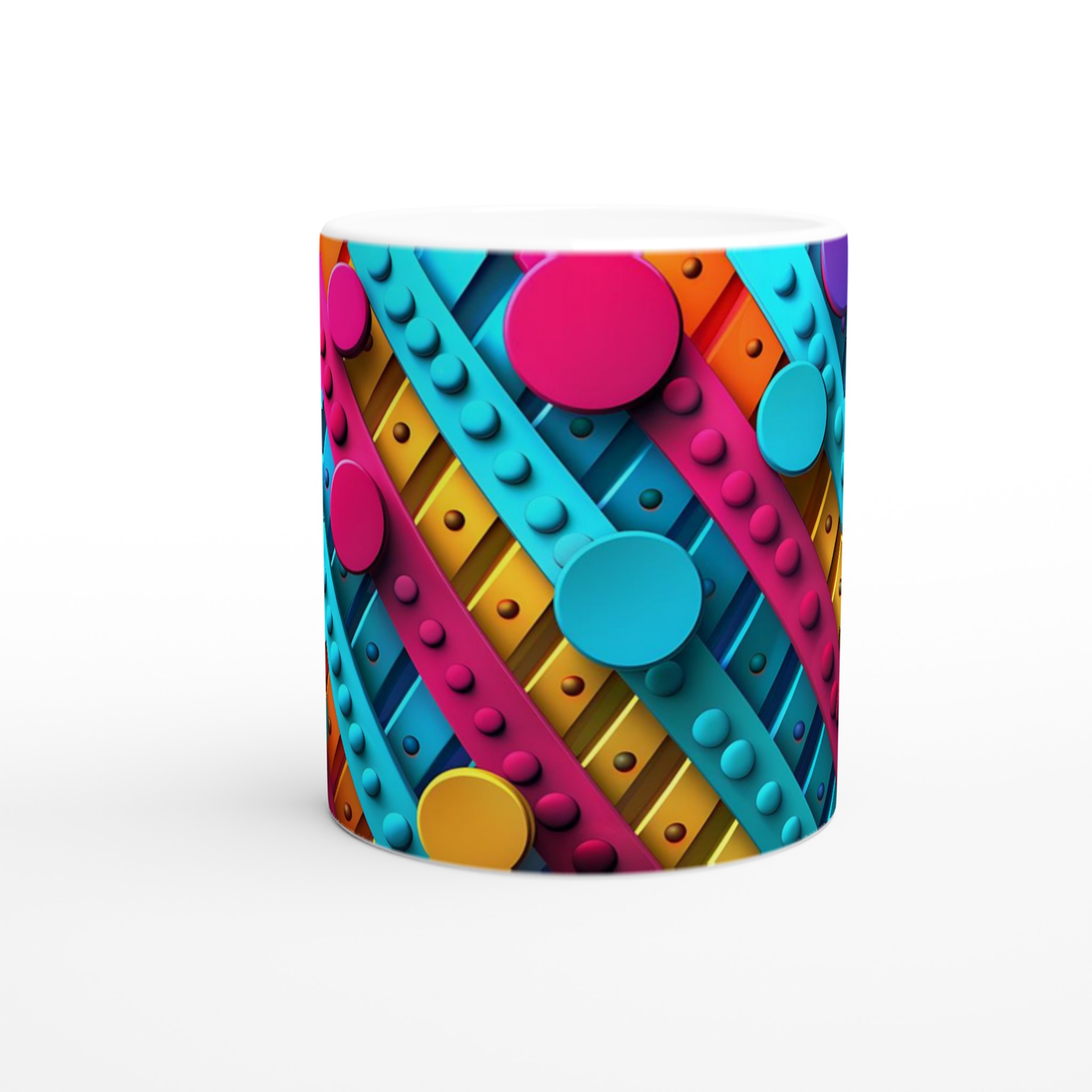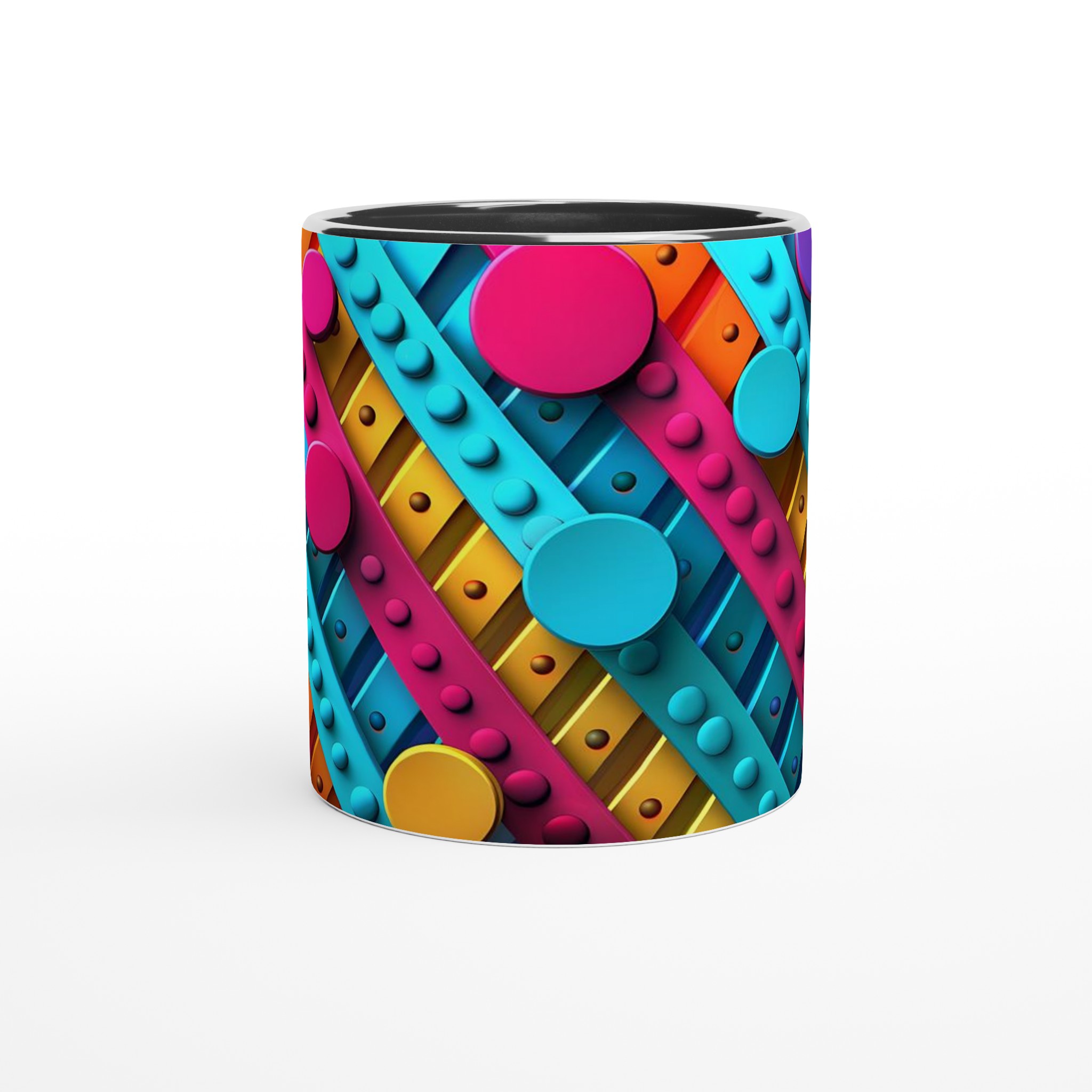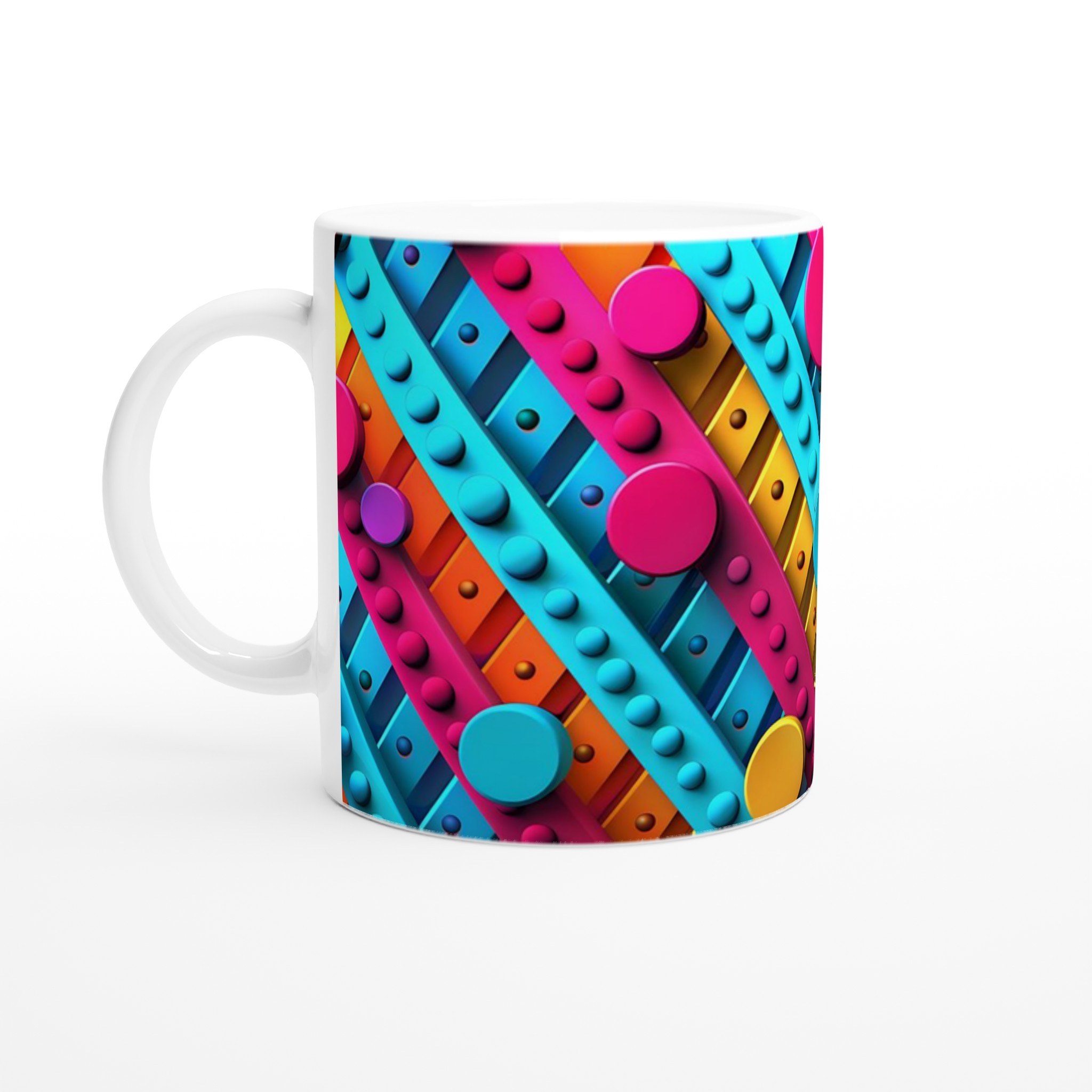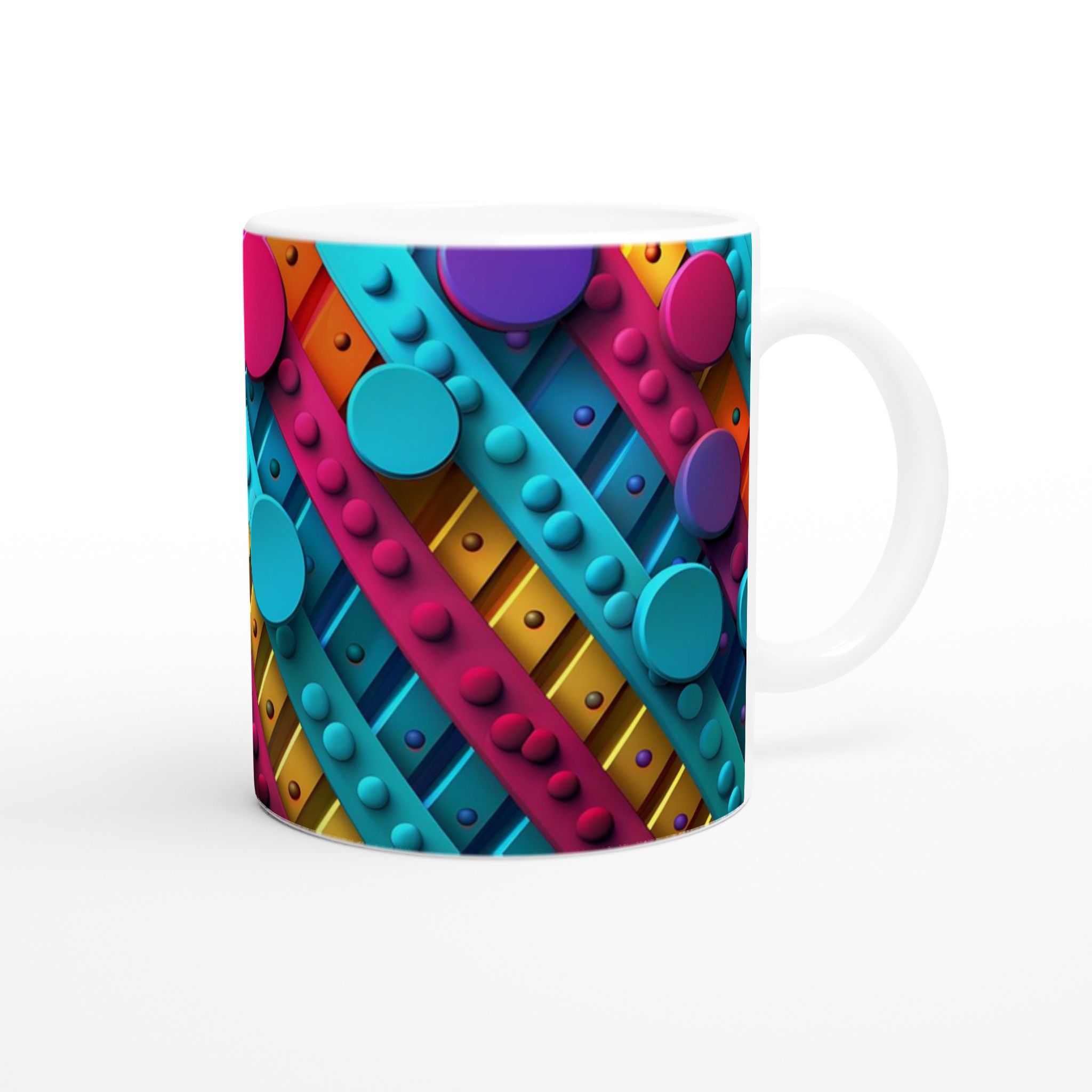 Väck dina sinnen varje morgon med denna stilrena och vackra keramikmugg, prydd med ett lekfullt abstrakt mönster i livfulla färger som piggar upp vilken stund som helst – oavsett om det är morgonkaffet, en värmande kopp te eller en härlig varm choklad. Den blanka ytan får trycket att framträda klart och färgstarkt, vilket gör muggen till en riktig favorit i vardagen. Tack vare den höga kvaliteten behåller trycket sin lyster även efter många omgångar i både mikrovågsugn och diskmaskin.