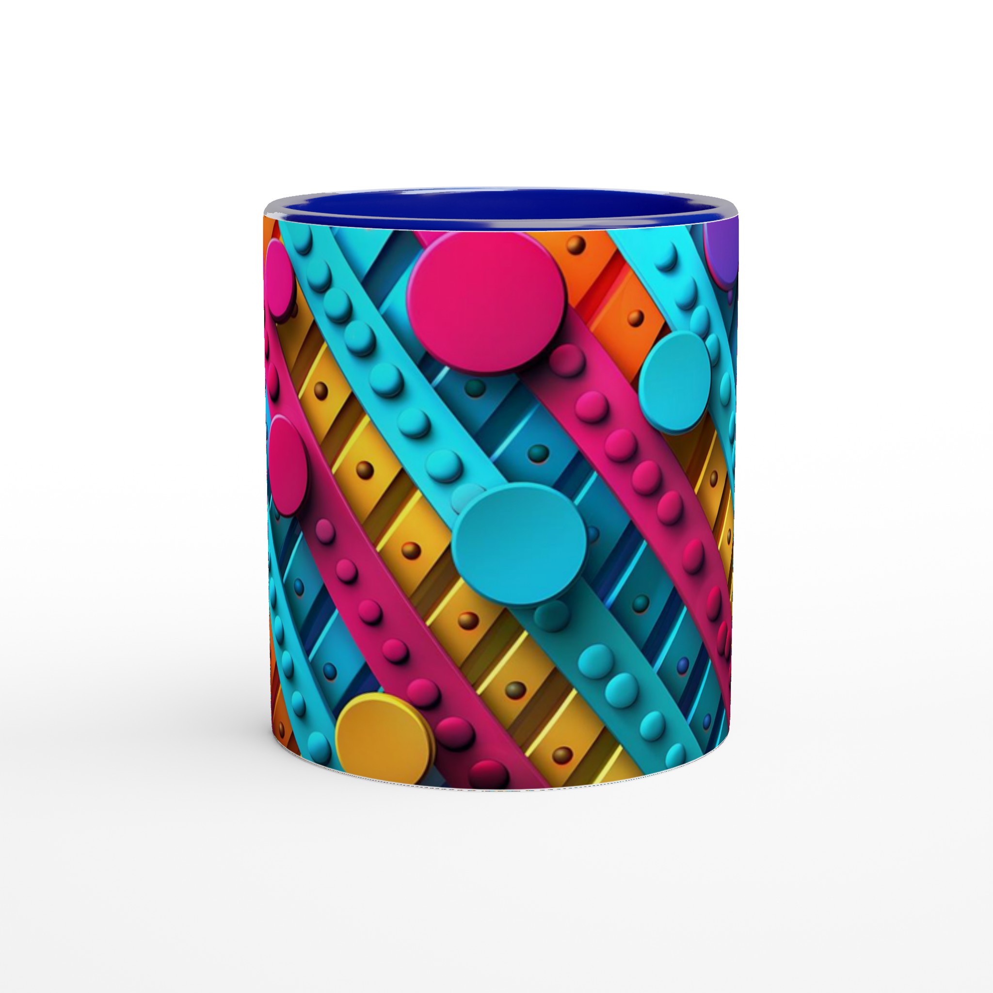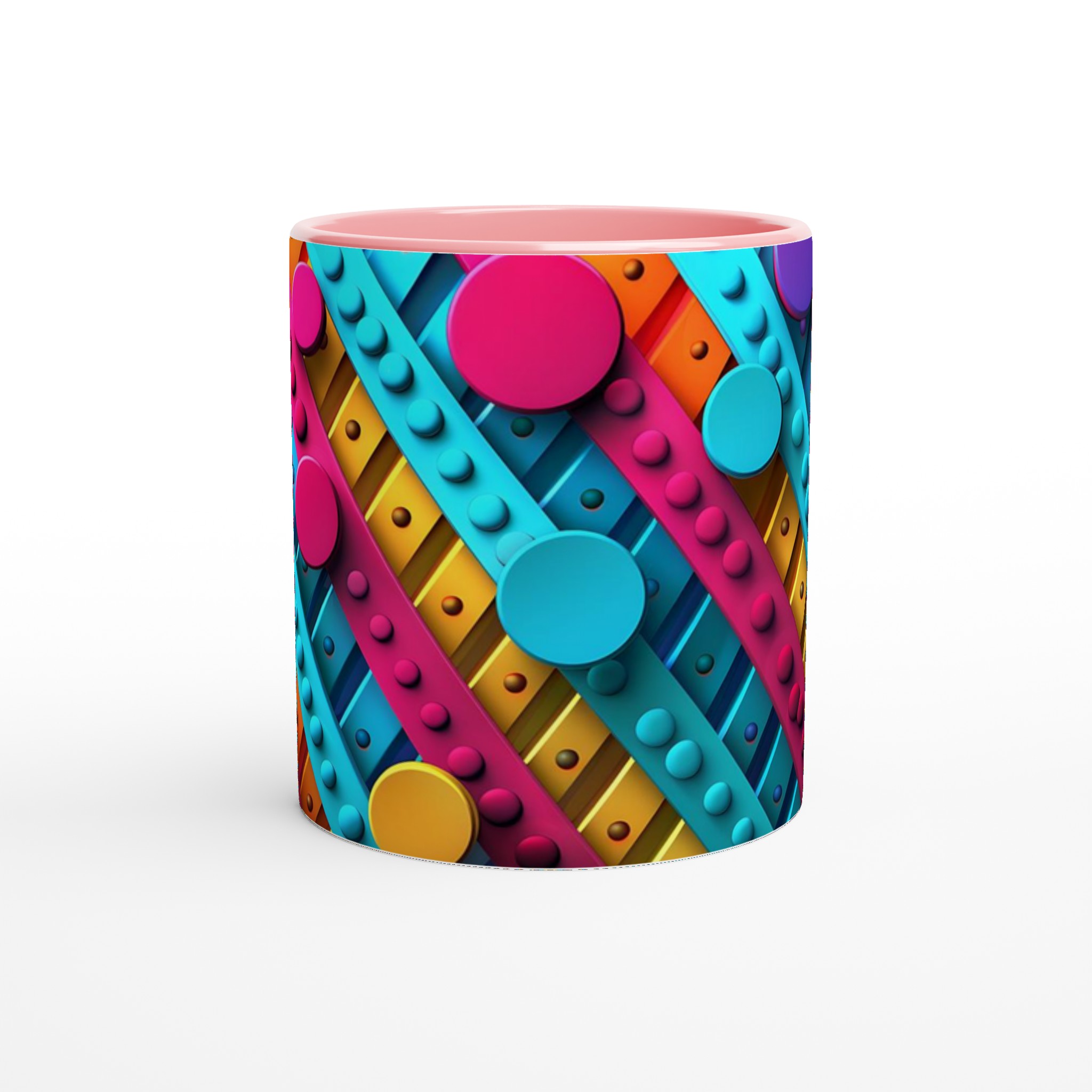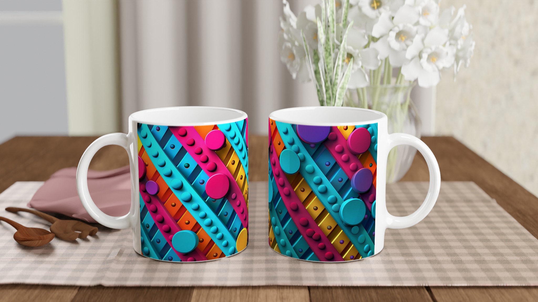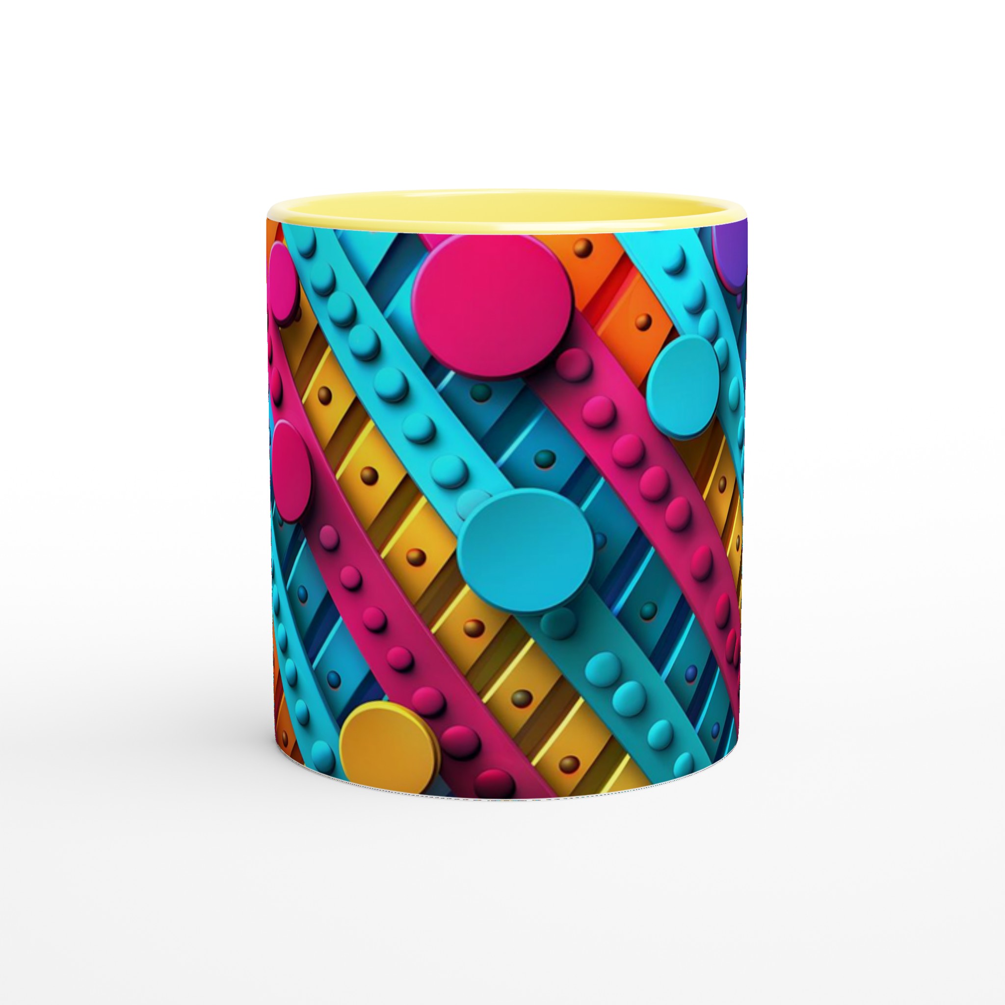 Väck dina sinnen varje morgon med denna stilrena och vackra keramikmugg, prydd med ett lekfullt abstrakt mönster i livfulla färger som piggar upp vilken stund som helst – oavsett om det är morgonkaffet, en värmande kopp te eller en härlig varm choklad. Den blanka ytan får trycket att framträda klart och färgstarkt, vilket gör muggen till en riktig favorit i vardagen. Tack vare den höga kvaliteten behåller trycket sin lyster även efter många omgångar i både mikrovågsugn och diskmaskin.