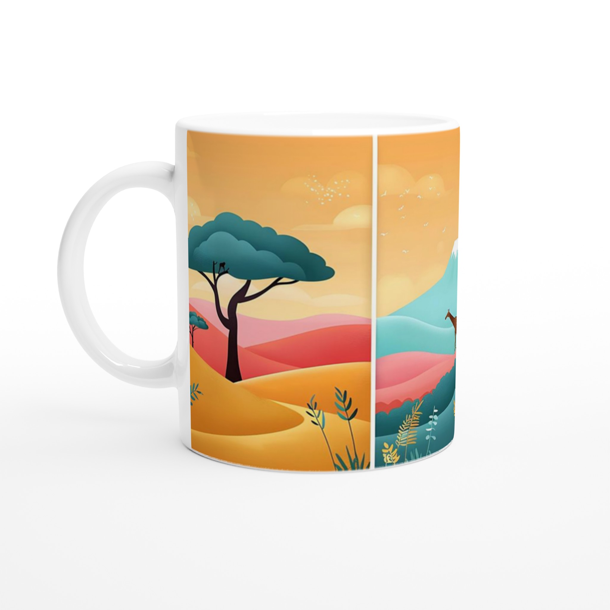 Lyft varje kaffestund med vår premium keramikmugg – stilren, hållbar och skapad för att låta ditt motiv glänsa. Denna unika mugg bjuder in till en fantasifull resa genom en afrikansk safari med sin lekfulla och färgstarka design. De mjuka pastelltonerna och de charmiga illustrationerna av giraffer och akaciaträd skapar en varm och inbjudande känsla, perfekt för att starta dagen med ett leende eller för att drömma dig bort under en fikapaus.