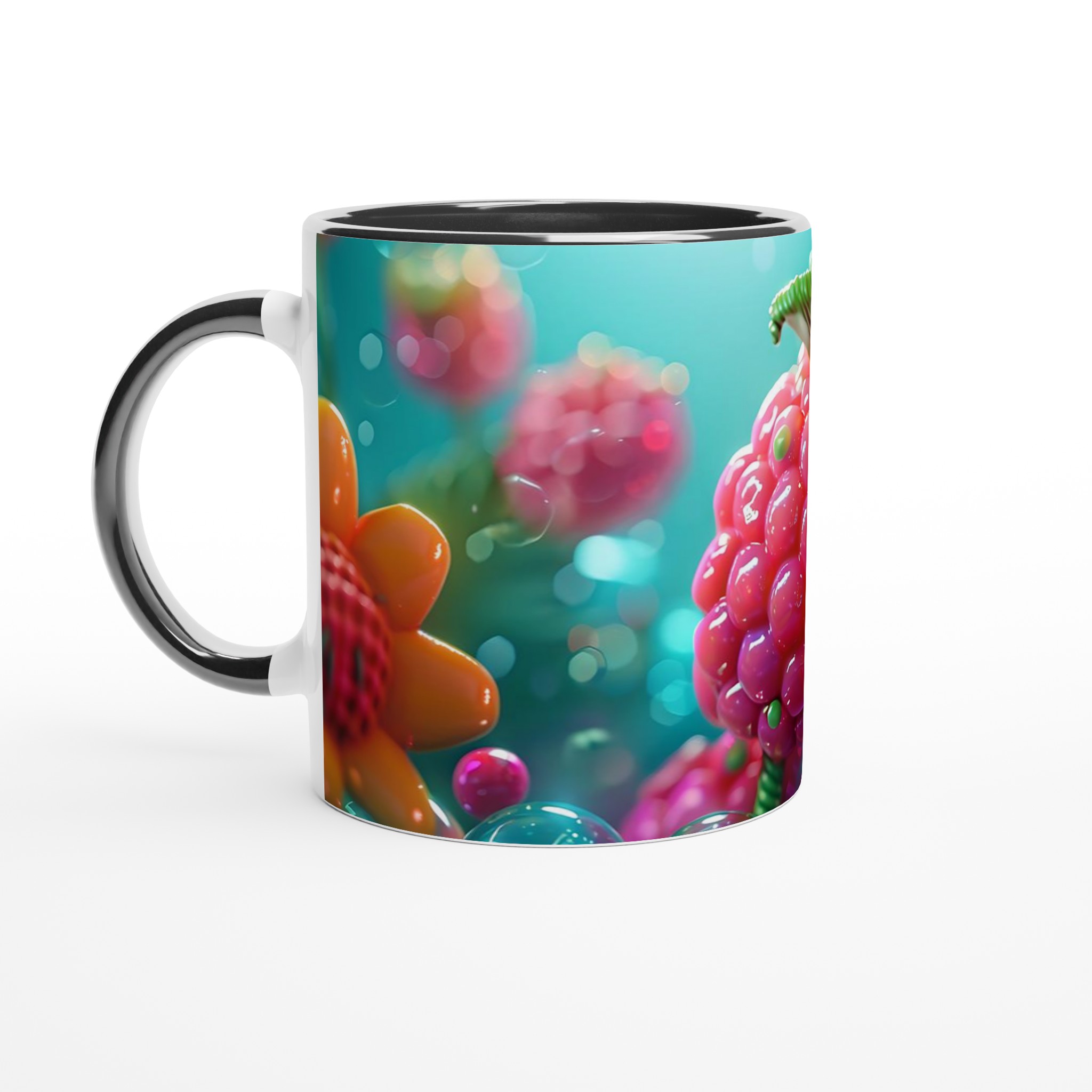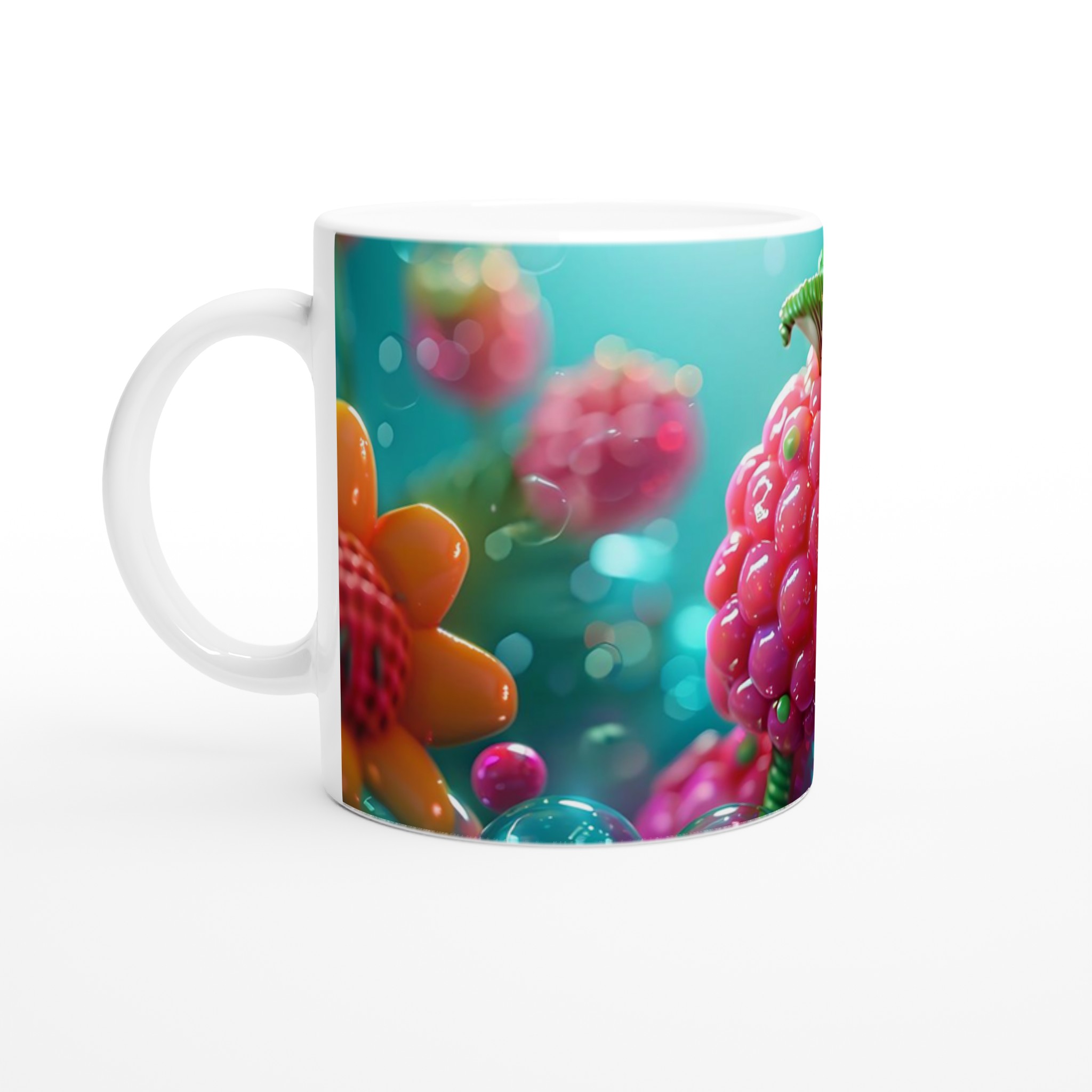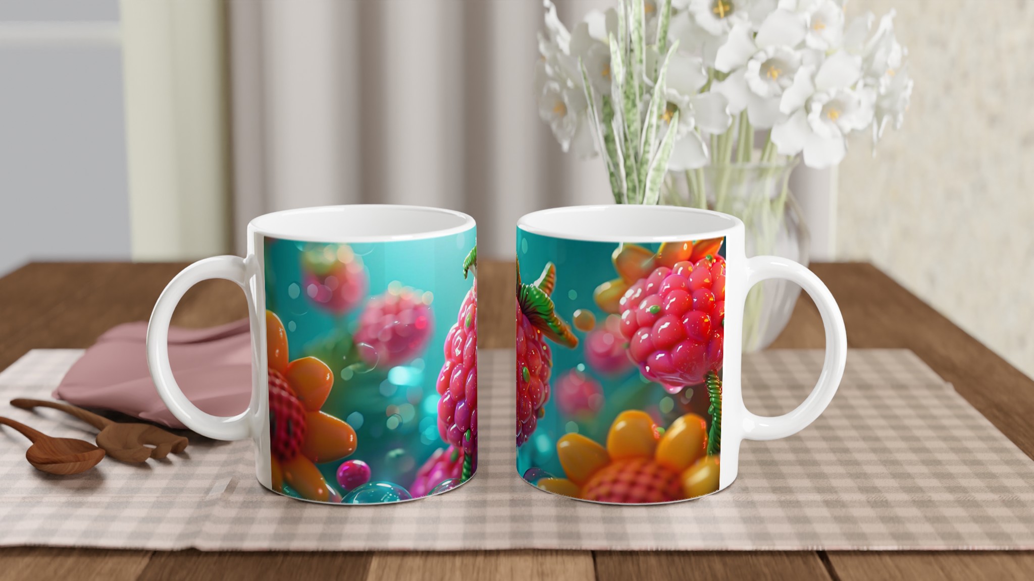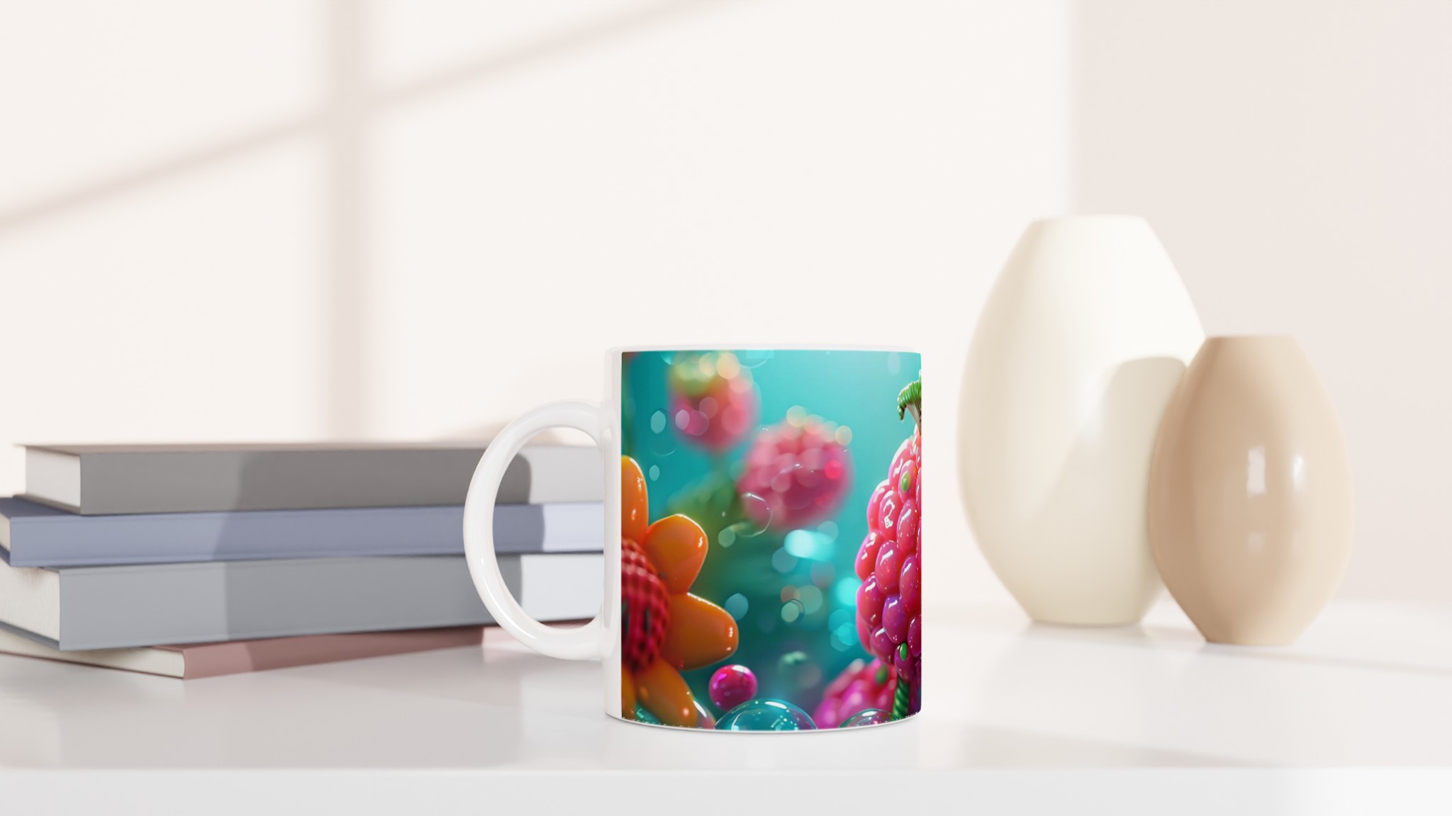 Sätt lite extra färg på din vardag med denna lekfulla keramiska mugg. Inspirerad av bilden, där glänsande, bubbliga ”bär” i klara nyanser av hallonrosa och gult poppar mot en turkos bakgrund, blir denna mugg snabbt en favorit för dem som älskar det lilla extra. Perfekt för morgonkaffet, kvällens varma choklad eller när du bara vill njuta av en kopp te – varje klunk blir en fest för sinnena. Den blanka ytan framhäver trycken med klara och levande färger, som håller sig fina även efter många turer i mikron och diskmaskinen.