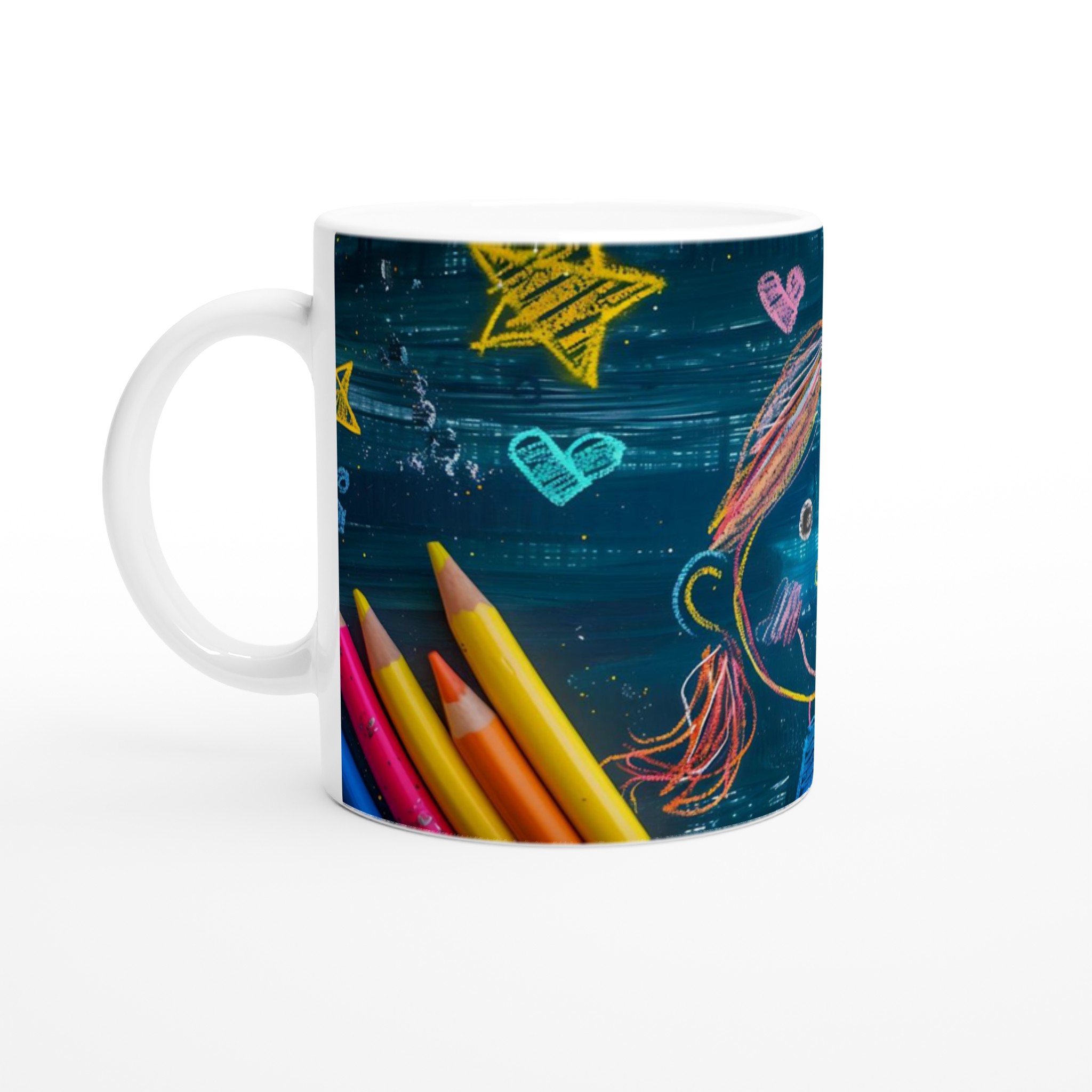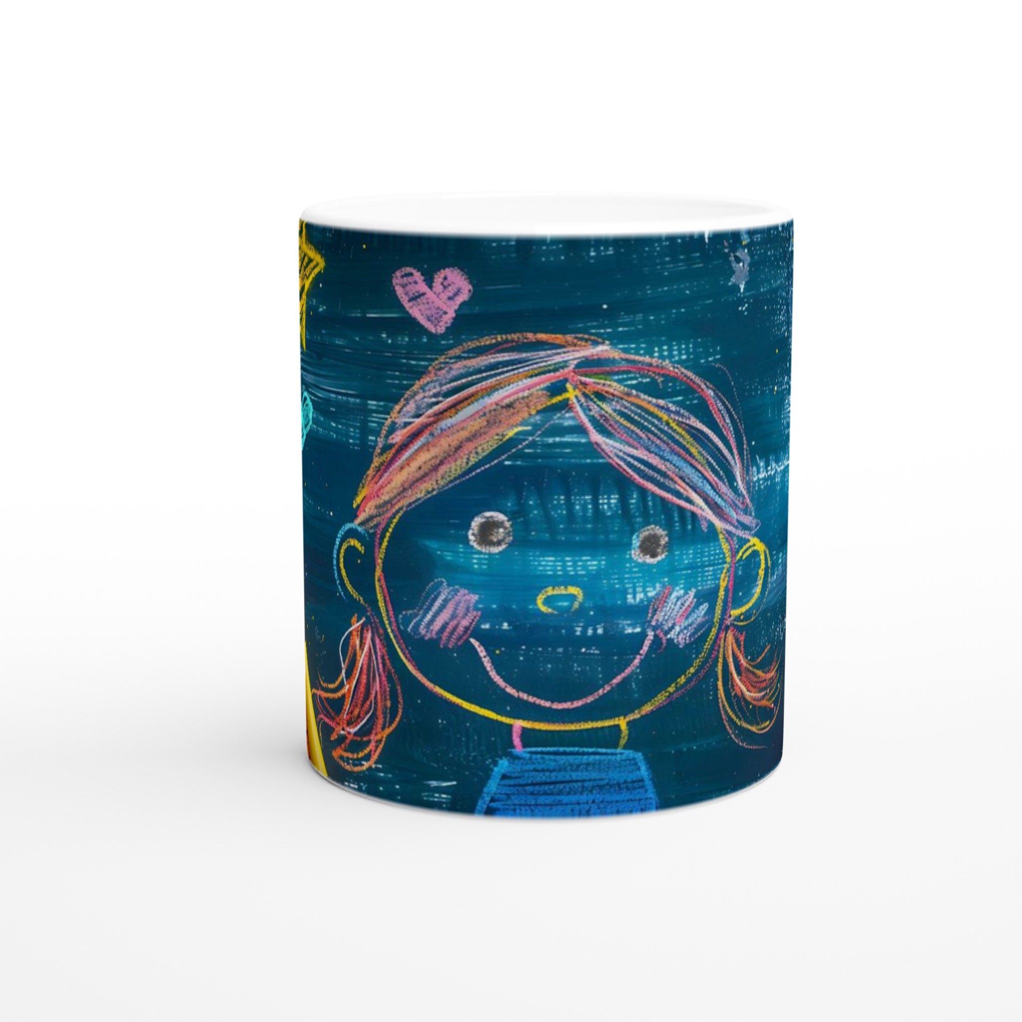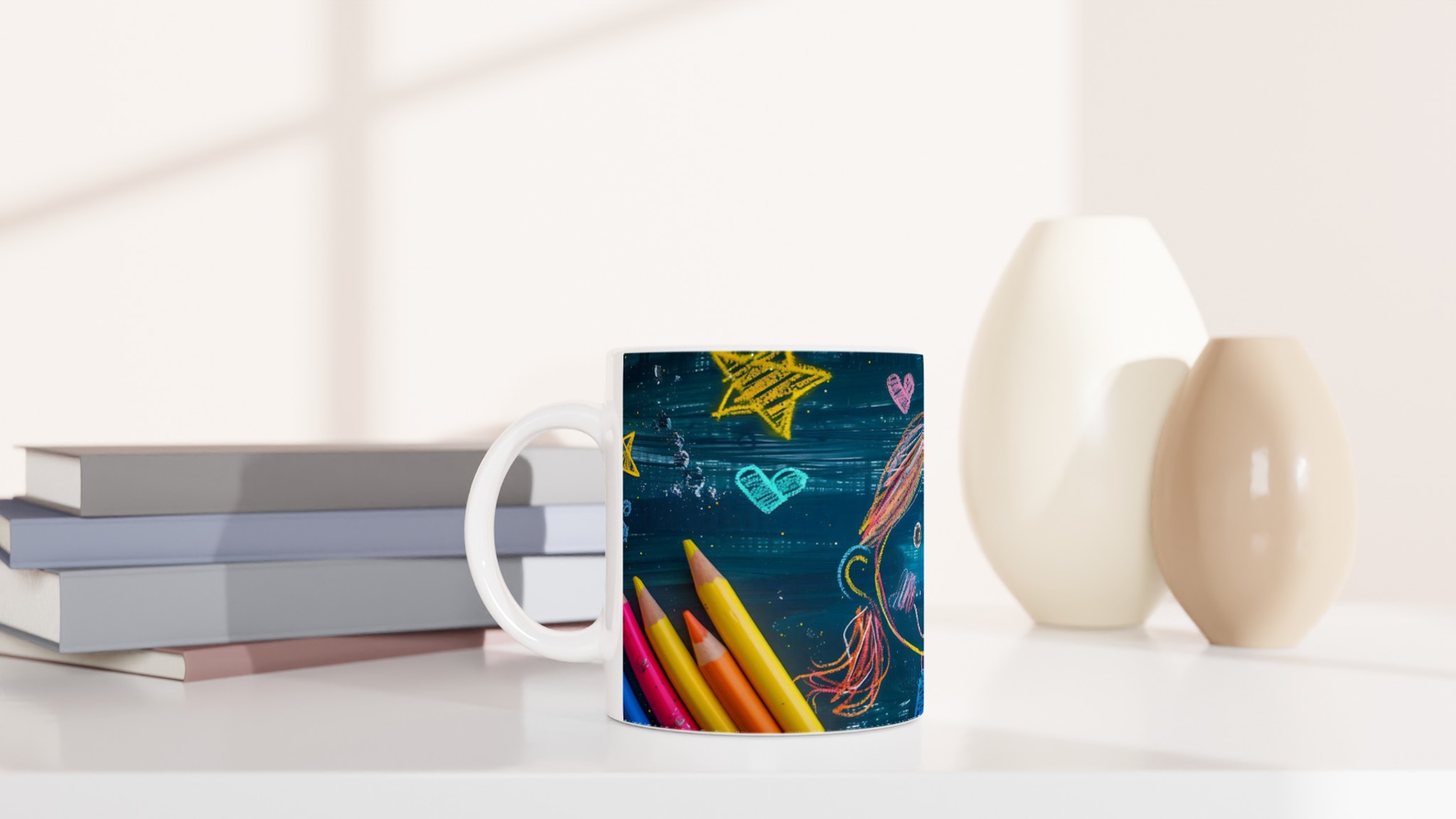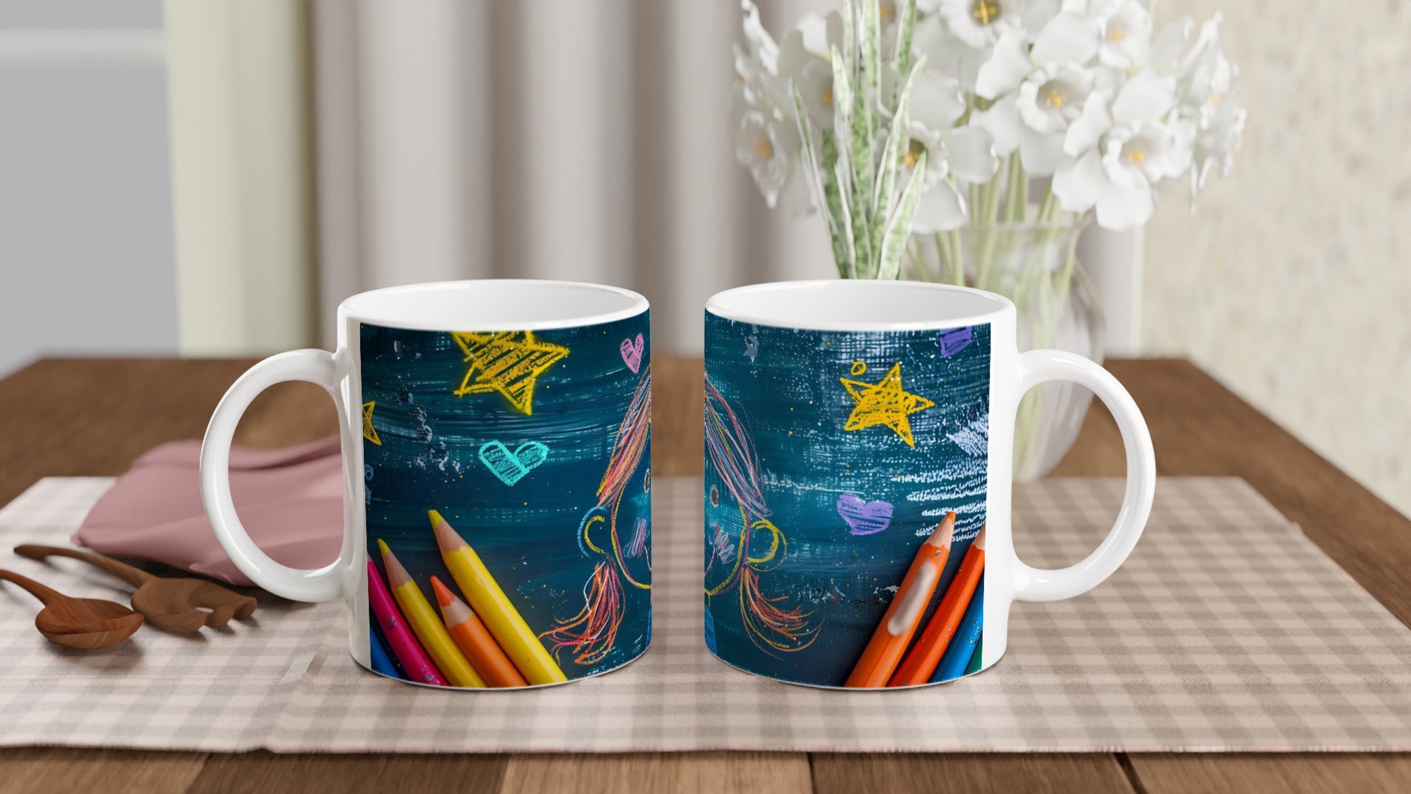 Väck ditt inre barn med denna charmiga keramiska mugg, som blir en omedelbar vardagsfavorit! Föreställ dig den glada energin från handritade stjärnor, hjärtan och en söt barnfigur som lyser upp din morgon. Perfekt för morgonkaffet, kvällens varma choklad eller när du bara vill njuta av en kopp te i en mugg som sprider leenden.