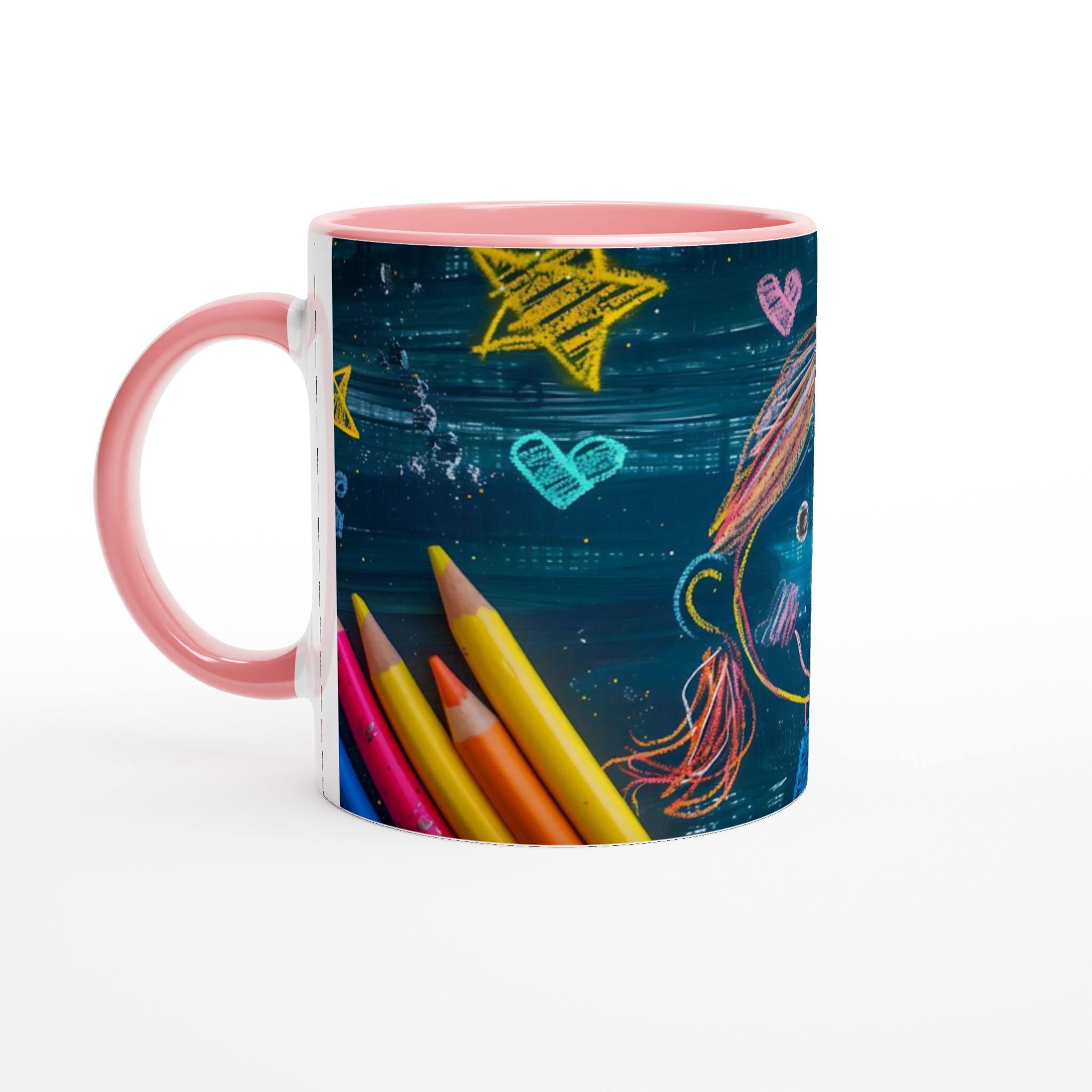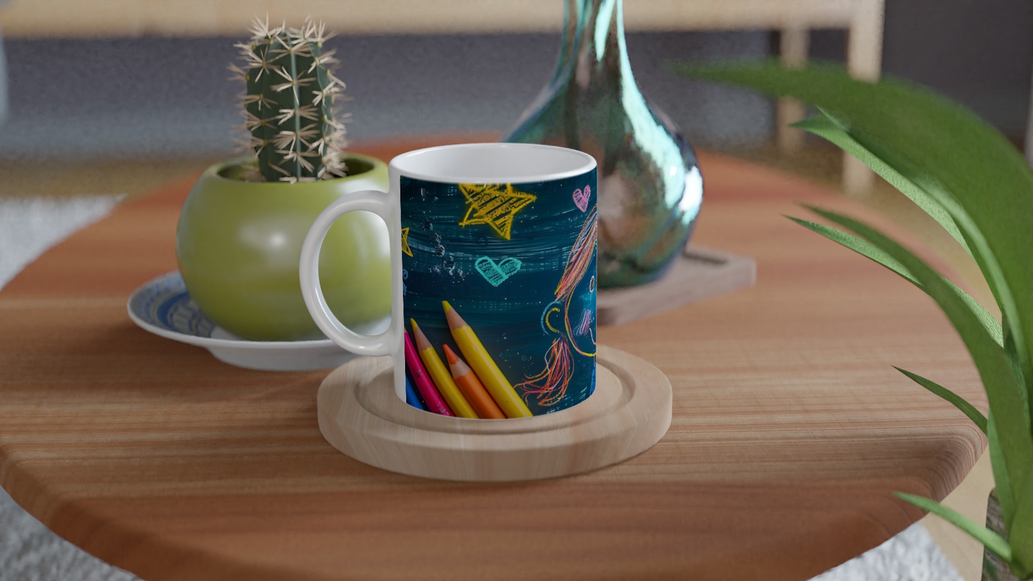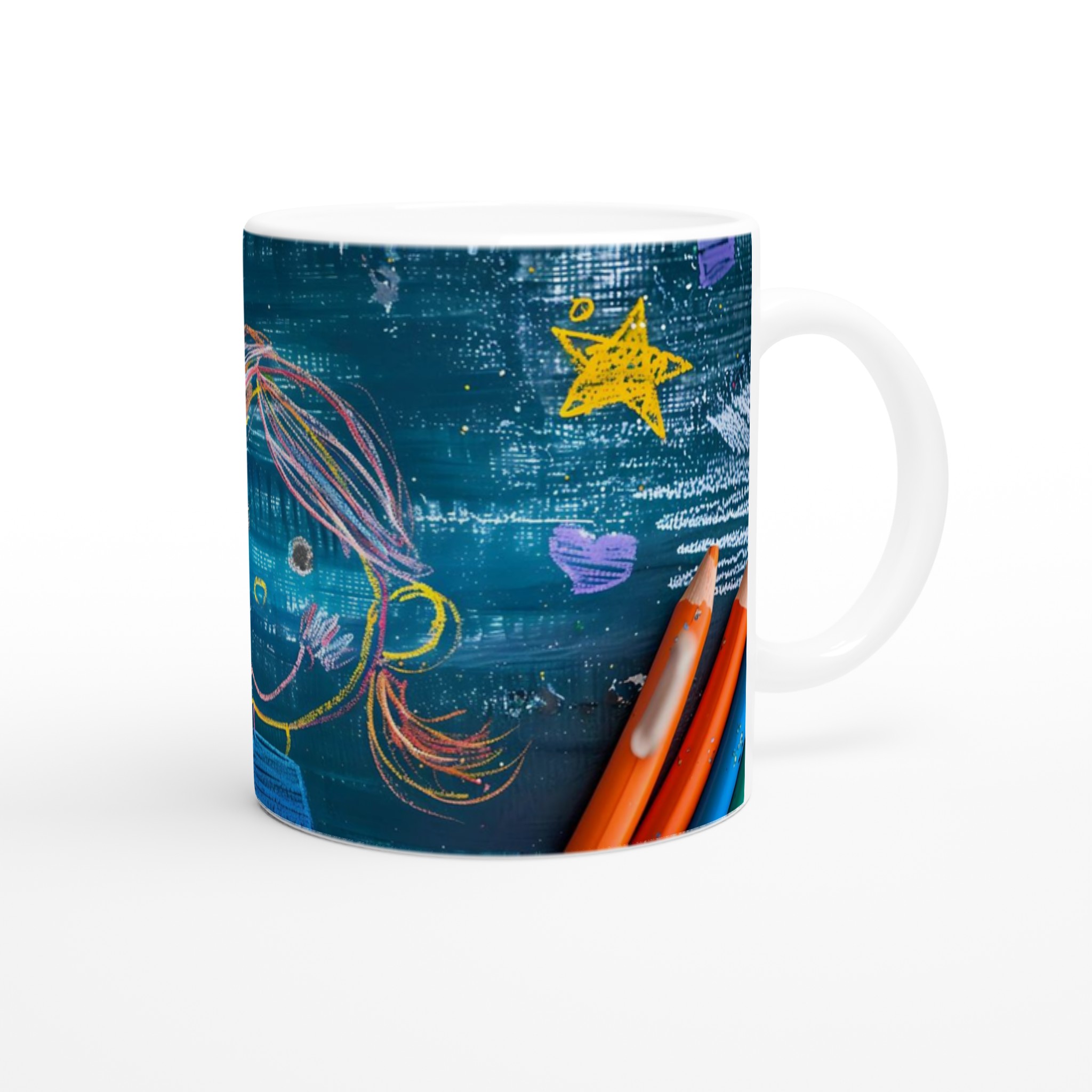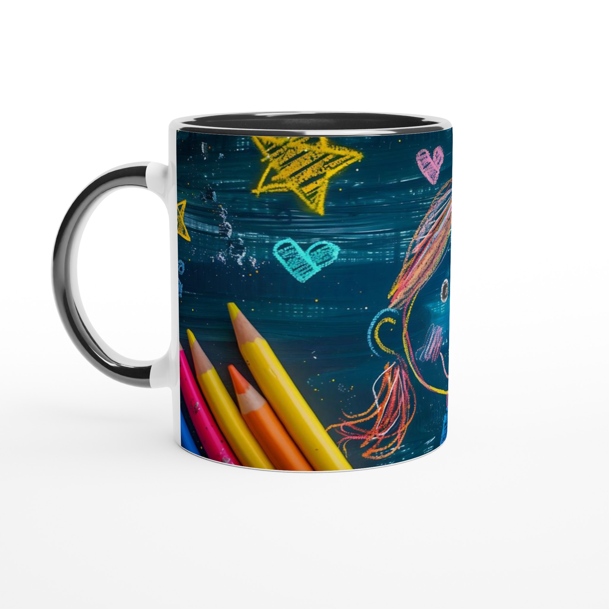 Väck ditt inre barn med denna charmiga keramiska mugg, som blir en omedelbar vardagsfavorit! Föreställ dig den glada energin från handritade stjärnor, hjärtan och en söt barnfigur som lyser upp din morgon. Perfekt för morgonkaffet, kvällens varma choklad eller när du bara vill njuta av en kopp te i en mugg som sprider leenden.