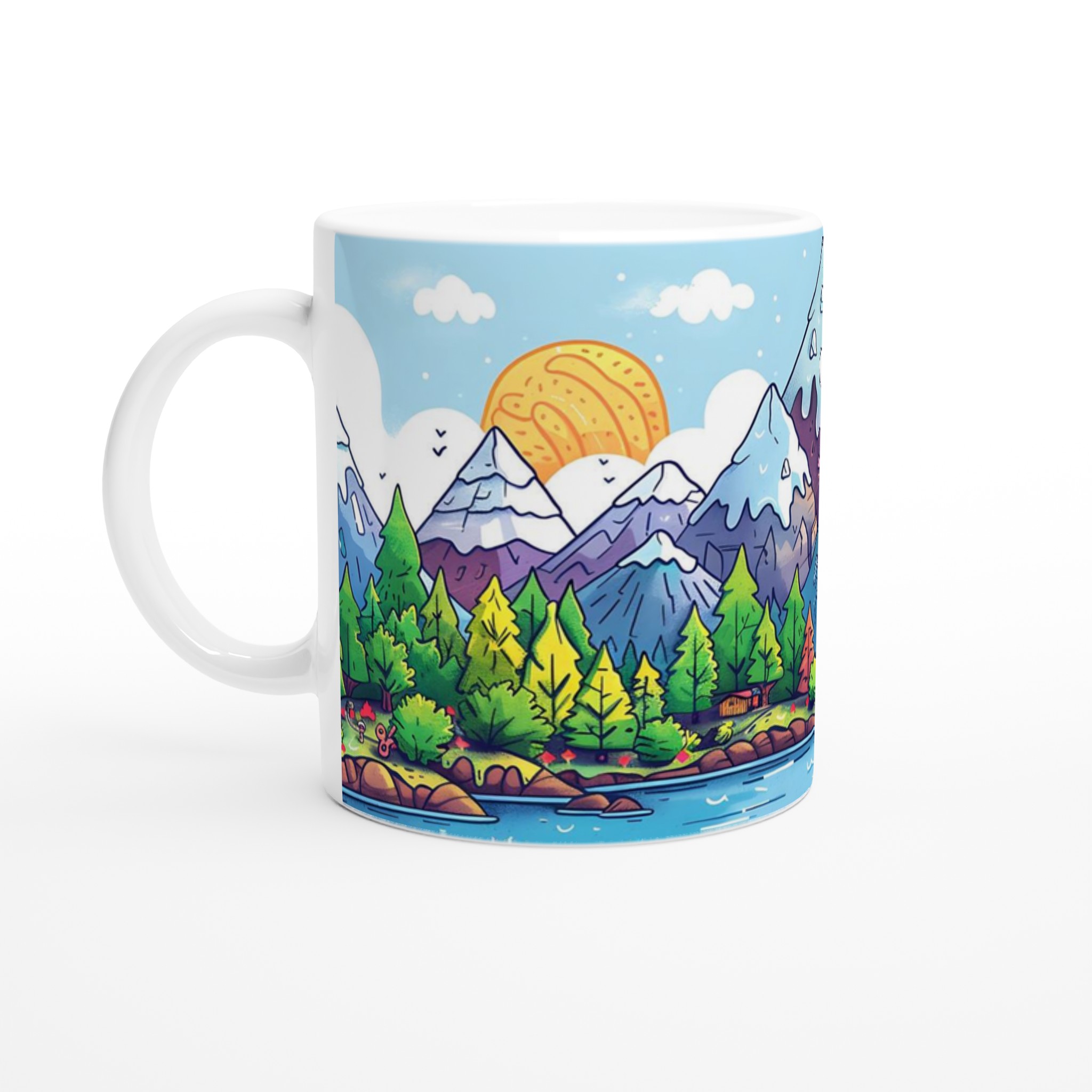 Lyft varje kaffestund med vår premium keramikmugg – stilren, hållbar och skapad för att låta ditt motiv glänsa. Inspirerad av den fridfulla skönheten hos en färgsprakande bergssjö vid solnedgången, ger denna mugg en touch av naturens lugn till din vardag. Med sin livliga design och klara färger blir den snabbt din favorit för att drömma dig bort till avlägsna bergstoppar och skogar.