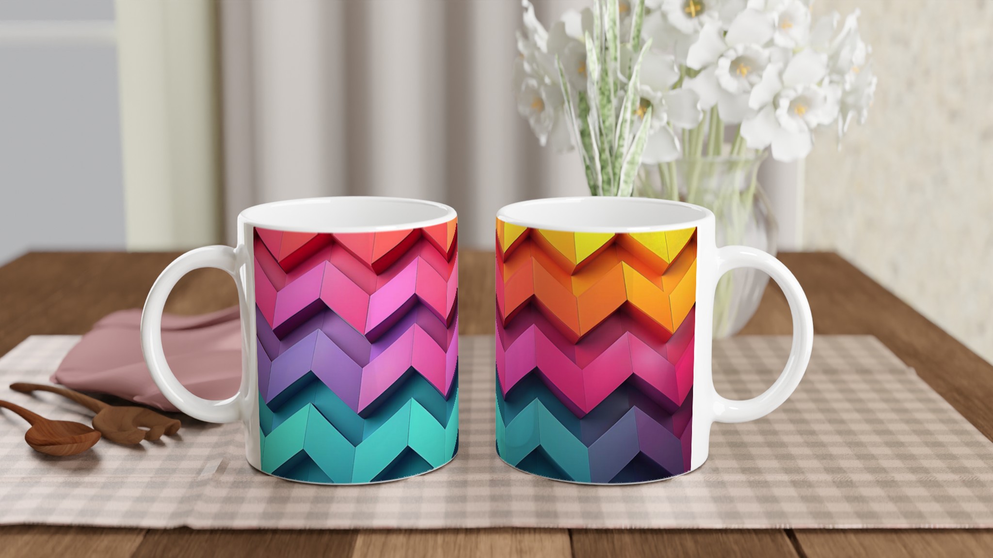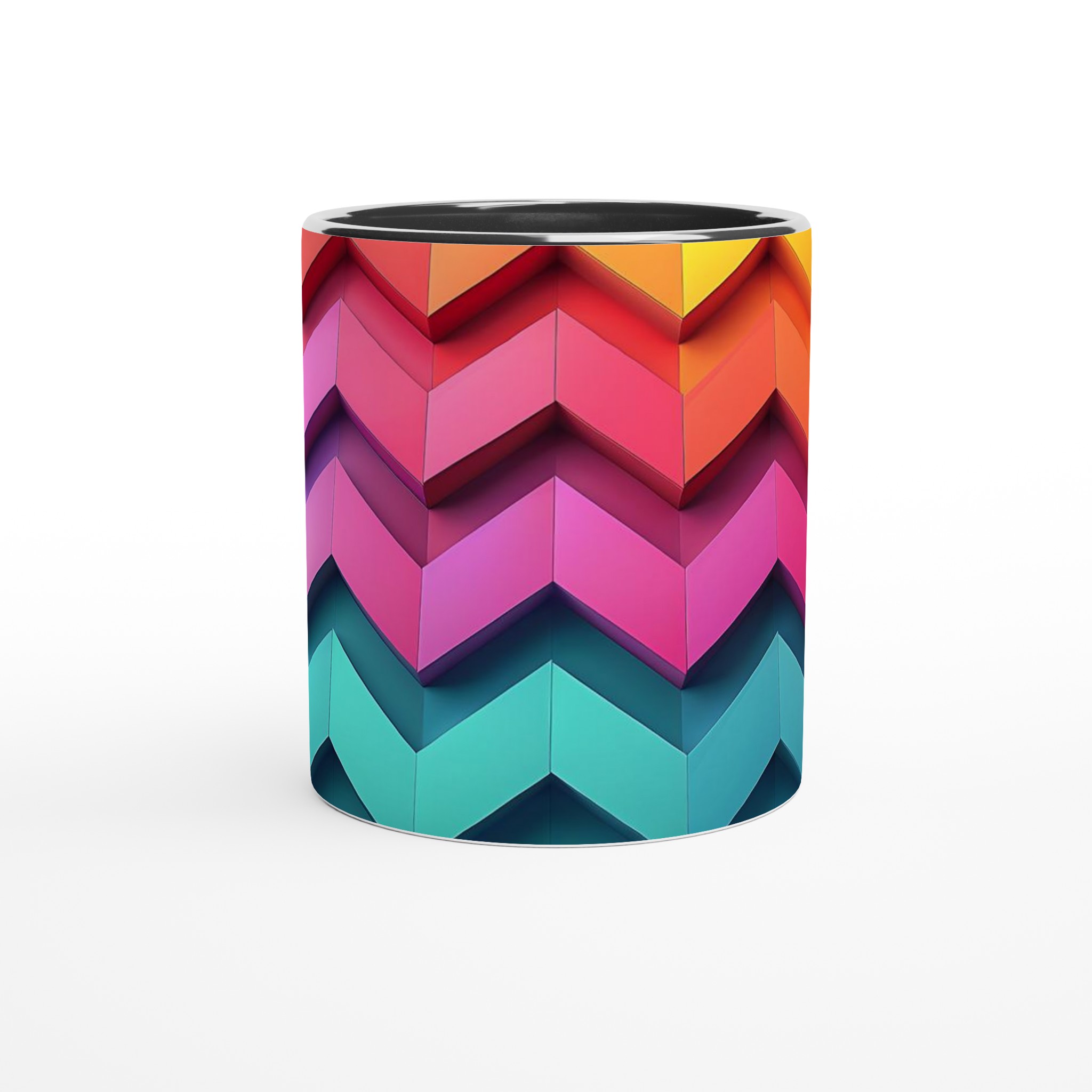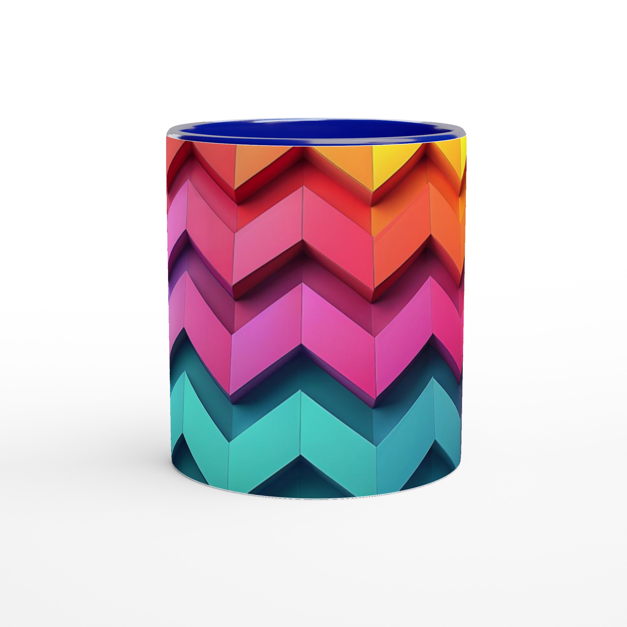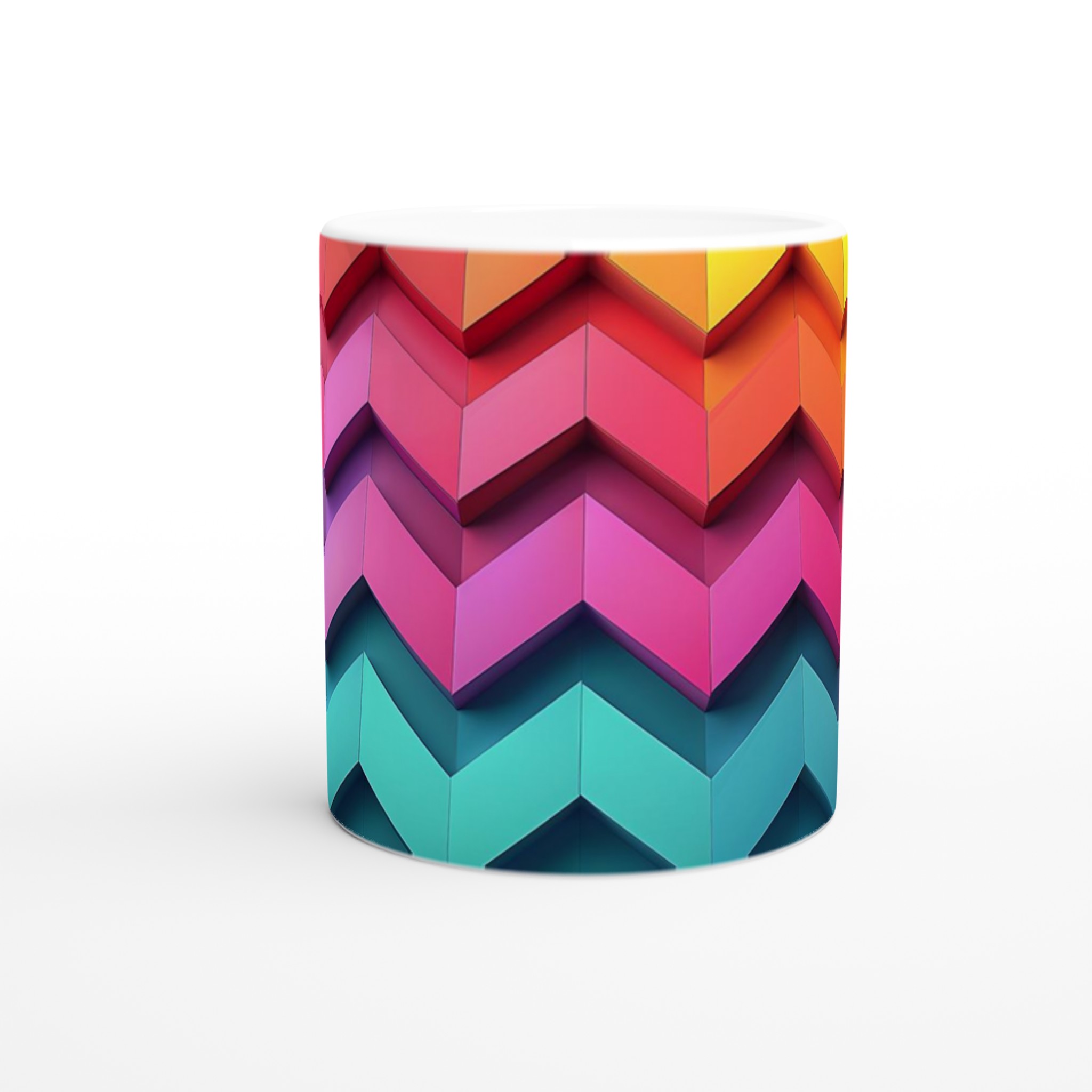 Lyft din fikapaus med vår stilrena och vackra keramiska mugg, designad för att lysa upp alla dina stunder. Oavsett om det är morgonkaffet, en värmande kopp te eller en härlig varm choklad, blir denna mugg snabbt din nya favorit. Med en yta som fångar ögat med en fantastisk chevron-design i en levande palett av regnbågsfärger, garanterar vi att varje klunk blir en fest för sinnena.