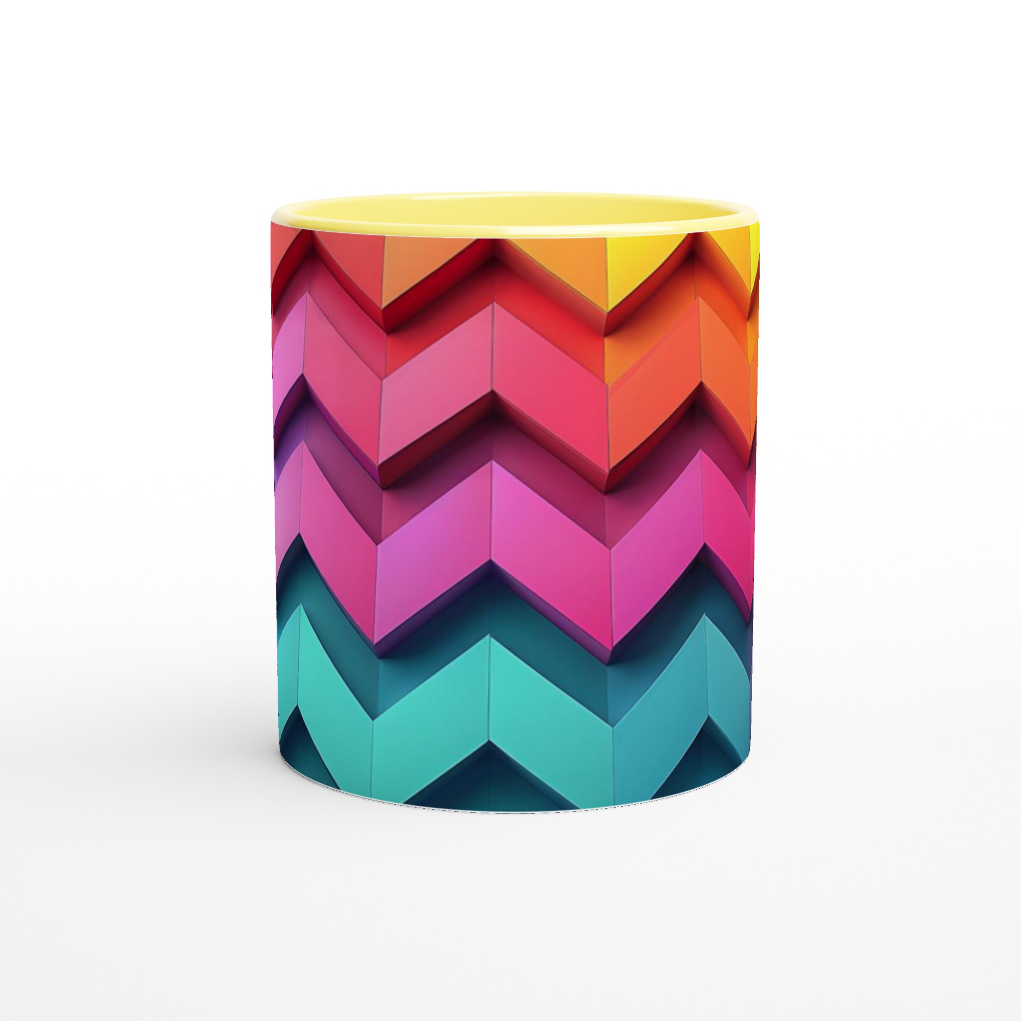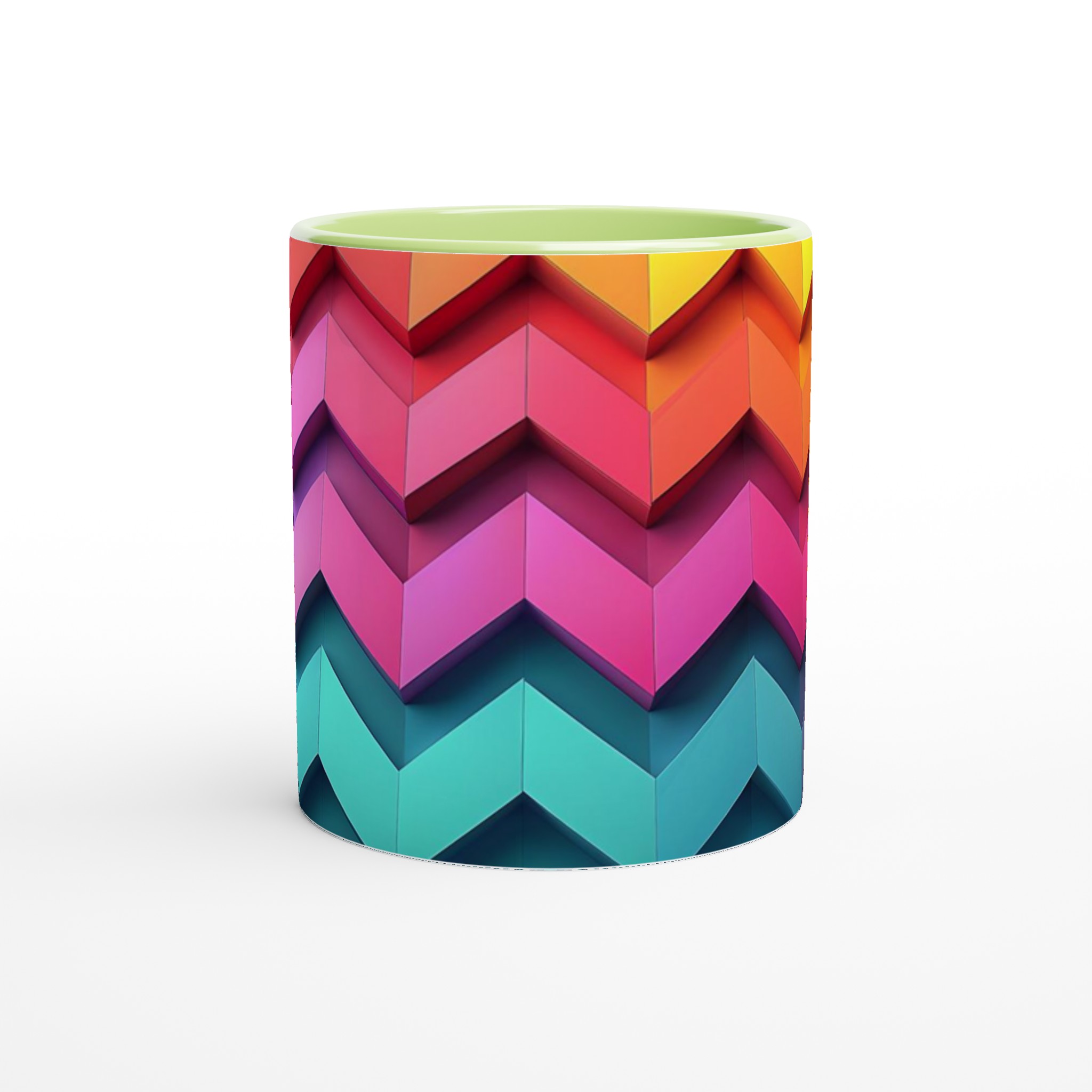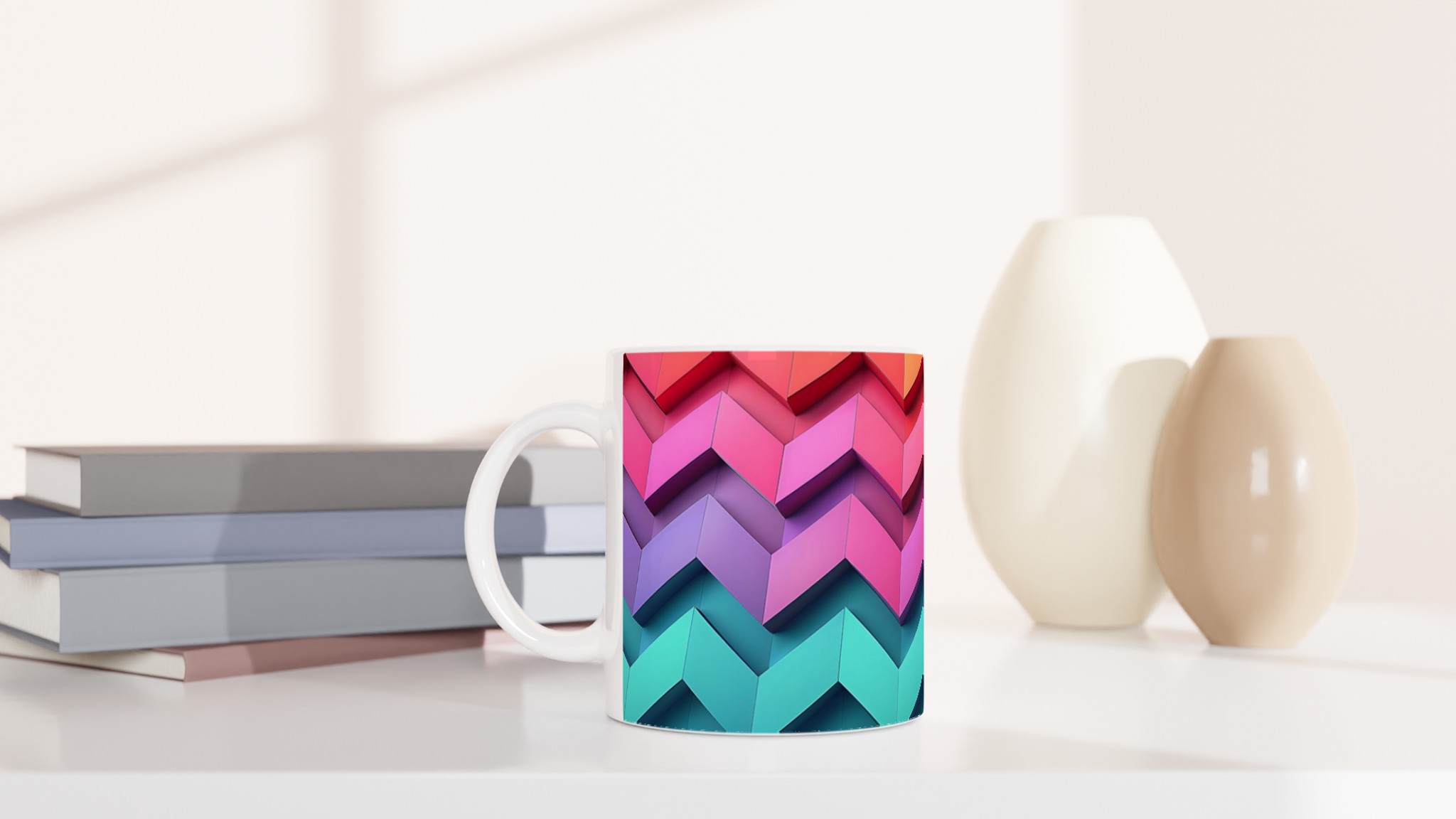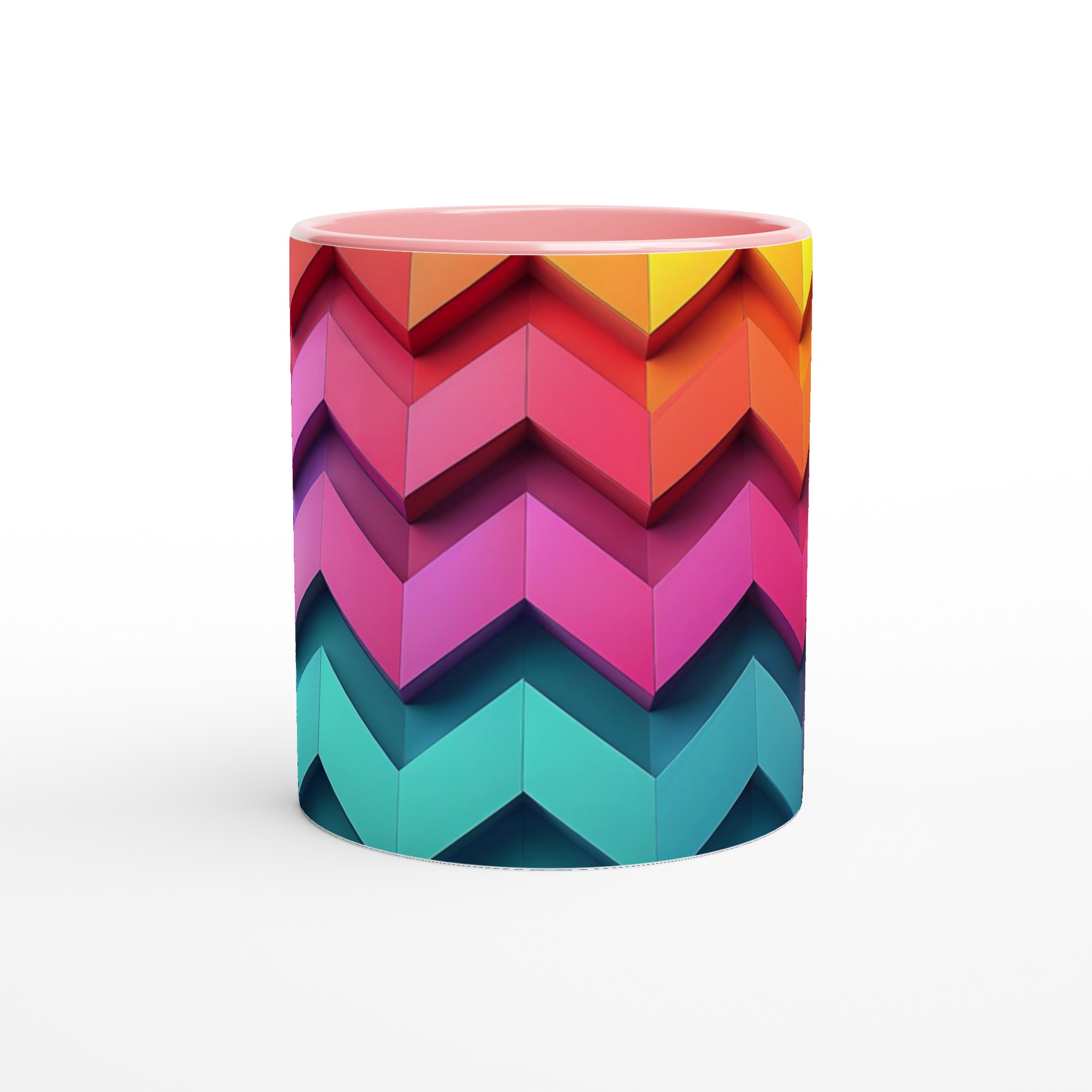 Lyft din fikapaus med vår stilrena och vackra keramiska mugg, designad för att lysa upp alla dina stunder. Oavsett om det är morgonkaffet, en värmande kopp te eller en härlig varm choklad, blir denna mugg snabbt din nya favorit. Med en yta som fångar ögat med en fantastisk chevron-design i en levande palett av regnbågsfärger, garanterar vi att varje klunk blir en fest för sinnena.