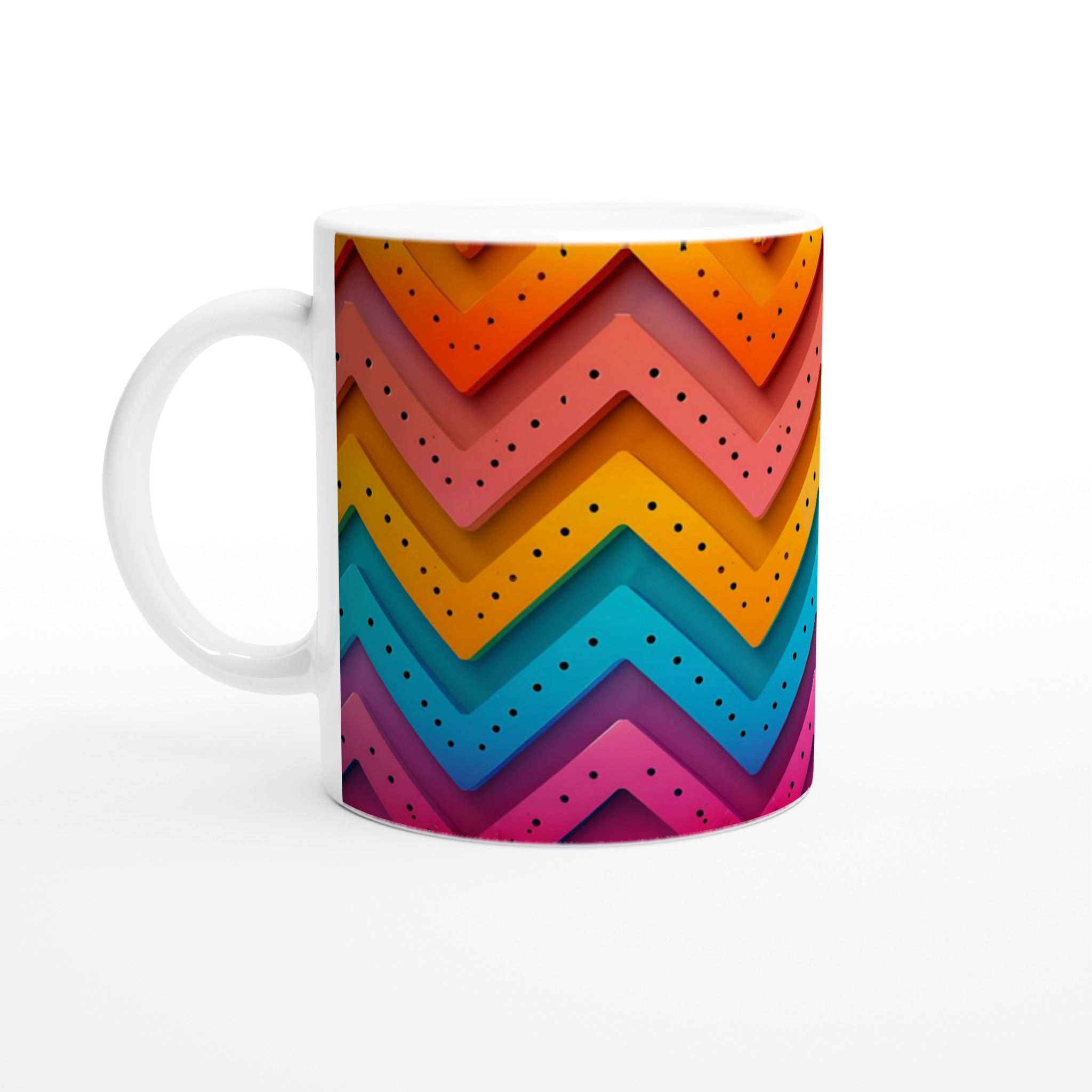 Inspirerad av den livfulla, lekfulla designen med glada chevronmönster och prickar, är denna mugg den perfekta duken för att uttrycka din personlighet. Den blanka ytan ger ett skarpt och levande tryck som verkligen sticker ut, oavsett om det är en personlig design, ett roligt citat eller en present till någon du tycker om. Ge ditt kök eller kontor en färgexplosion som speglar din unika smak.