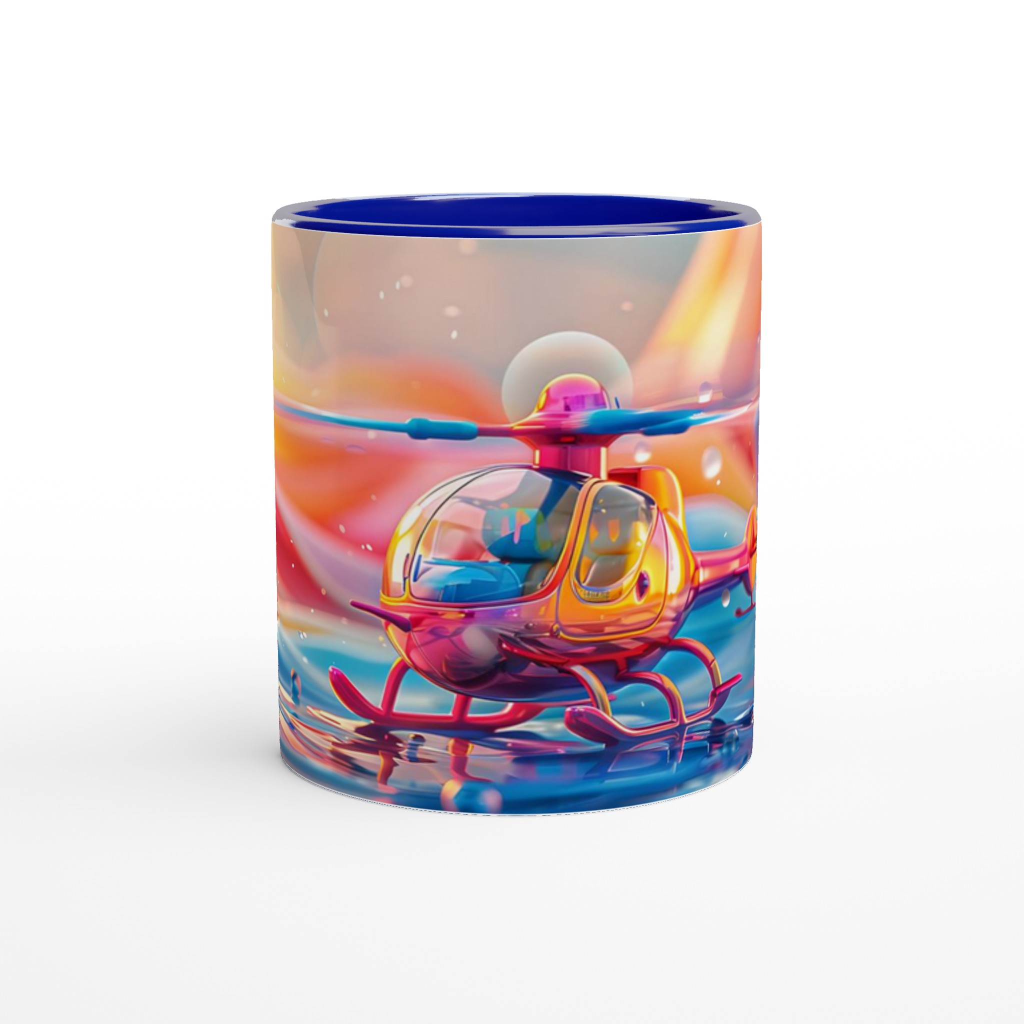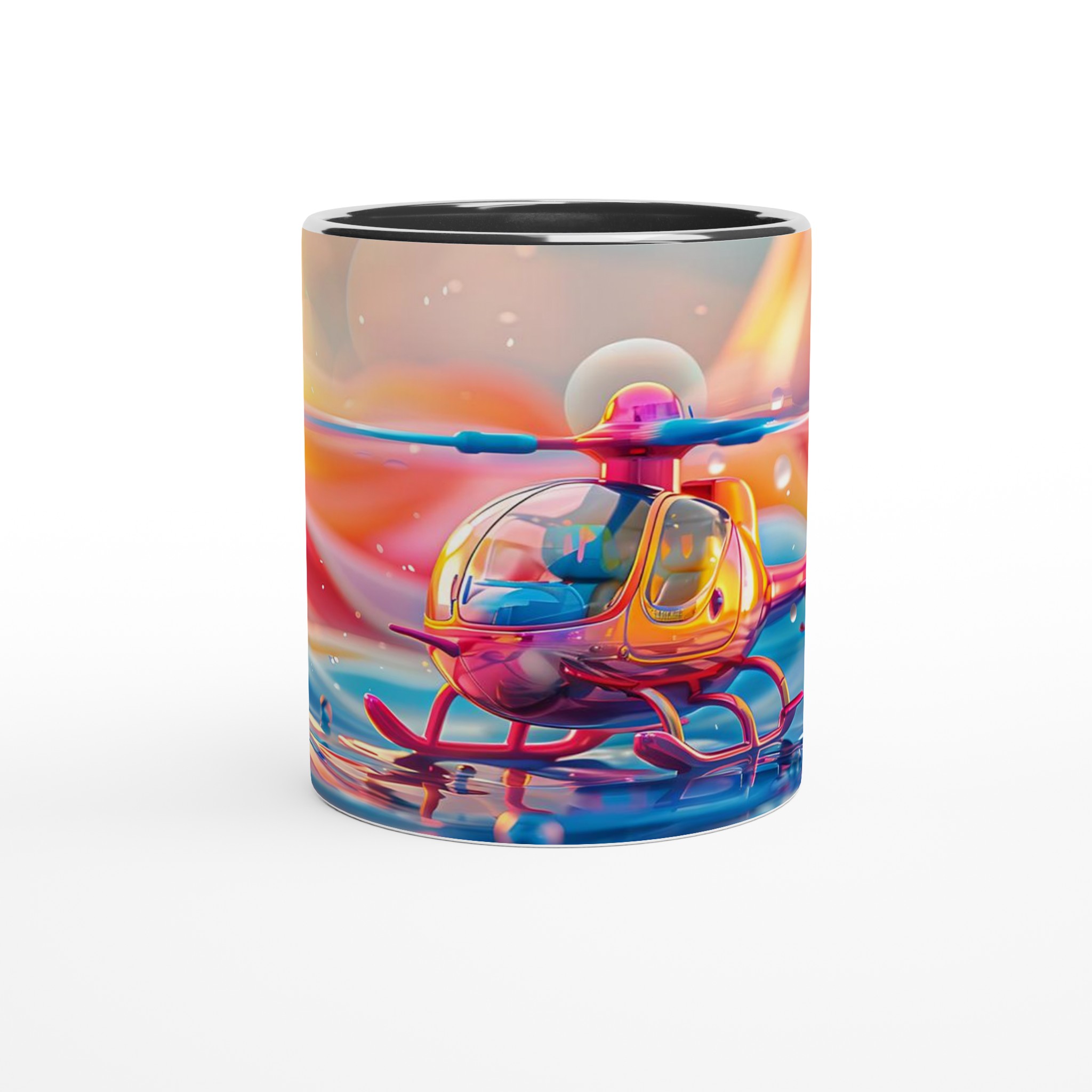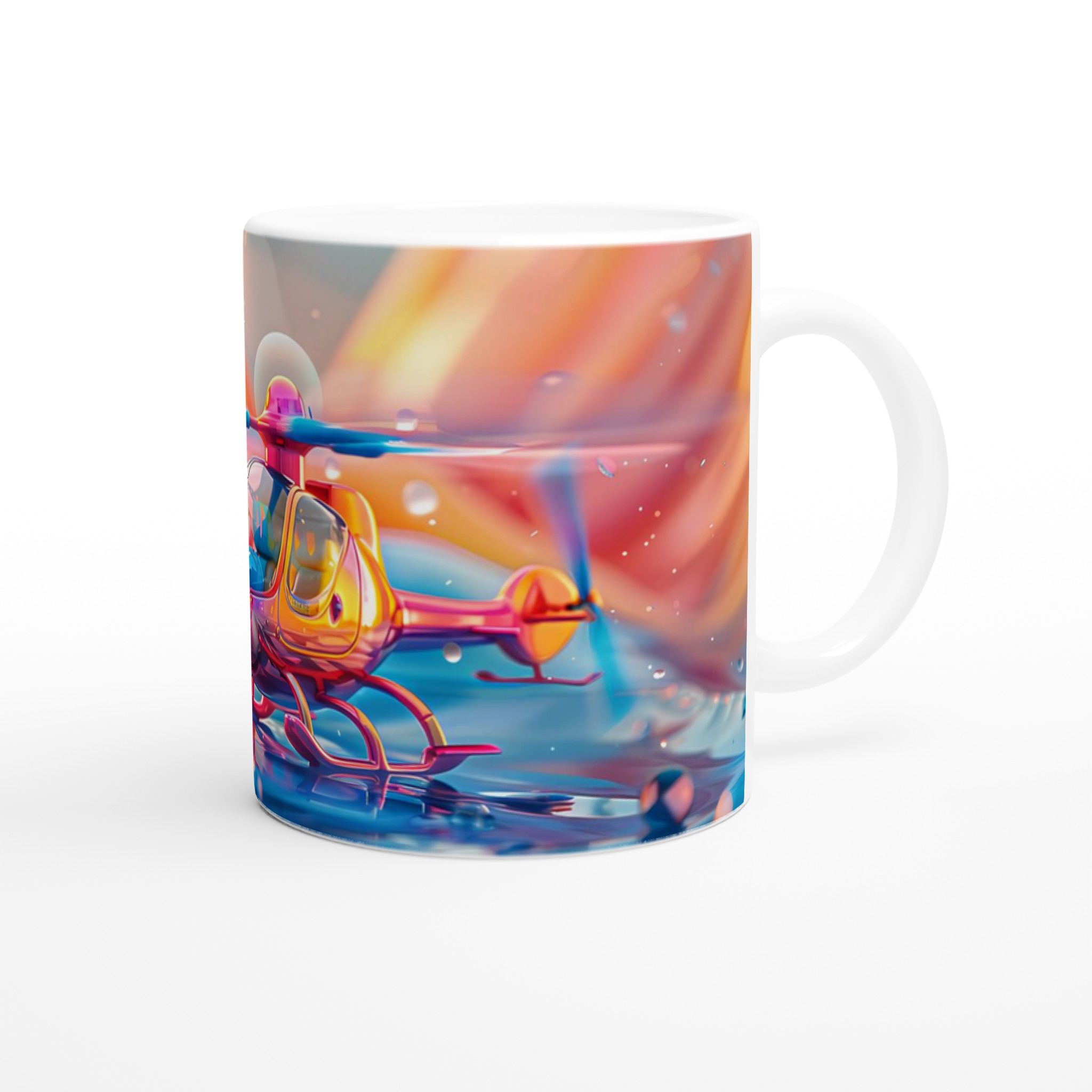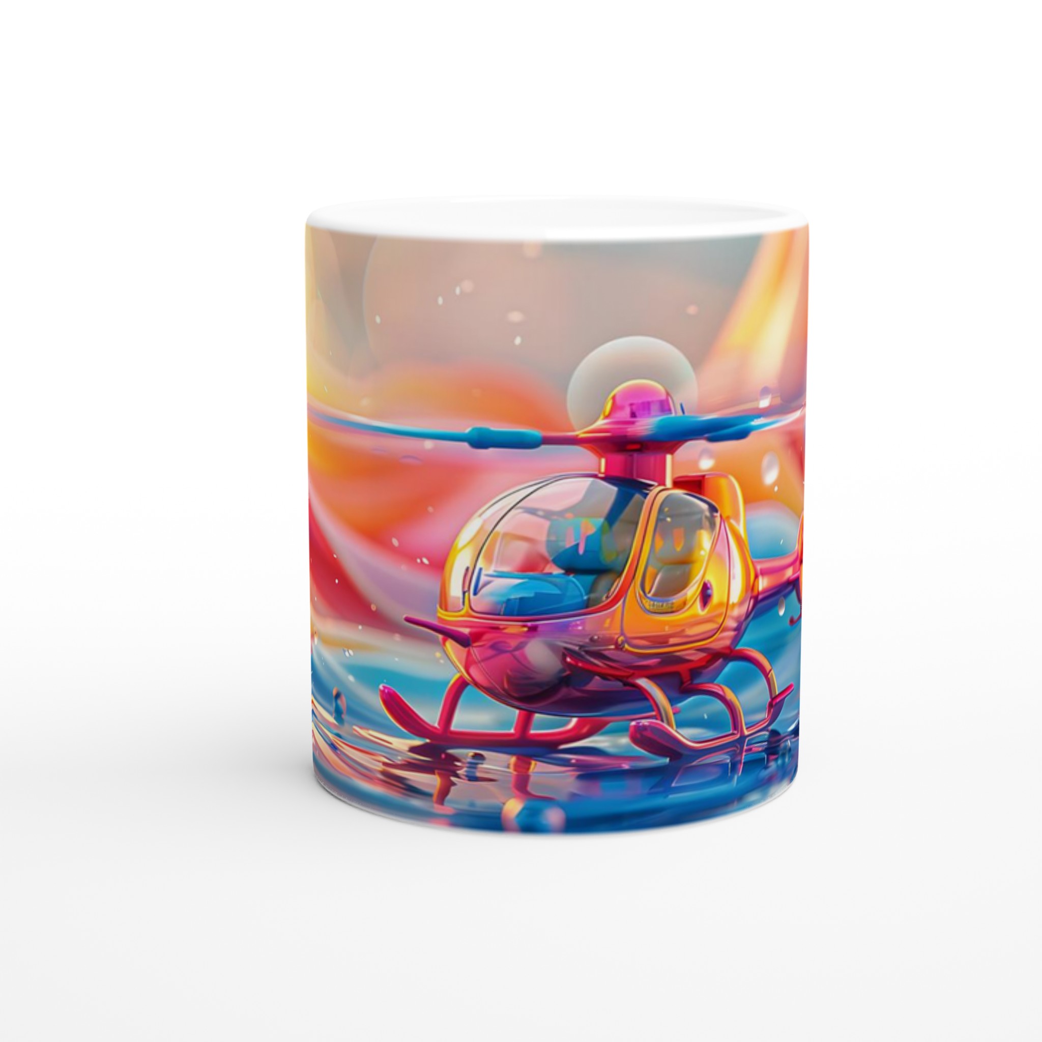 Ge din fikastund en lekfull och färgstark touch med denna unika keramikmugg! Inspirerad av den drömlika bilden av en skinande helikopter i en värld av flytande godisnyanser, blir varje klunk en liten fest. De livliga färgerna och den glänsande ytan fångar ögat och sprider glädje, oavsett om du njuter av morgonkaffet, en värmande kopp te eller en härlig varm choklad.