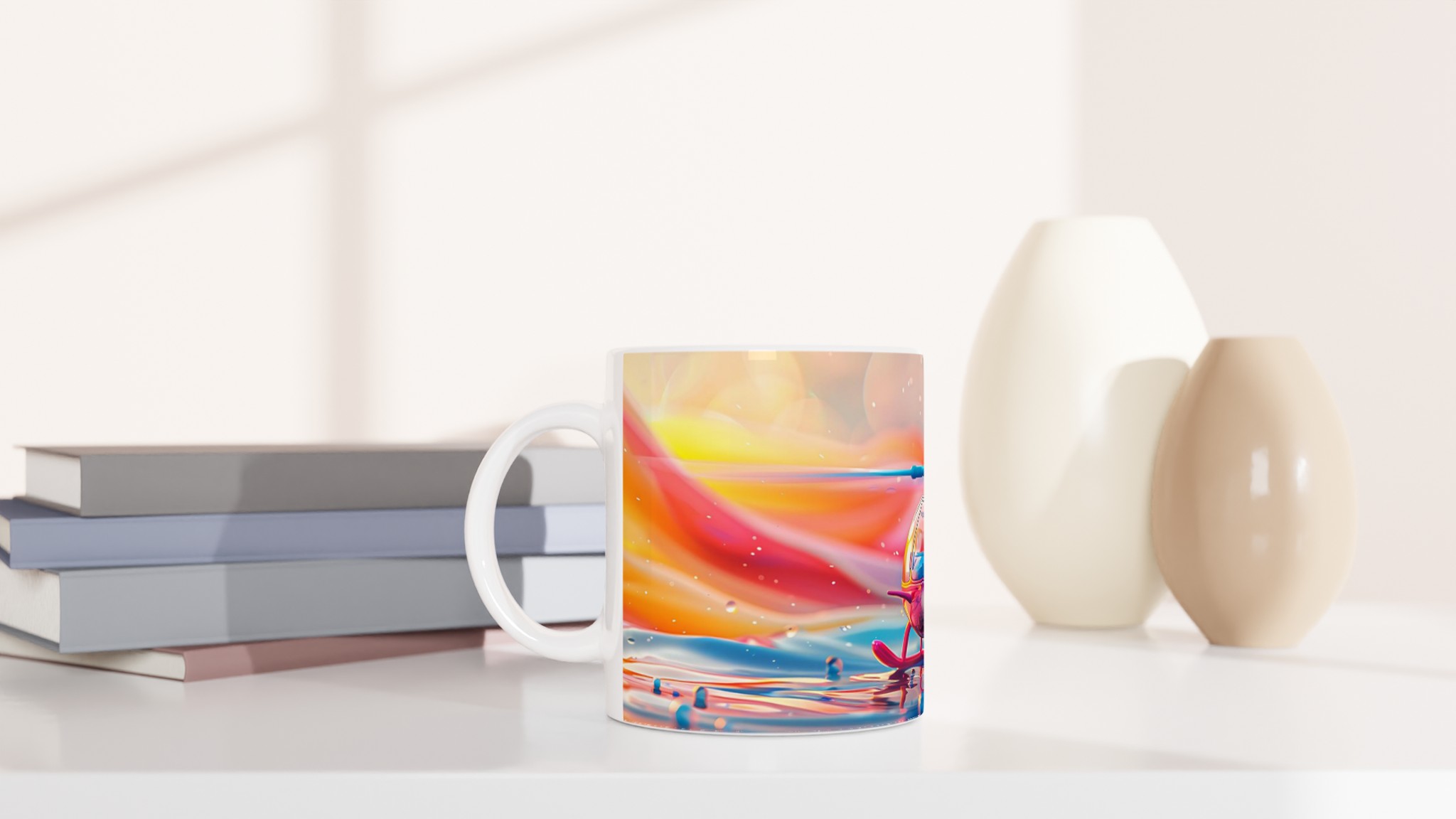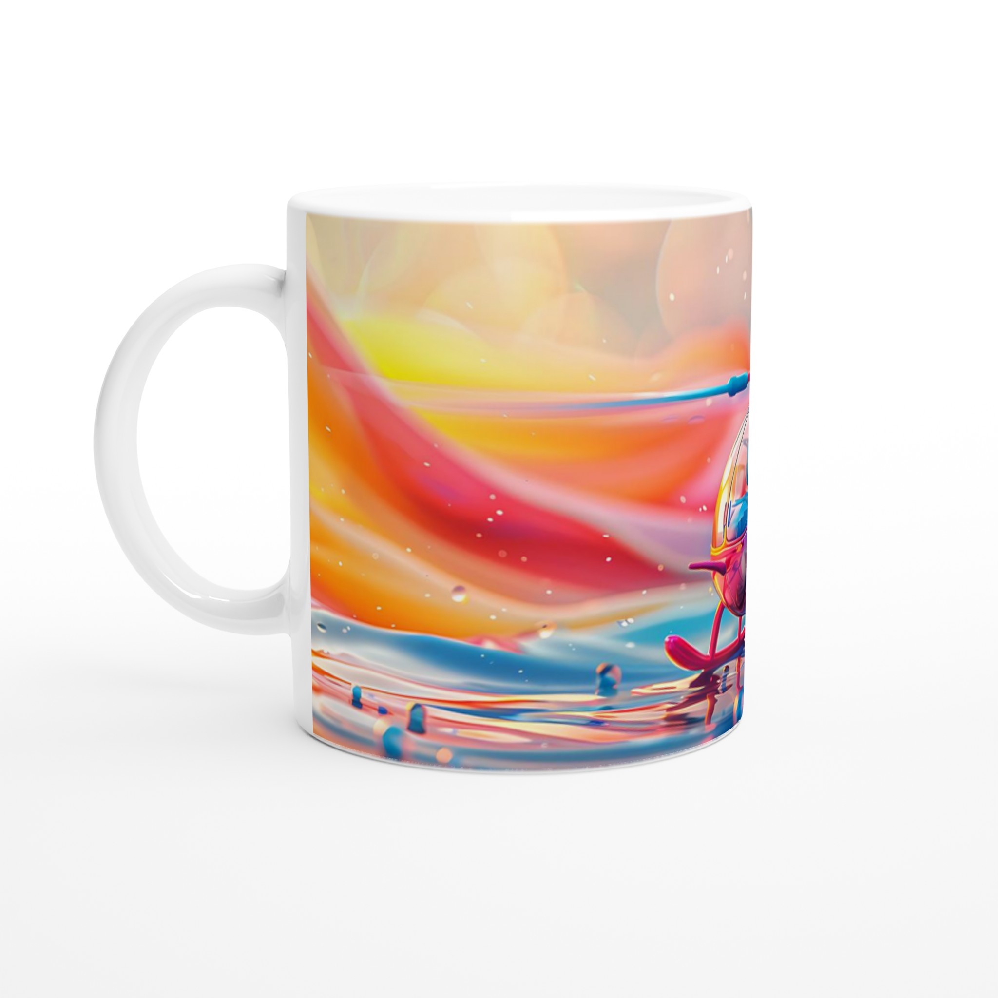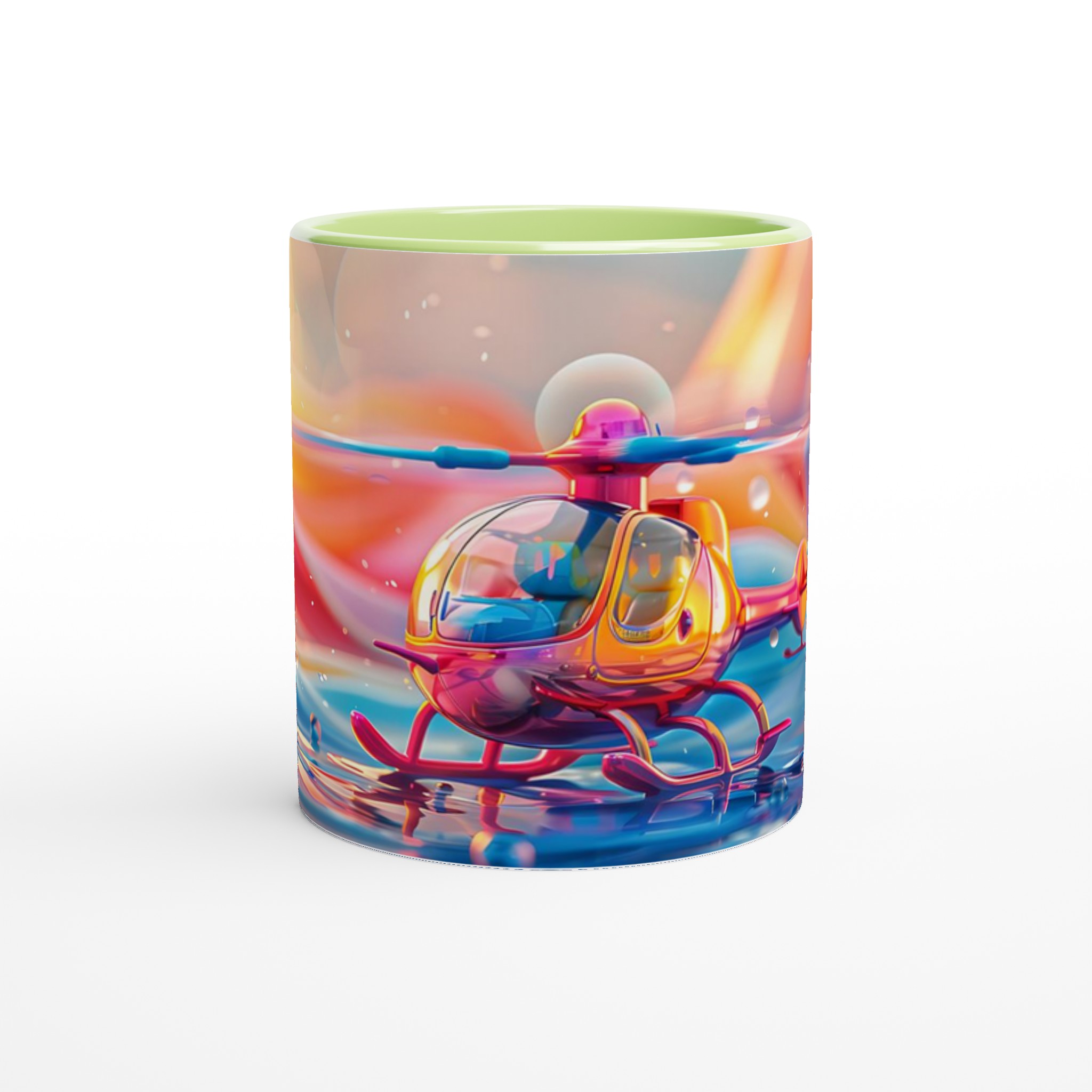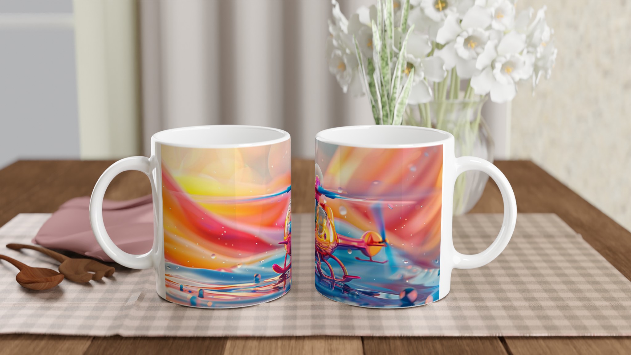 Ge din fikastund en lekfull och färgstark touch med denna unika keramikmugg! Inspirerad av den drömlika bilden av en skinande helikopter i en värld av flytande godisnyanser, blir varje klunk en liten fest. De livliga färgerna och den glänsande ytan fångar ögat och sprider glädje, oavsett om du njuter av morgonkaffet, en värmande kopp te eller en härlig varm choklad.