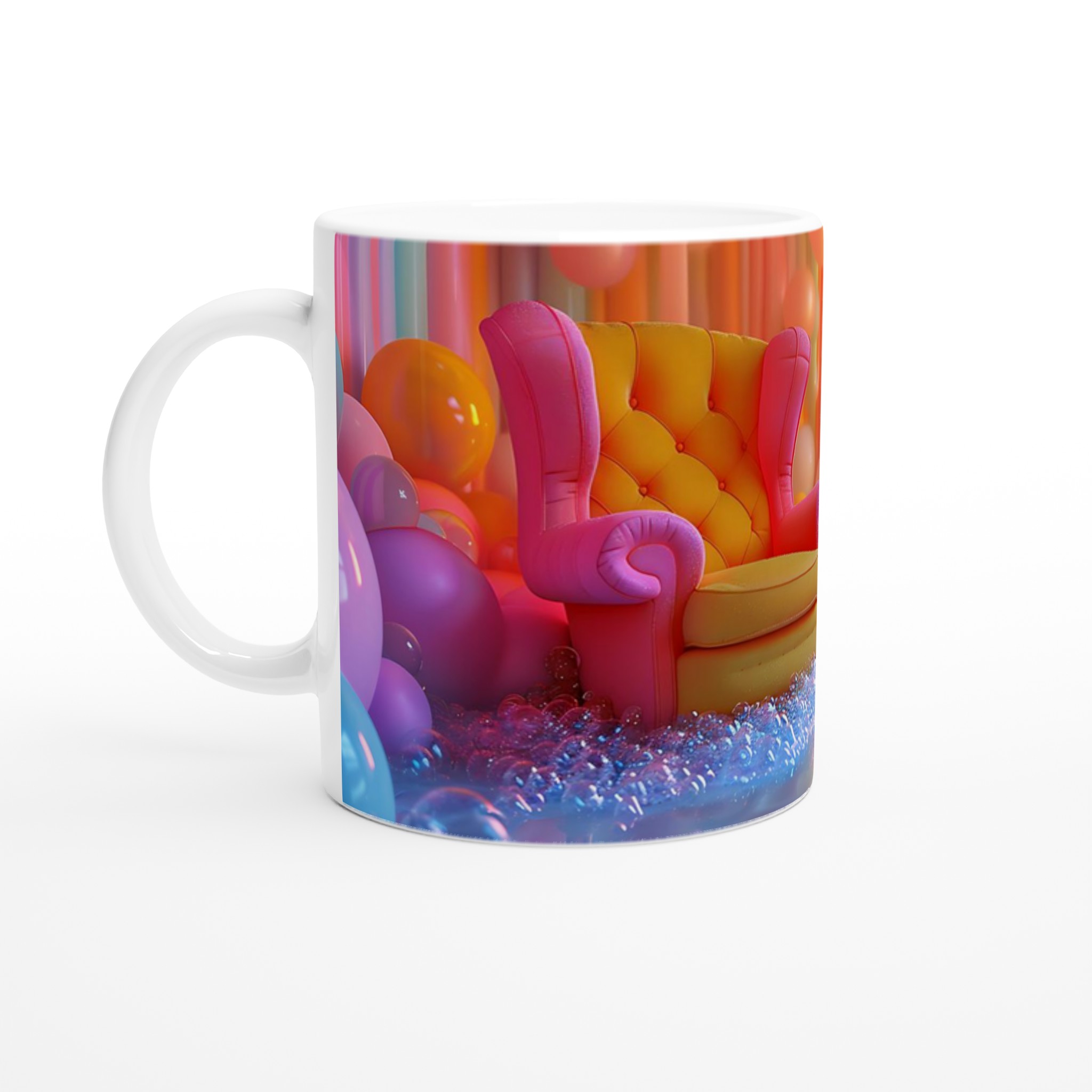 Väck din inre fantasi till liv med varje klunk! Denna 11 oz keramikmugg är inte bara en behållare för din favoritdryck, utan en explosion av glädje och färg, inspirerad av en drömlik värld av pasteller och livliga toner. Precis som de lekfulla bubblorna och den mjuka fåtöljen i en palett av rosa, gult och blått, ger denna mugg din fikapaus en touch av magi och livfullhet. Välj bland en rad keramiska nyanser – klassisk vit, solig gul, söt rosa, fräsch grön, passionerad röd, elegant svart eller lugnande blå – för att perfekt matcha din personlighet eller inredning. Låt din mugg bli en daglig påminnelse om att omfamna det extraordinära.