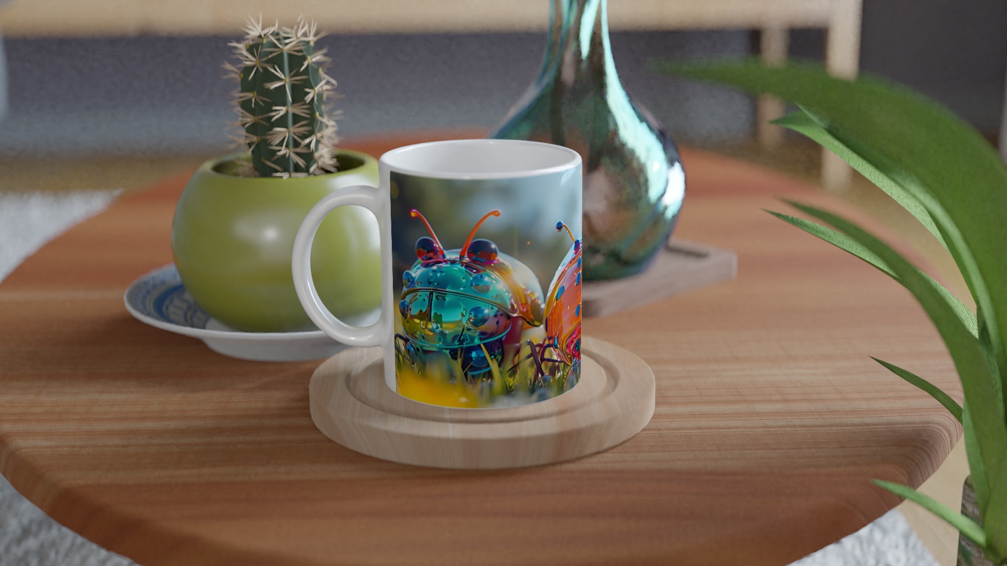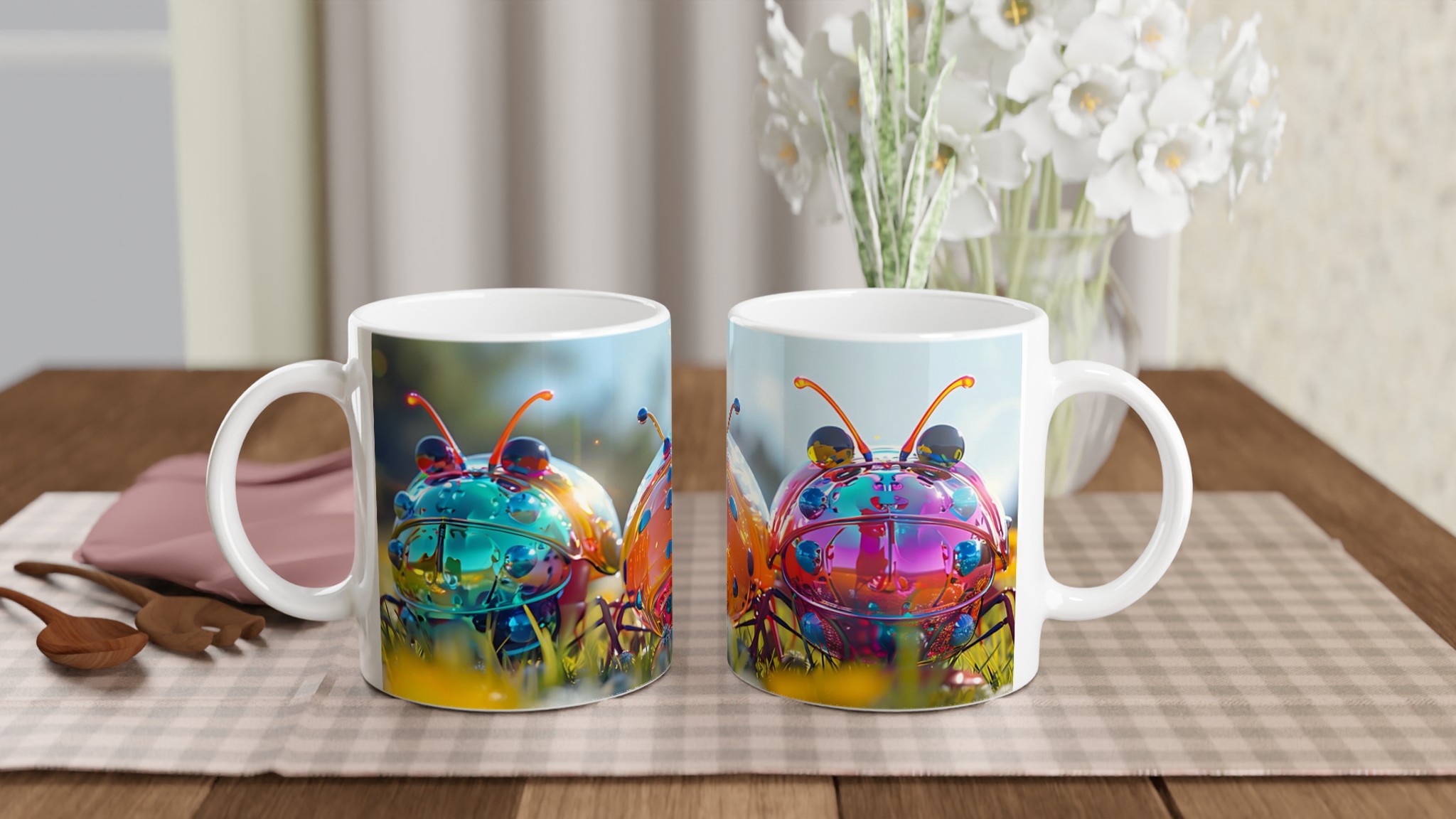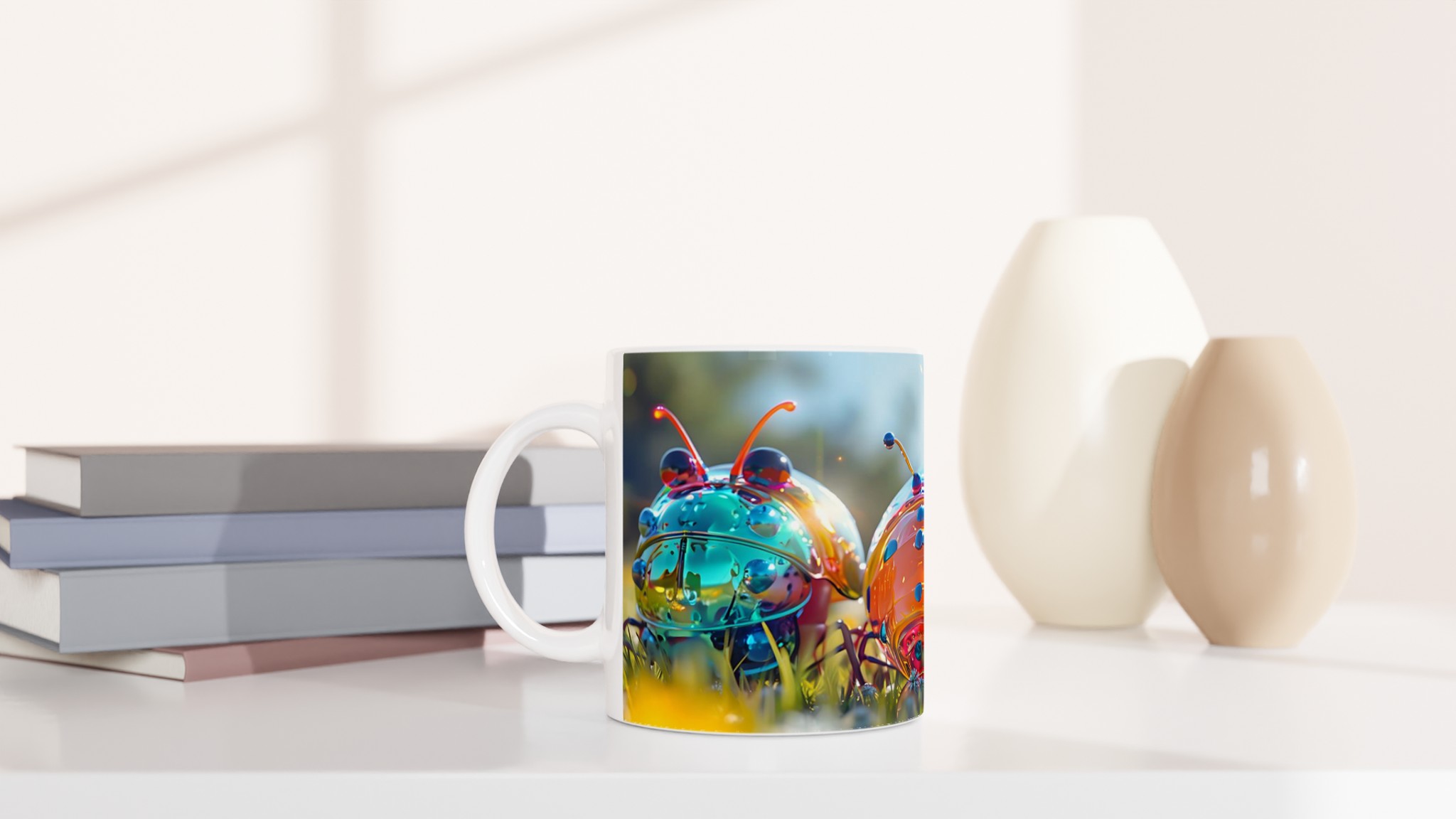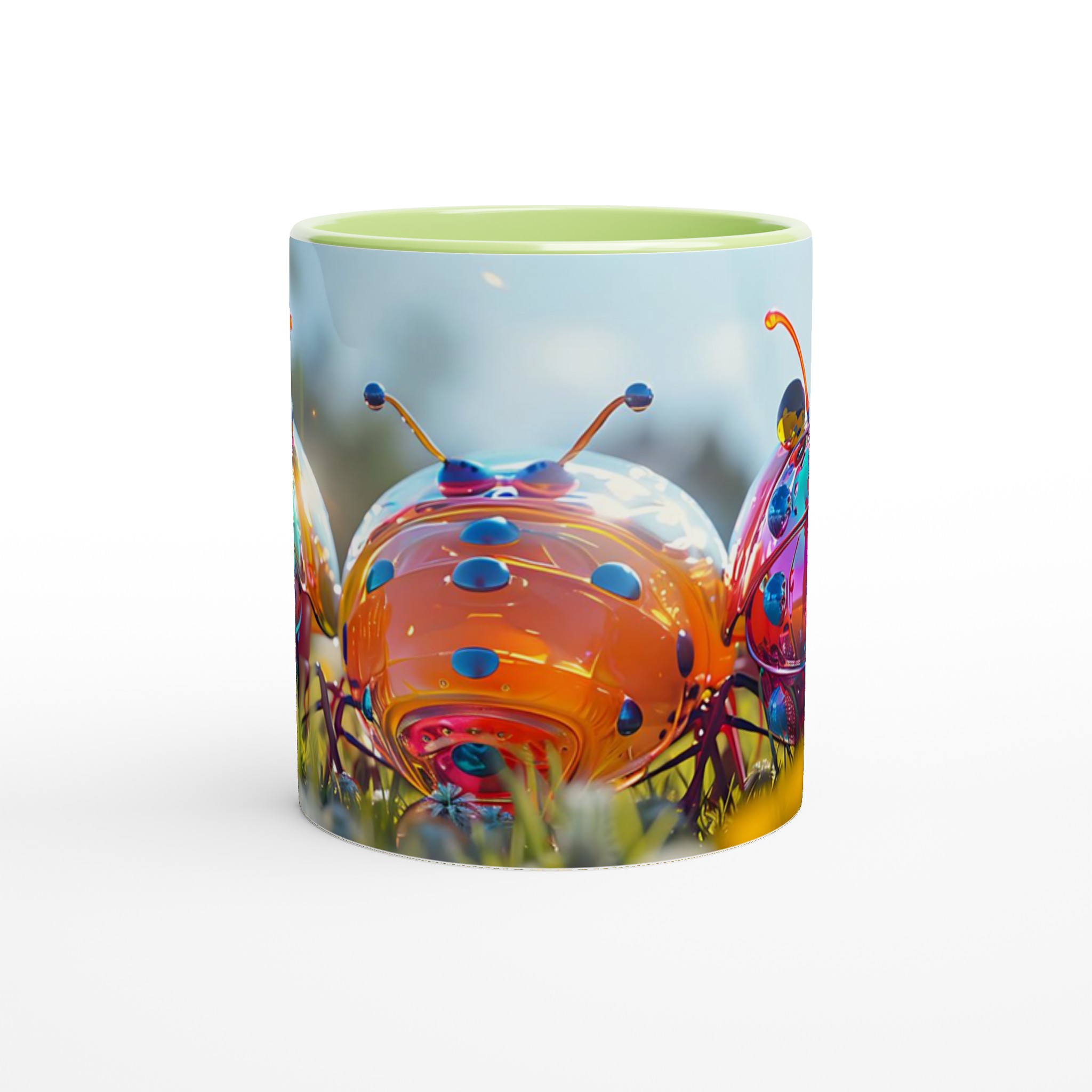 Liva upp din vardag med denna lekfulla keramikmugg, prydd med ett fantastiskt konstverk av glänsande, fantasifulla insekter i en levande färgpalett. Varje klunk blir en fest för ögat med dess drömlika och futuristiska design som garanterat sprider glädje och konversation. Oavsett om du föredrar morgonkaffet, en värmande kopp te eller en härlig varm choklad, är denna mugg den perfekta följeslagaren för alla dagens stunder.