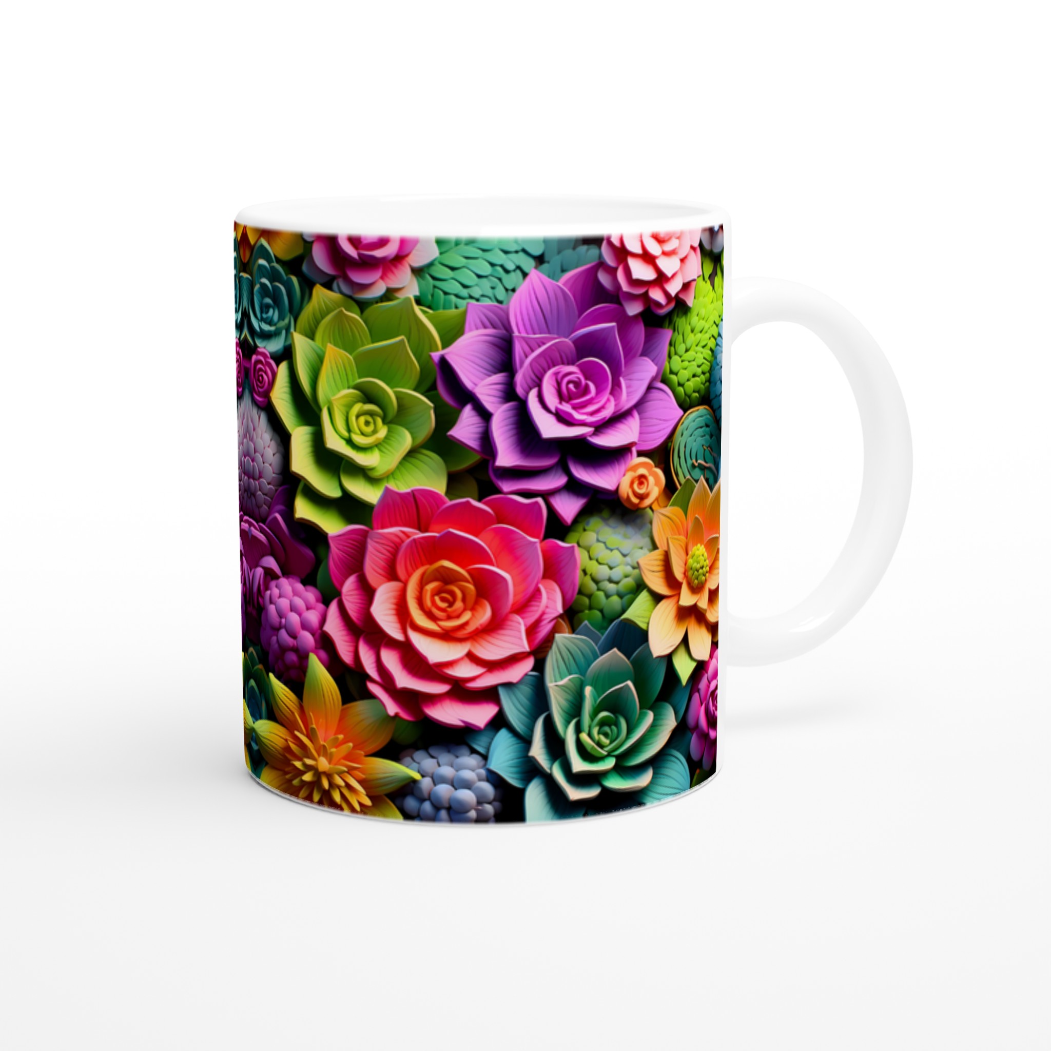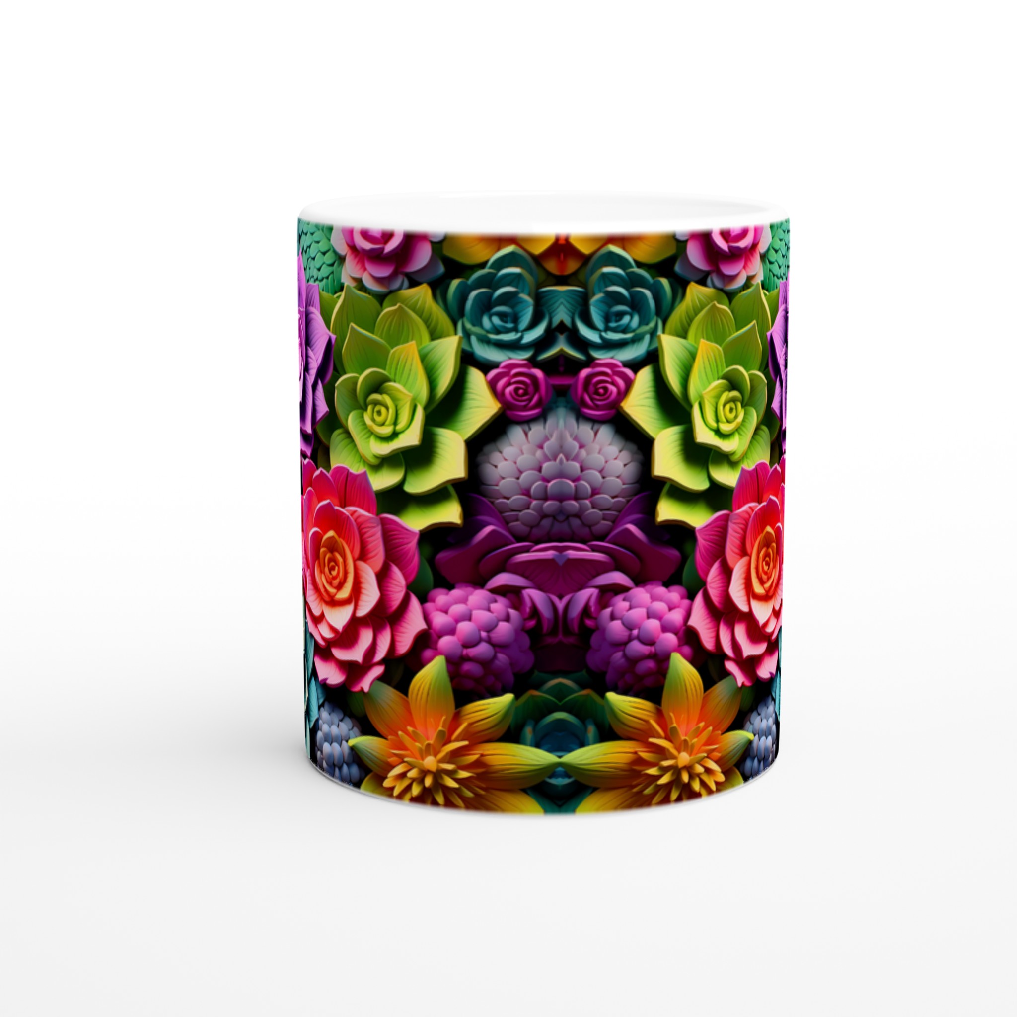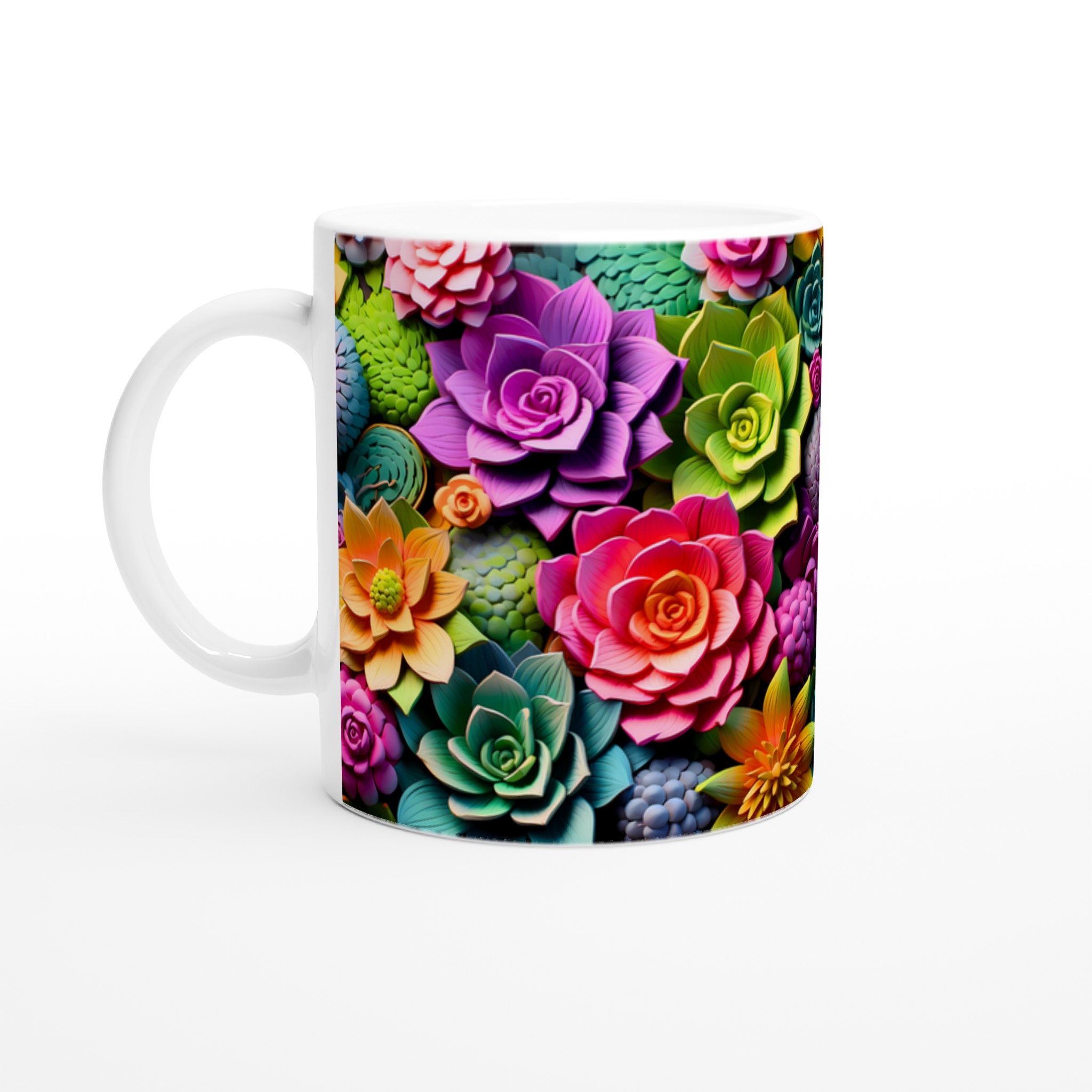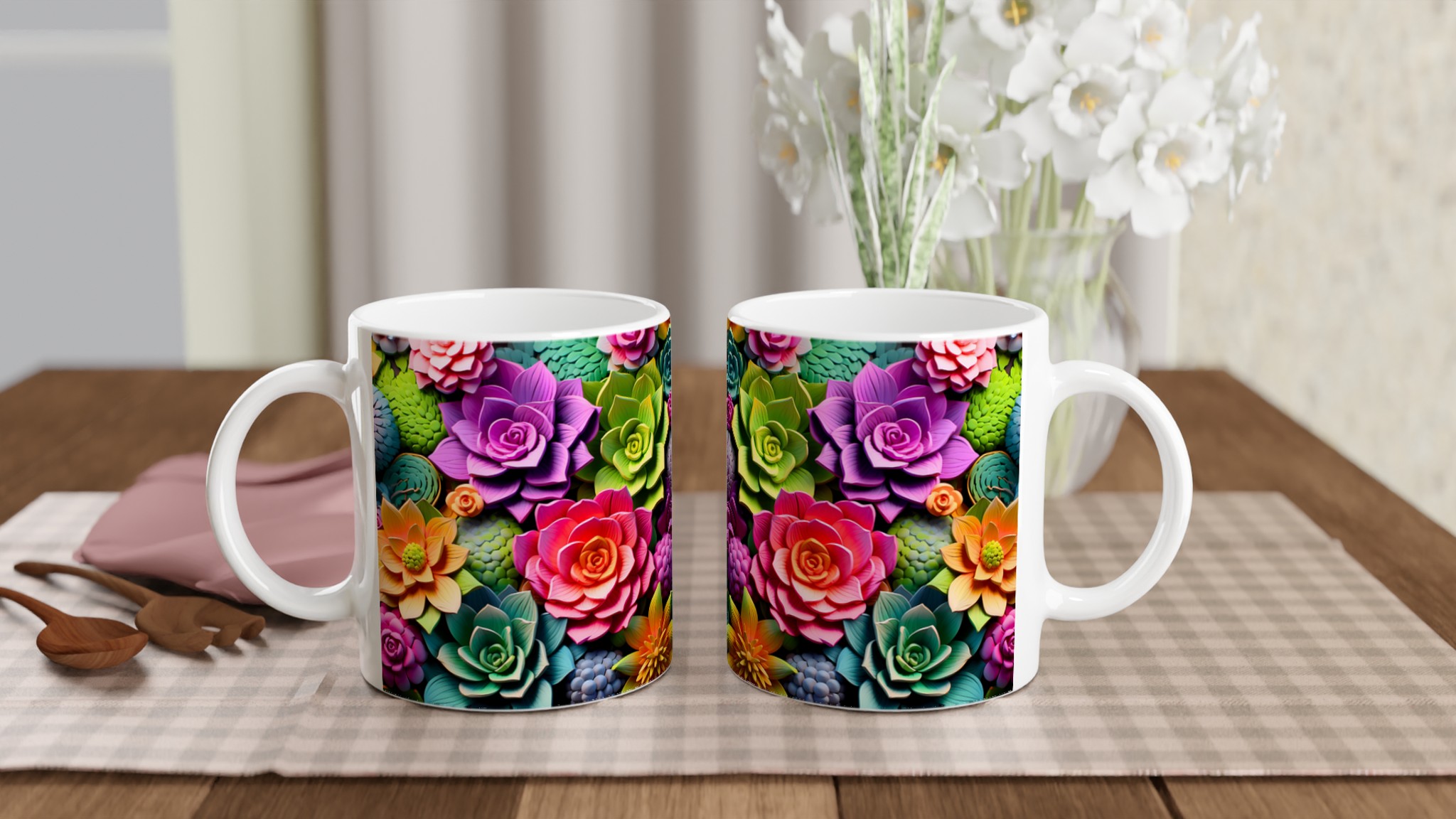 Låt varje fikastund bli en färgexplosion med vår unika keramiska mugg, prydd med en livfull design av stiliserade kaktusar och suckulenter i 3D-stil. De rika, juveltonade färgerna – från djup lila och kornblått till energisk orange och limegrönt – skapar en konstnärlig och glad känsla som lyser upp din dag. Den här muggen är mer än bara en kopp; den är ett konstverk som förvandlar ditt kök eller kontor till en oas av färg och glädje. Perfekt för morgonkaffet, kvällens varma choklad eller när du bara vill njuta av en kopp te. Den blanka vita ytan gör att trycken framhävs med klara och levande färger, som håller sig fina även efter många turer i mikron och diskmaskinen.