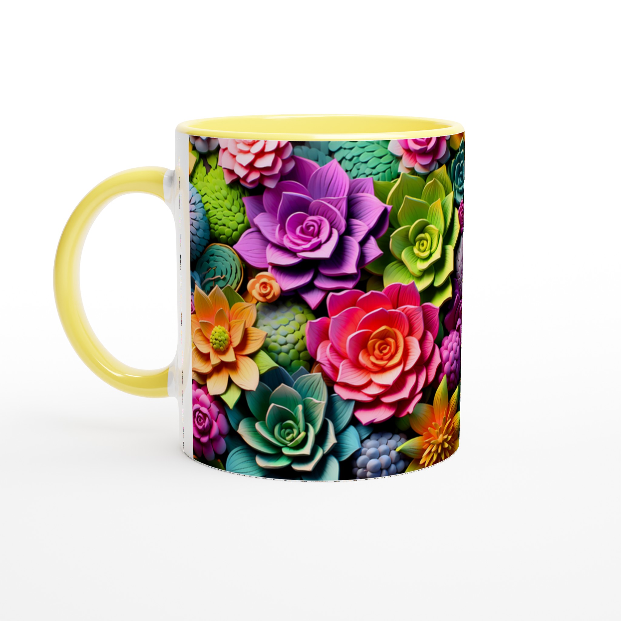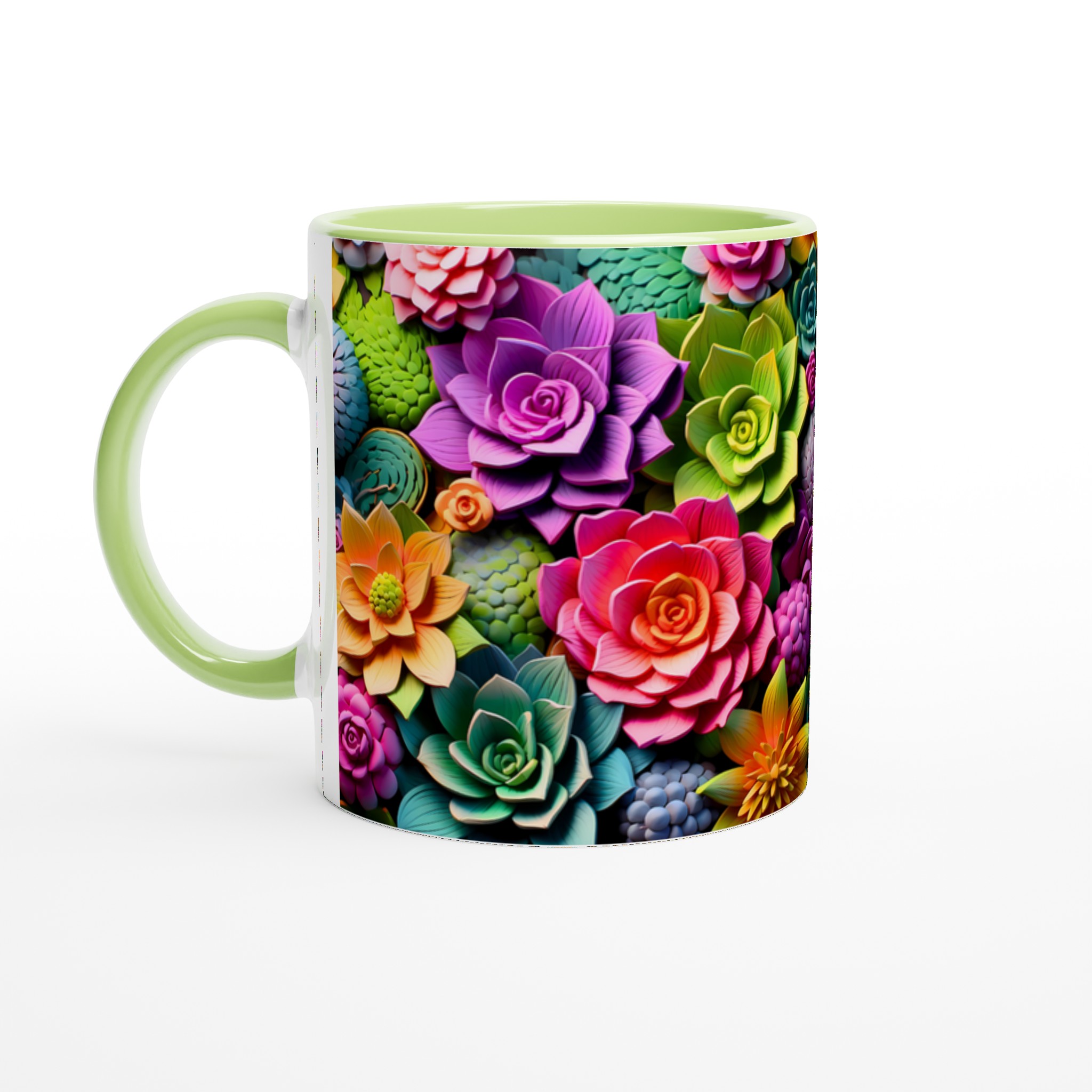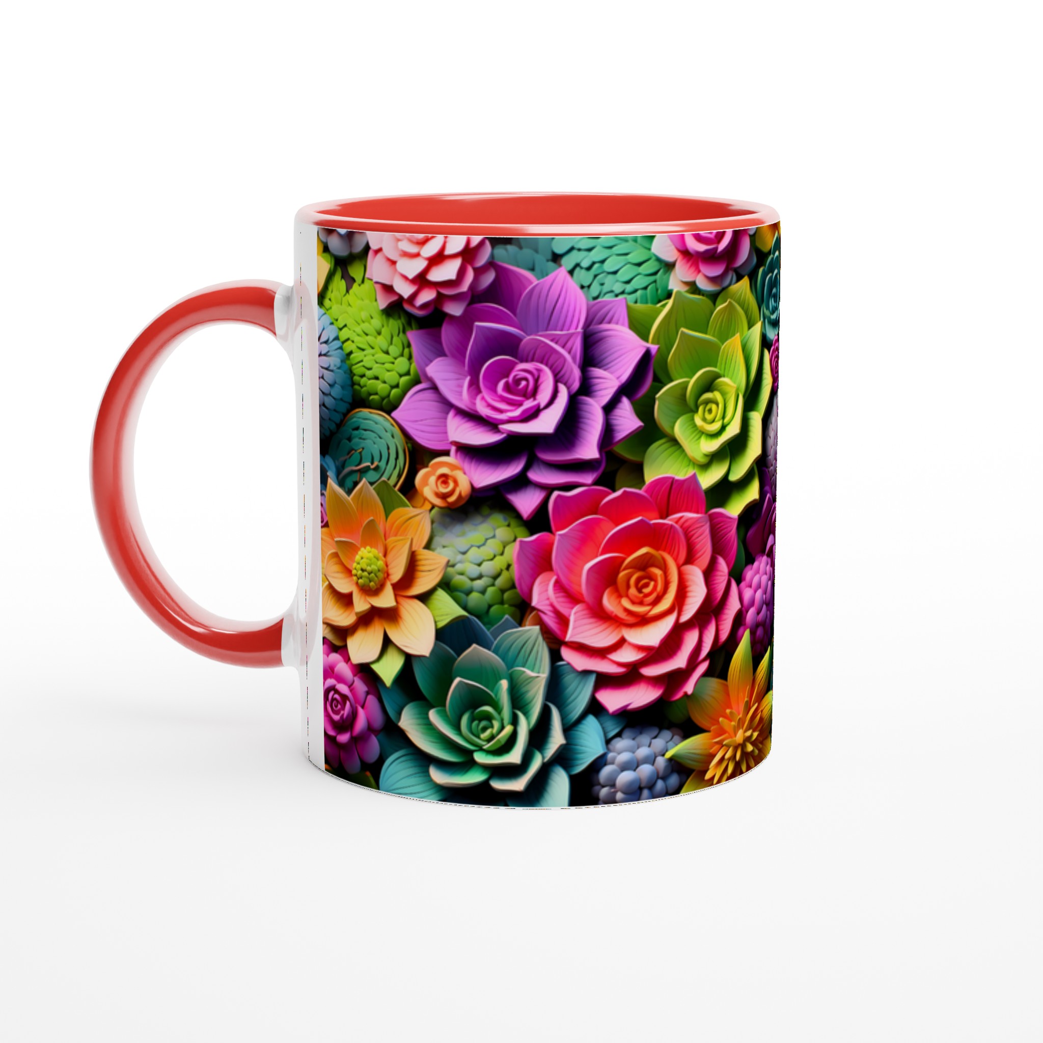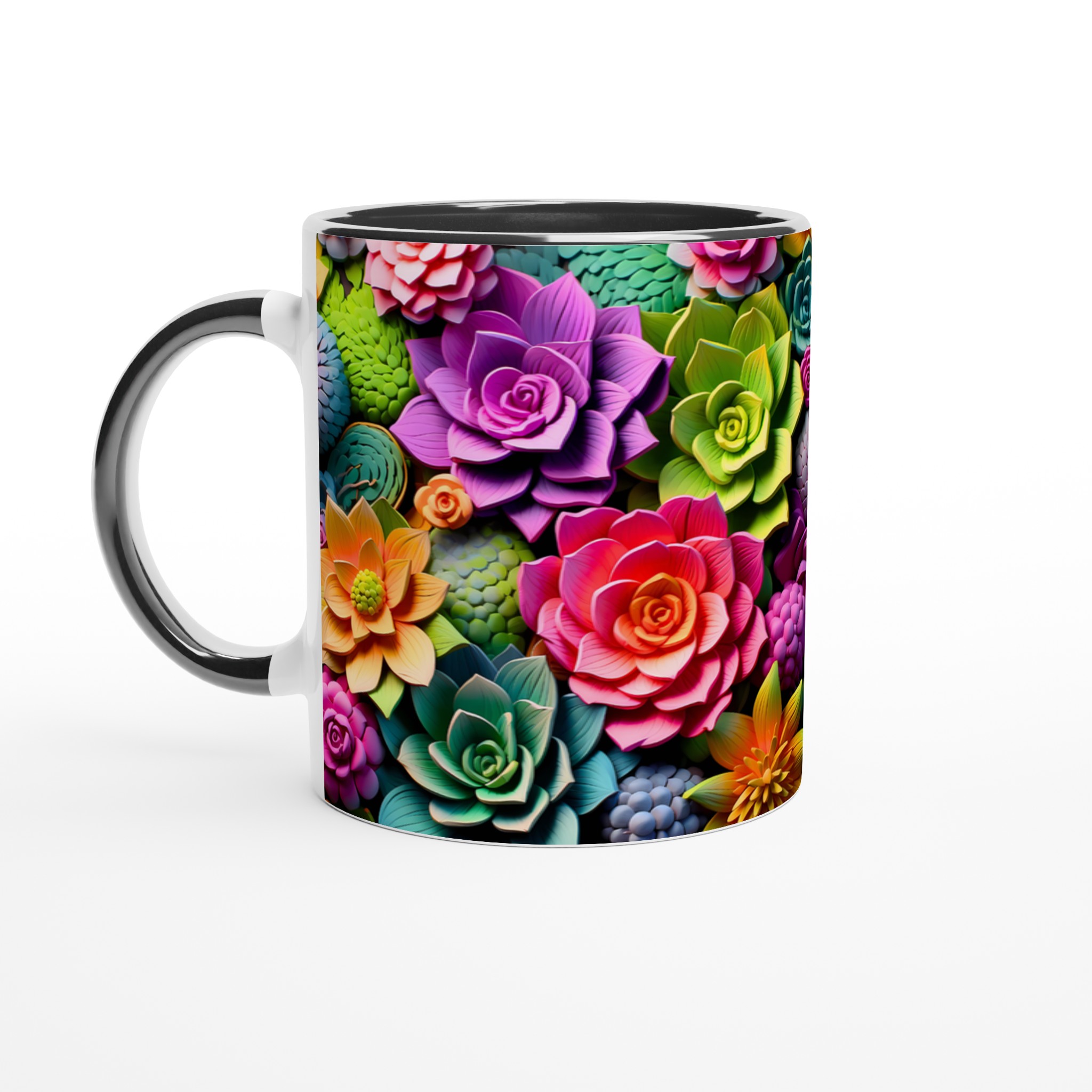 Låt varje fikastund bli en färgexplosion med vår unika keramiska mugg, prydd med en livfull design av stiliserade kaktusar och suckulenter i 3D-stil. De rika, juveltonade färgerna – från djup lila och kornblått till energisk orange och limegrönt – skapar en konstnärlig och glad känsla som lyser upp din dag. Den här muggen är mer än bara en kopp; den är ett konstverk som förvandlar ditt kök eller kontor till en oas av färg och glädje. Perfekt för morgonkaffet, kvällens varma choklad eller när du bara vill njuta av en kopp te. Den blanka vita ytan gör att trycken framhävs med klara och levande färger, som håller sig fina även efter många turer i mikron och diskmaskinen.