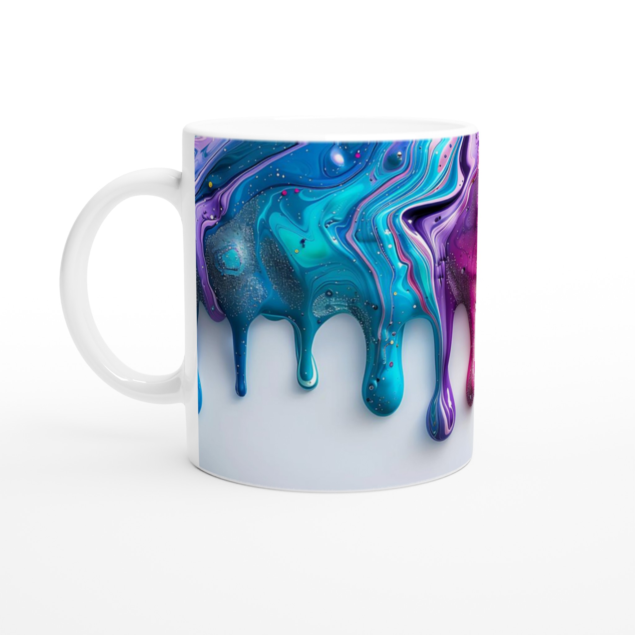 Inspirerad av en glittrande kaskad av levande färger och dynamiska virvlar, fångar denna mugg ögat och ger energi till varje sip. Den blanka vita ytan ger ett skarpt och levande tryck som verkligen sticker ut, oavsett om det är en personlig design, ett roligt citat eller en present till någon du tycker om.