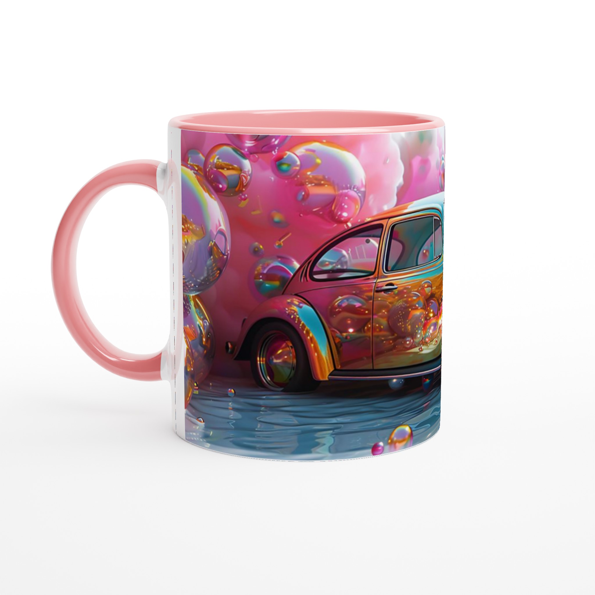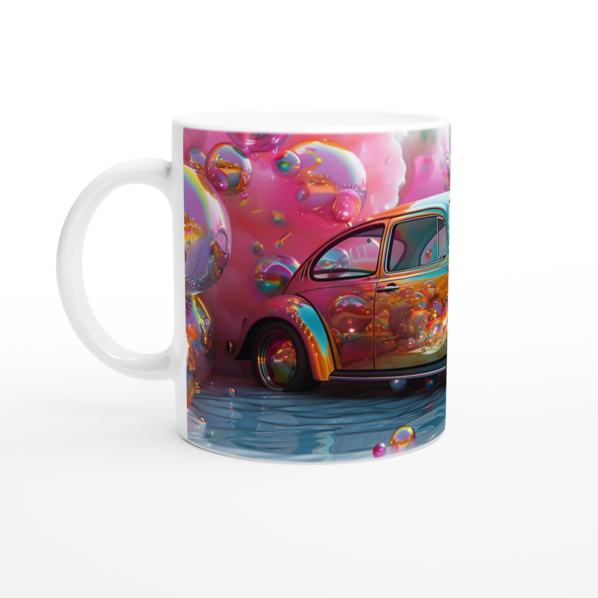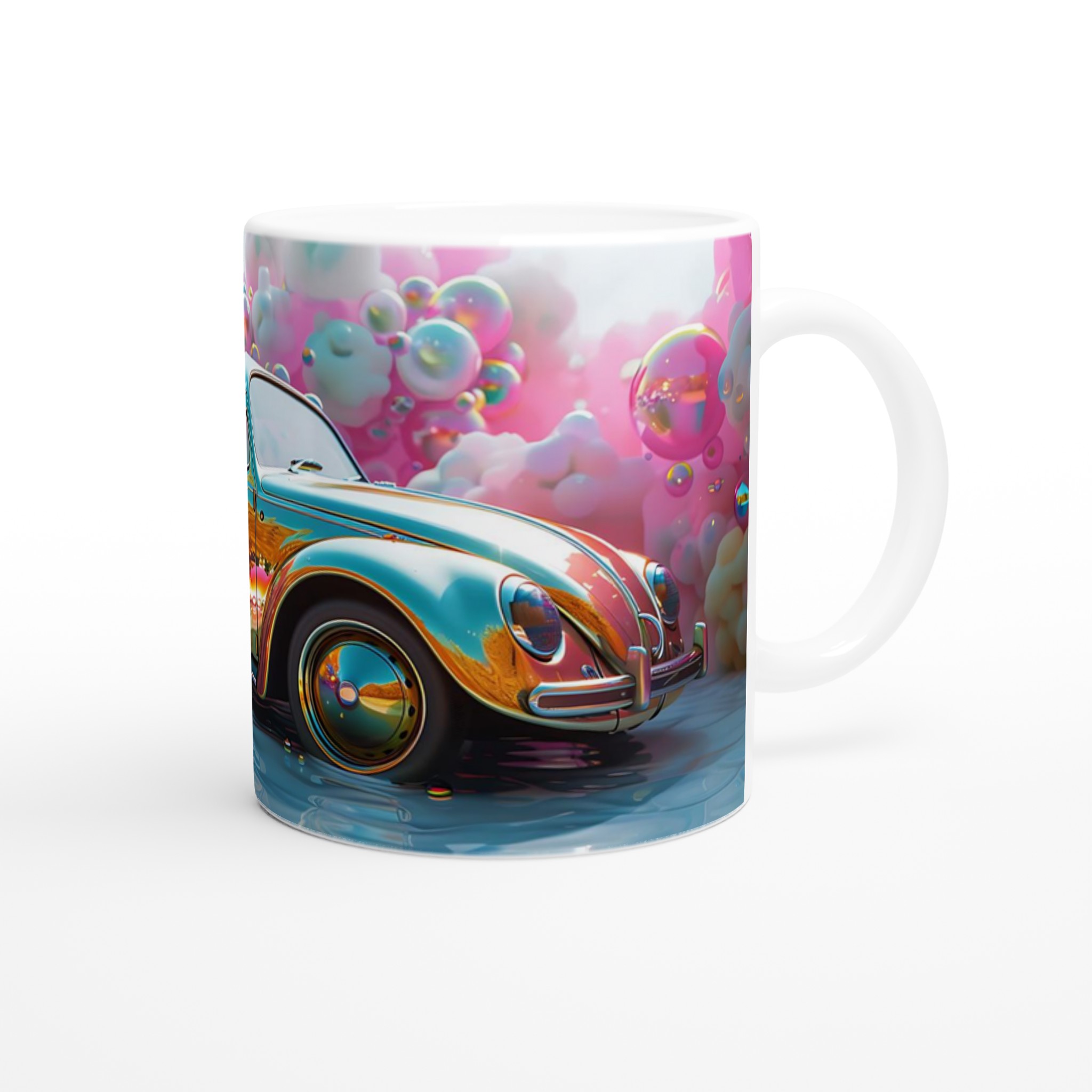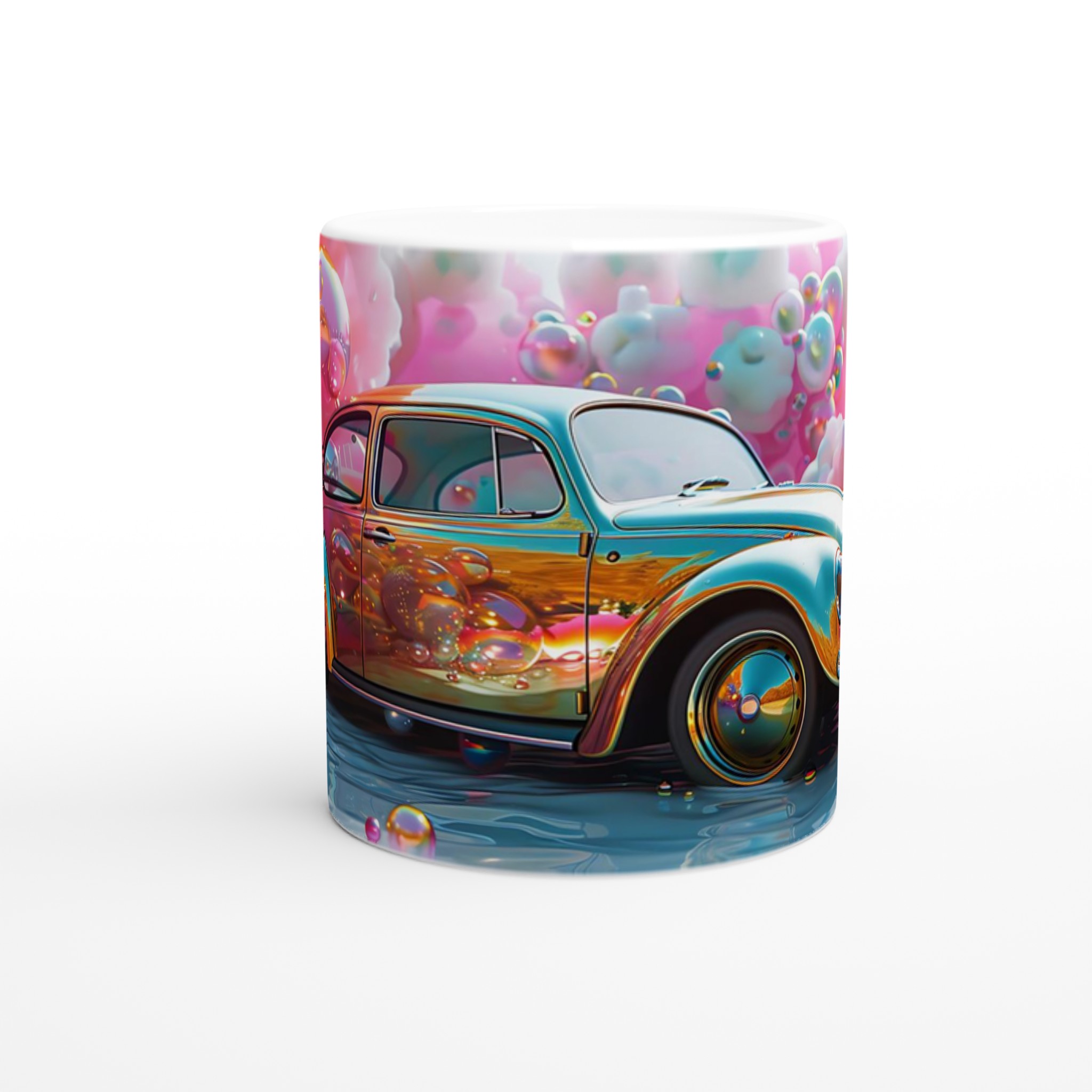 Stig in i en drömvärld varje gång du tar en klunk med denna unikt designade keramiska mugg. Inspirerad av de livfulla färgerna och den lekfulla energin från en fantasifull rosa himmel fylld med glittrande bubblor och en skimrande bil, är denna mugg mer än bara en kopp – den är en konstnärlig upplevelse. Den blanka vita ytan framhäver trycket med exceptionell klarhet och levande färger, så att varje detalj av denna magiska scen bibehålls, även efter otaliga användningar i mikron och diskmaskinen.