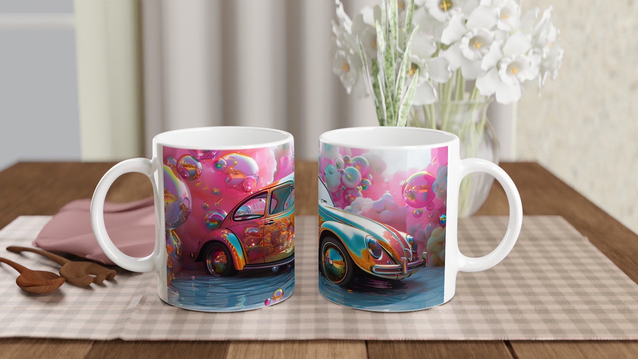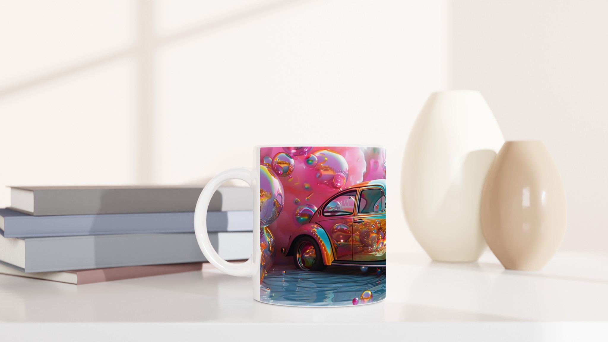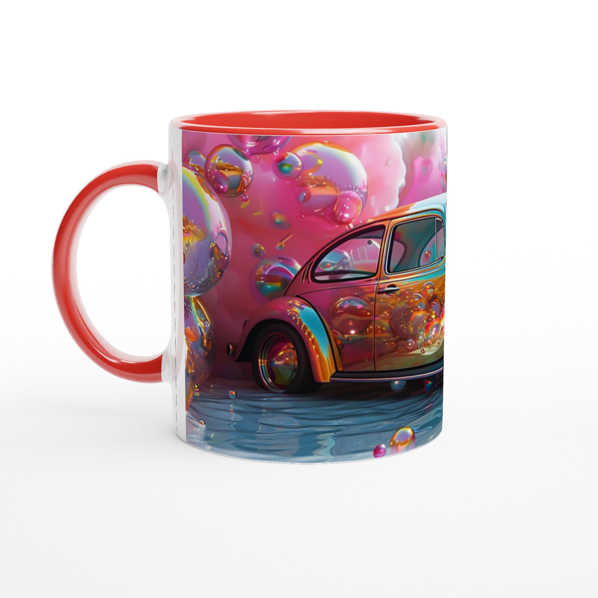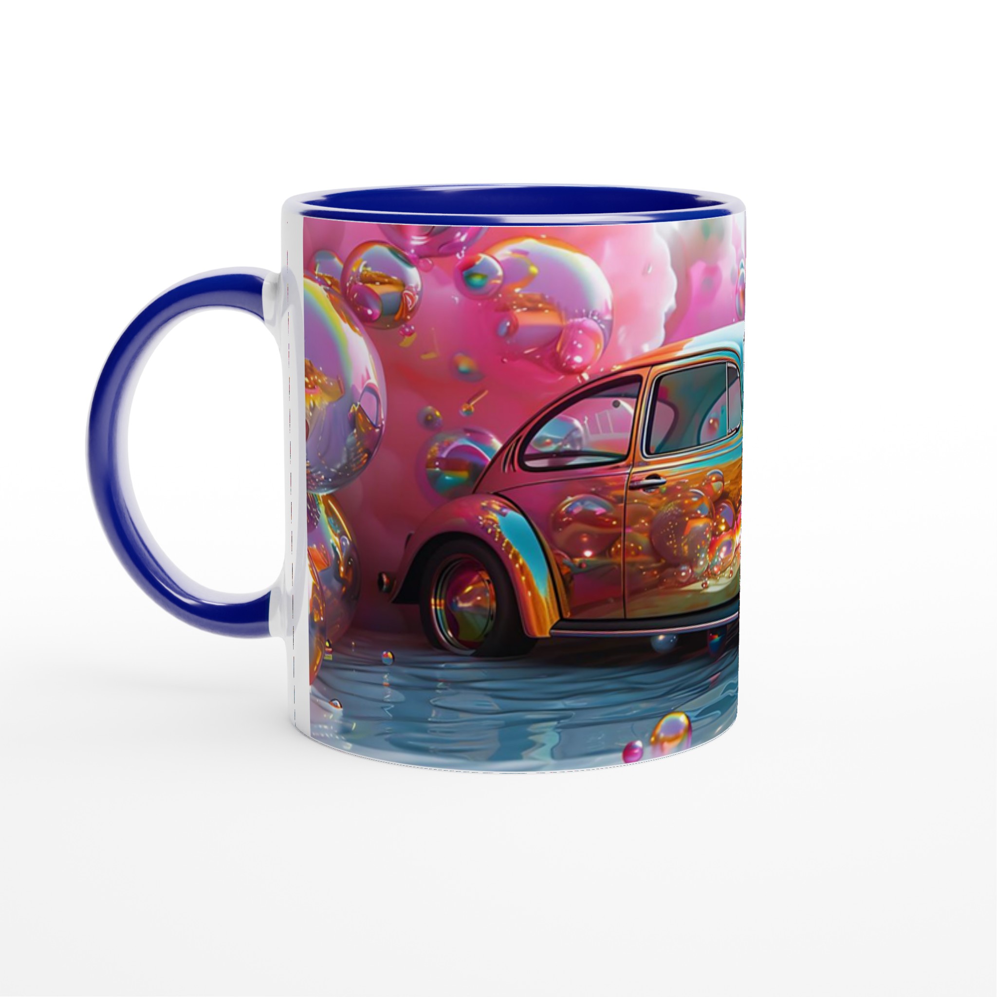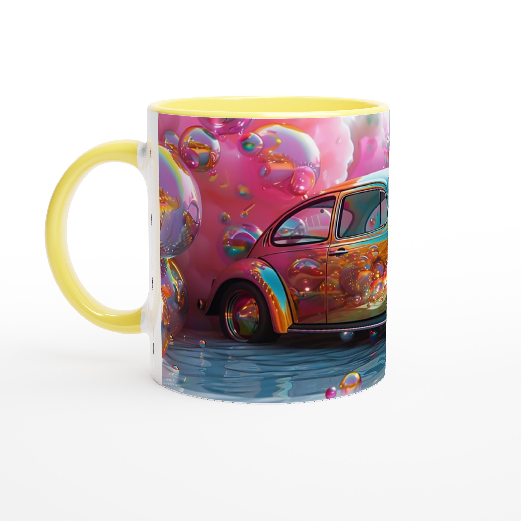 Stig in i en drömvärld varje gång du tar en klunk med denna unikt designade keramiska mugg. Inspirerad av de livfulla färgerna och den lekfulla energin från en fantasifull rosa himmel fylld med glittrande bubblor och en skimrande bil, är denna mugg mer än bara en kopp – den är en konstnärlig upplevelse. Den blanka vita ytan framhäver trycket med exceptionell klarhet och levande färger, så att varje detalj av denna magiska scen bibehålls, även efter otaliga användningar i mikron och diskmaskinen.