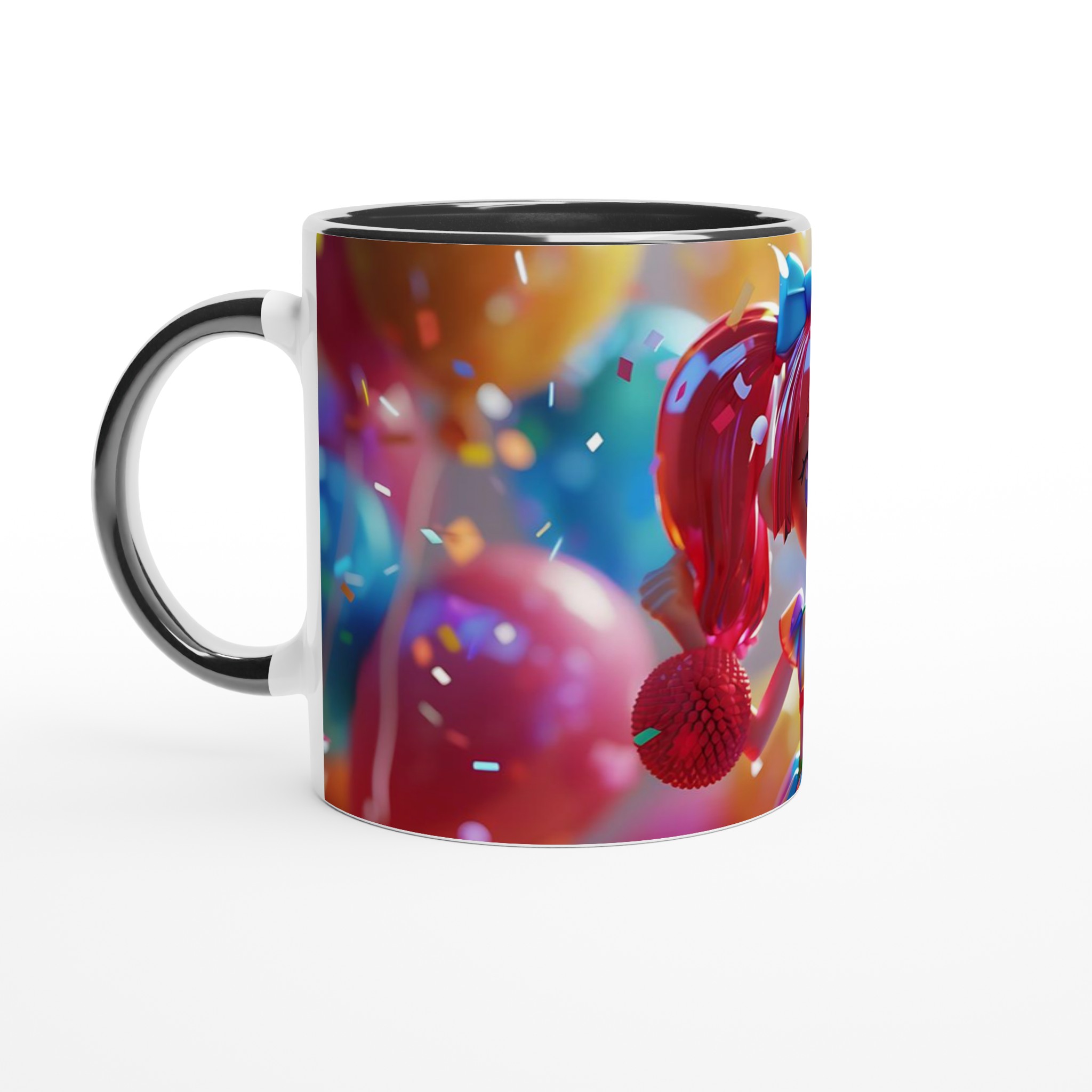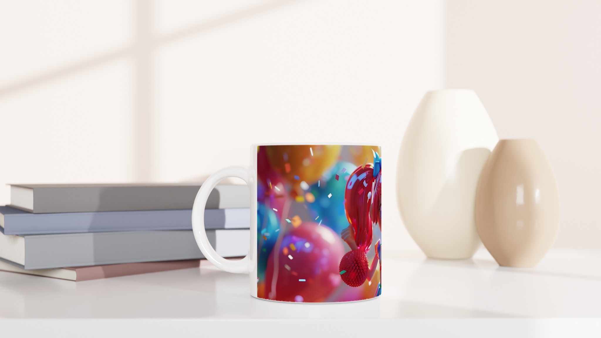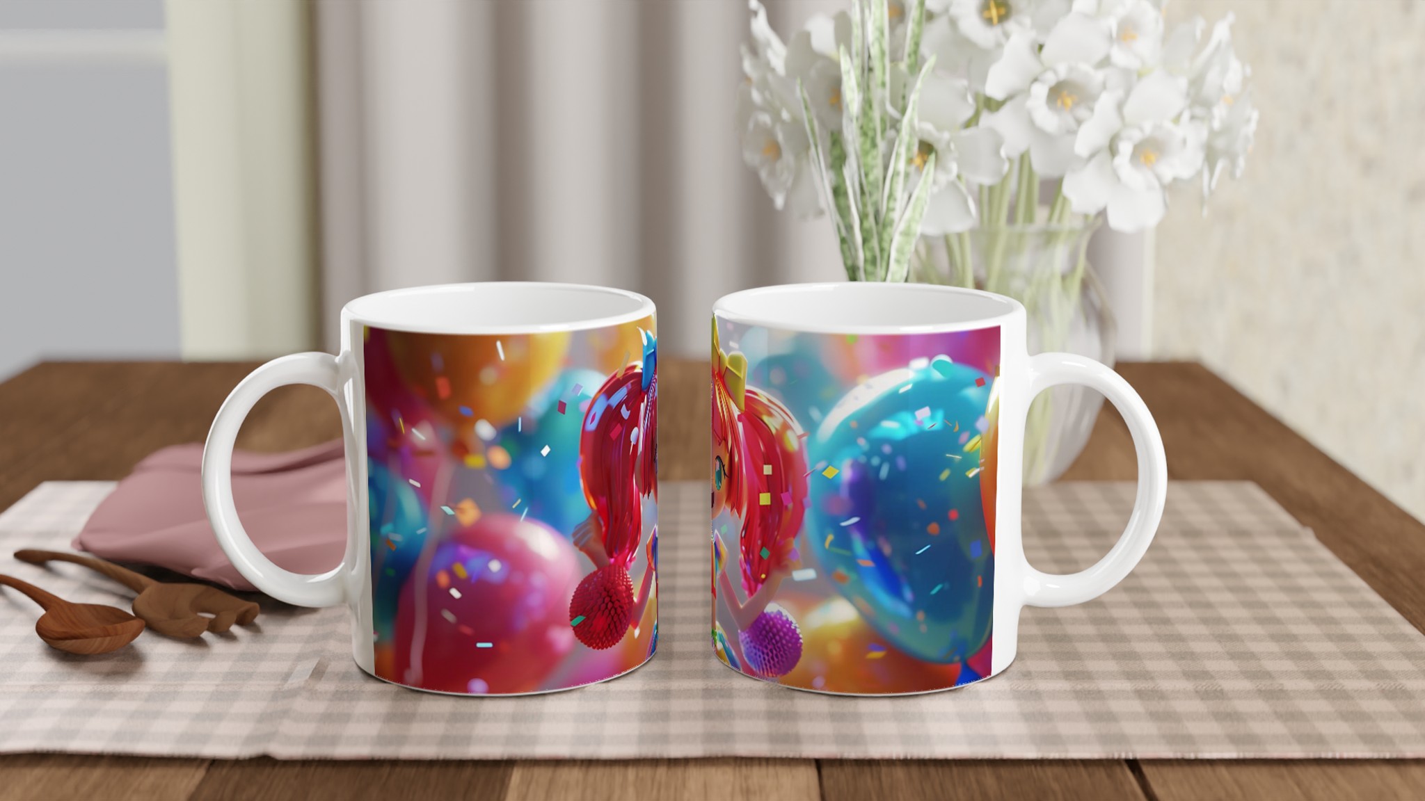 Lys upp din dag med denna otroligt festliga keramiska mugg! Inspirerad av en värld av glädje och konfetti, bjuder denna mugg in till en explosion av färg och lekfullhet. Den är perfekt för morgonkaffet, kvällens varma choklad eller när du bara vill njuta av en kopp te och drömma dig bort till ett karnevalstema. Den blanka ytan gör att trycken framhävs med klara och levande färger, som håller sig fina även efter många turer i mikron och diskmaskinen.