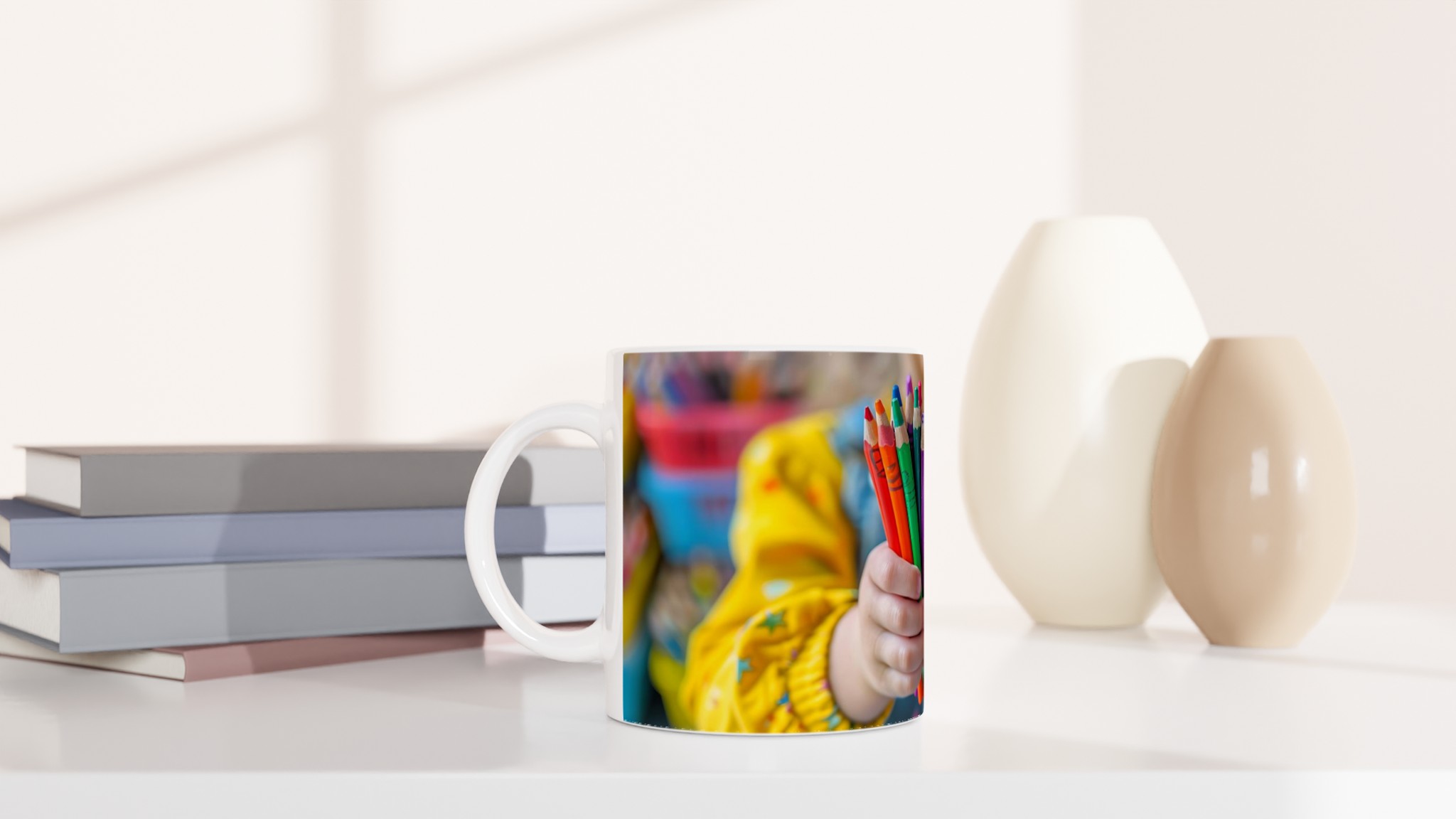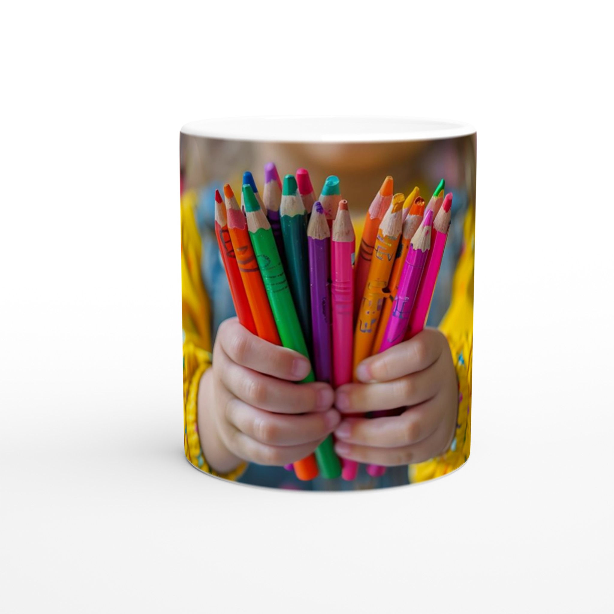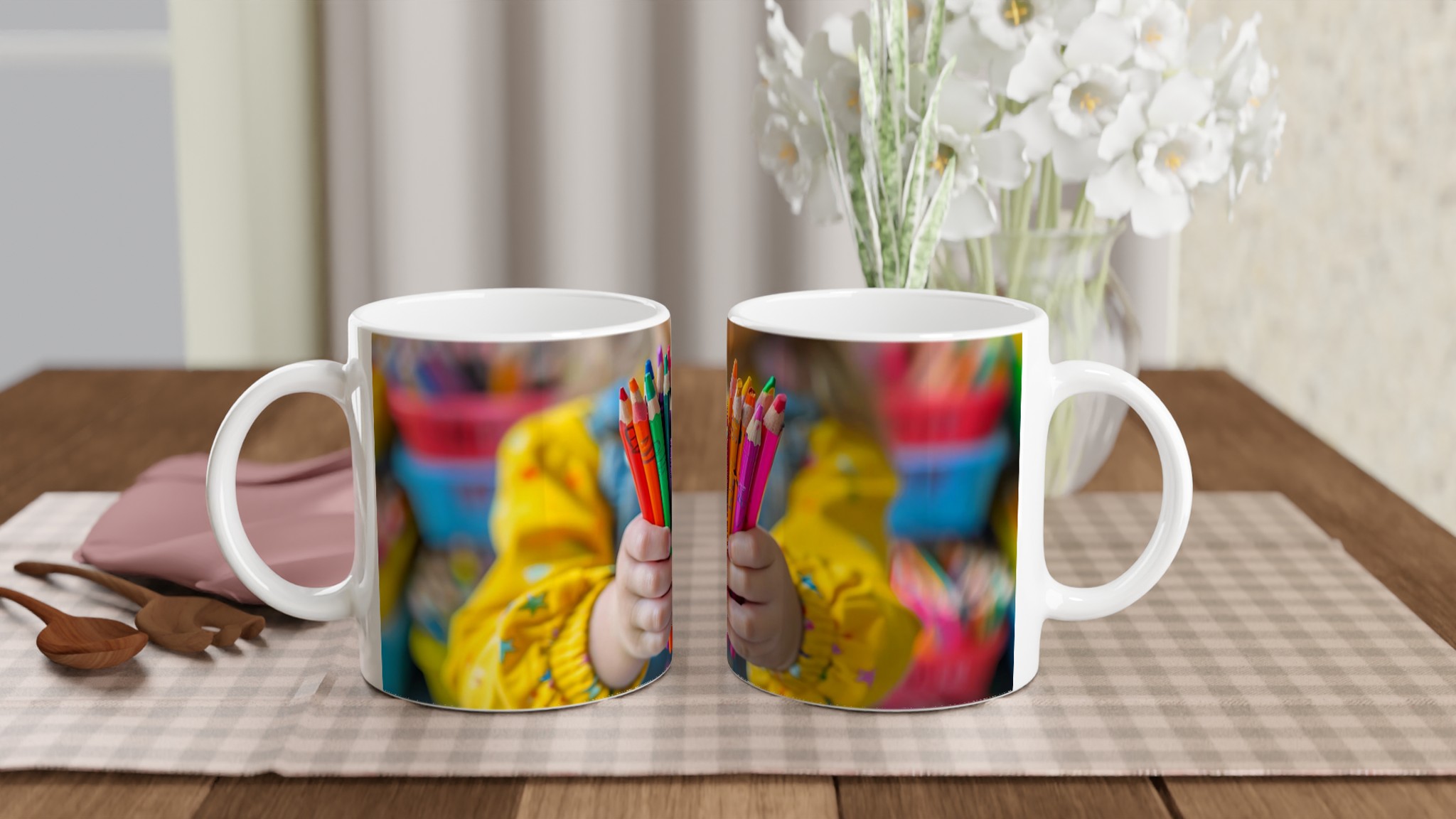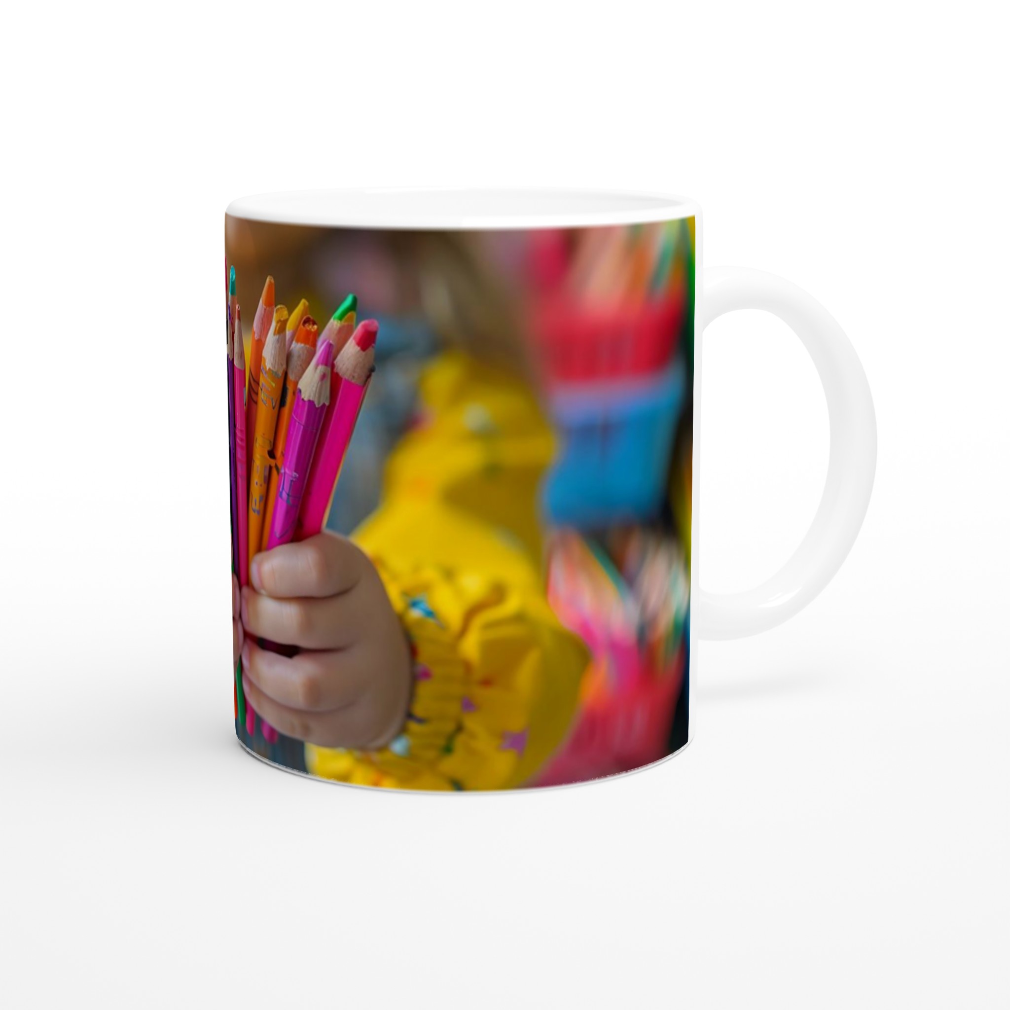 Låt din inre konstnär blomstra varje gång du tar en klunk! Inspirerad av livfulla färgpennor och glädjen i att skapa, blir denna stilrena keramiska mugg snabbt en vardagsfavorit. Perfekt för morgonkaffet, kvällens varma choklad, eller när du bara vill njuta av en kopp te medan du planerar ditt nästa mästerverk. Den blanka vita ytan gör att trycken framhävs med klara och levande färger, som håller sig fina även efter många turer i mikron och diskmaskinen.