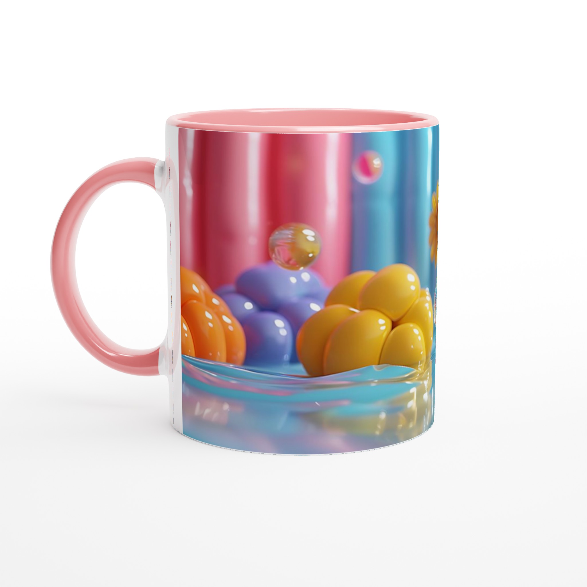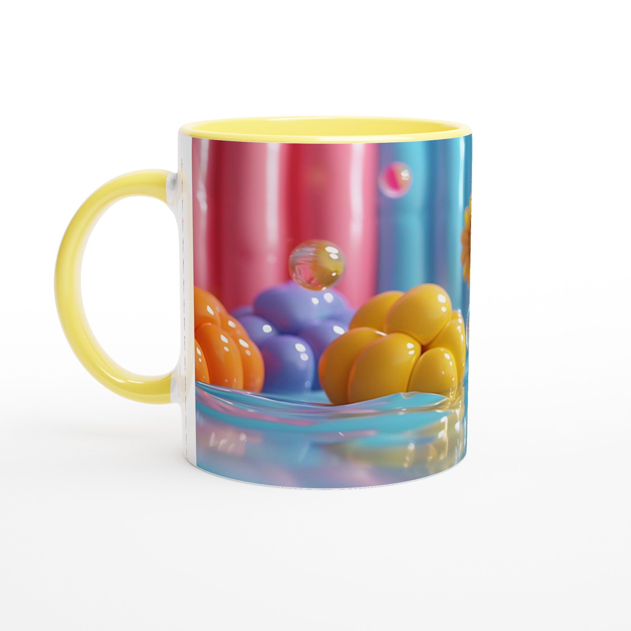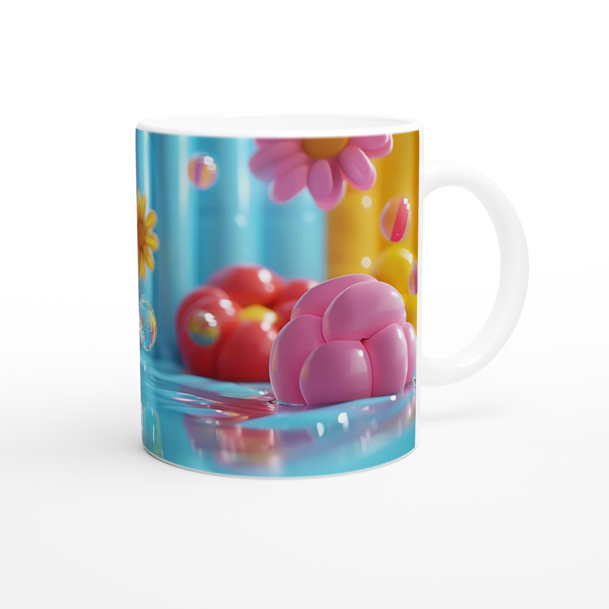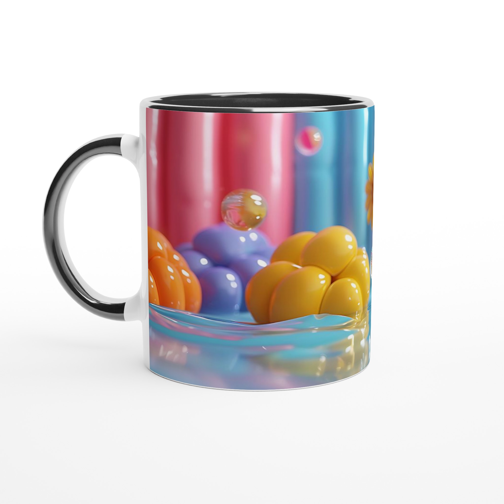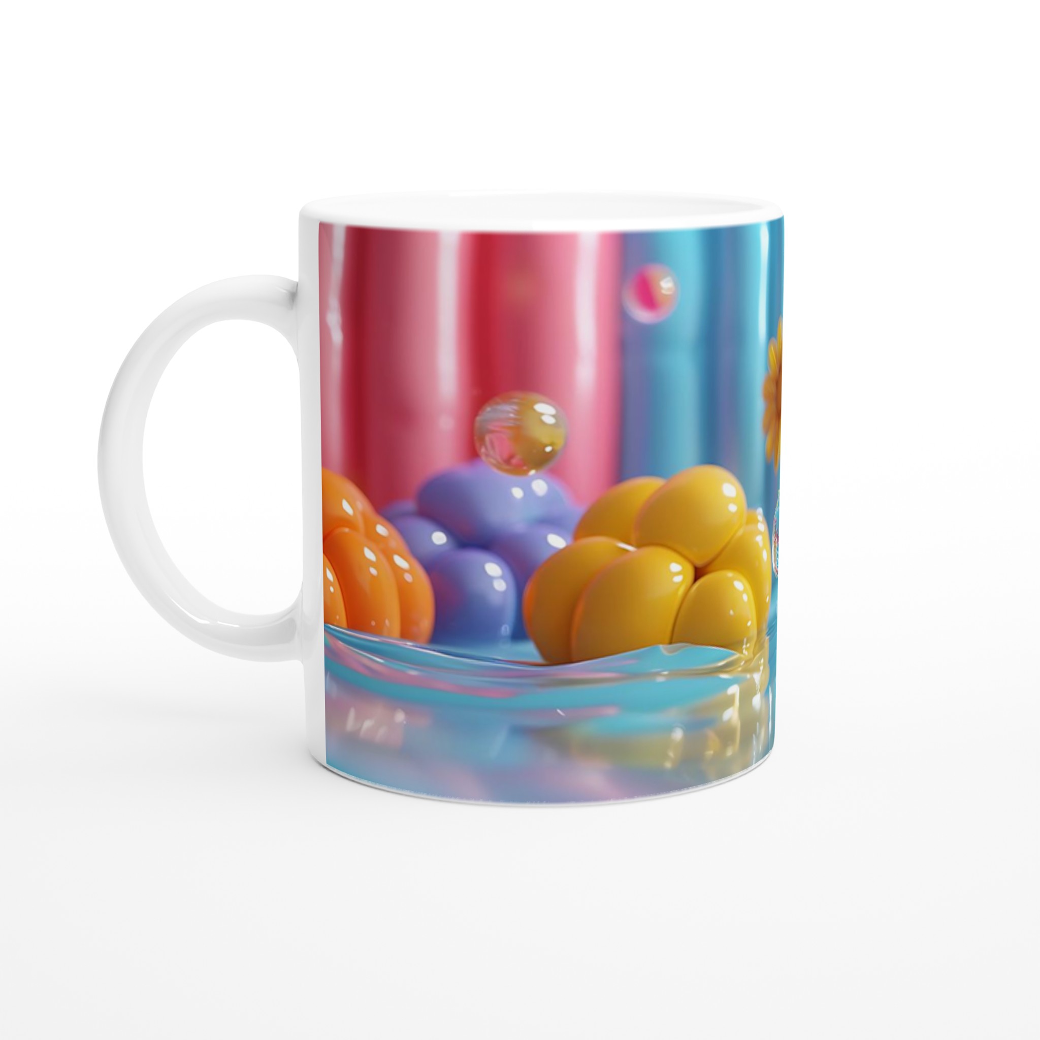 Lys upp din dag med vår färgglada keramiska mugg! Inspirerad av bilden, med dess lekfulla ”godisvärld”-känsla och levande nyanser av rosa, gult, blått och orange, är denna mugg designad för att sprida glädje. Den här stilrena keramiska muggen blir snabbt en vardagsfavorit. Perfekt för morgonkaffet, kvällens varma choklad eller när du bara vill njuta av en kopp te. Den blanka vita ytan gör att trycken framhävs med klara och levande färger, som håller sig fina även efter många turer i mikron och diskmaskinen.