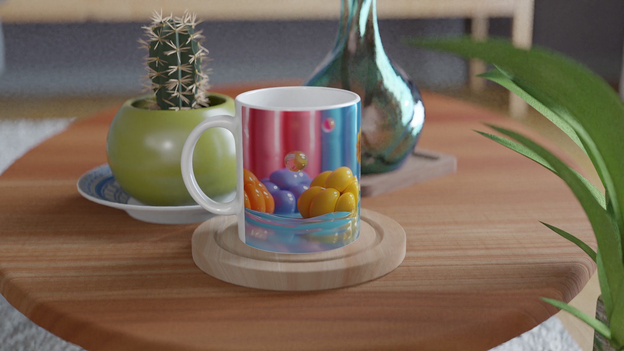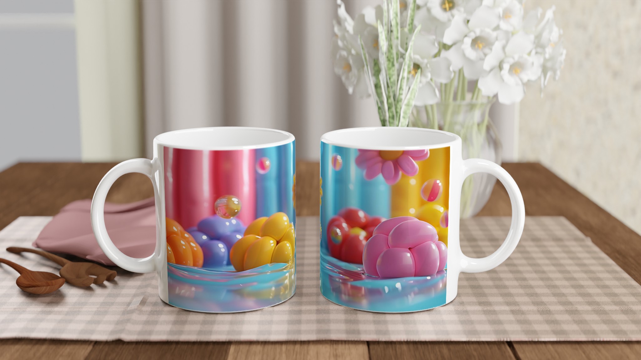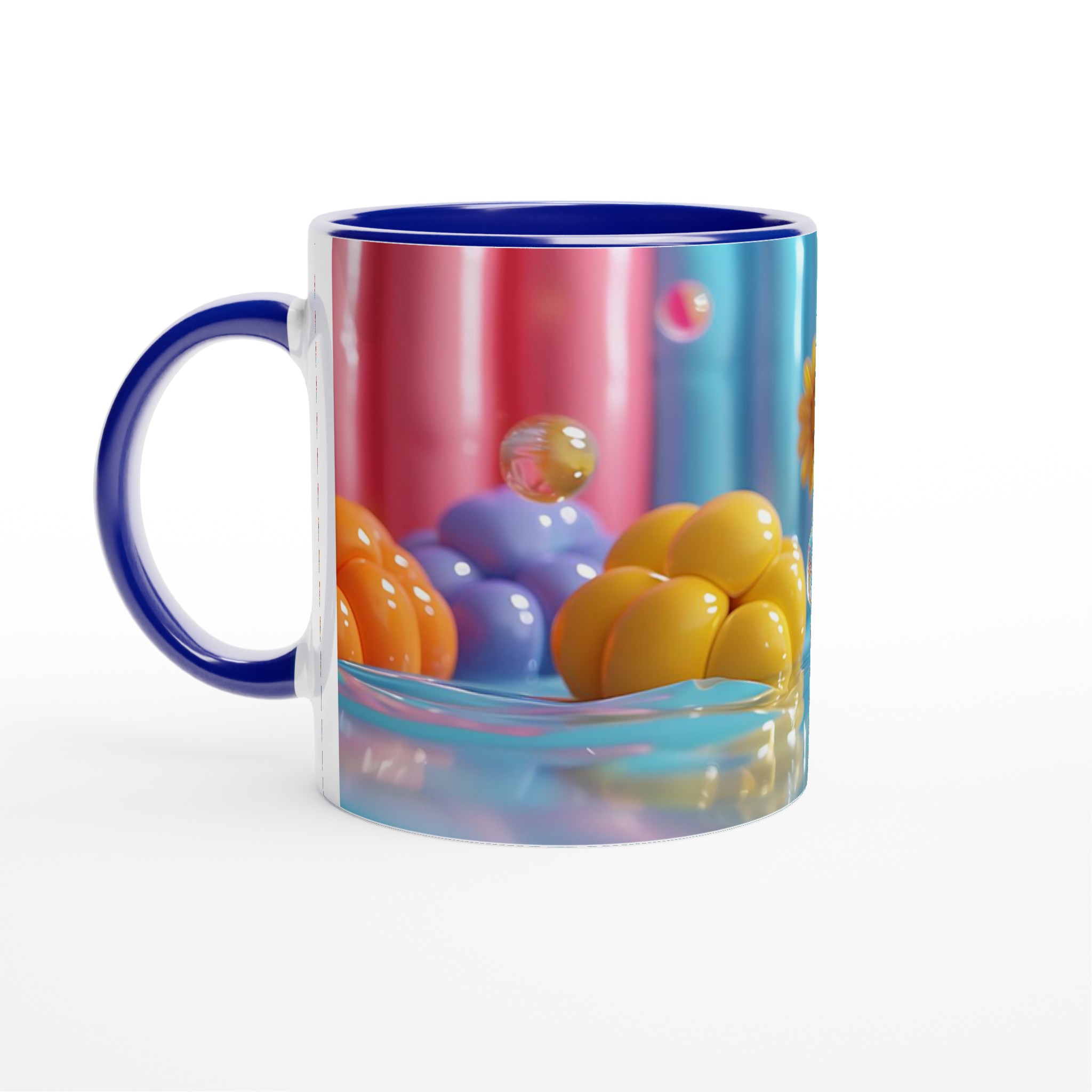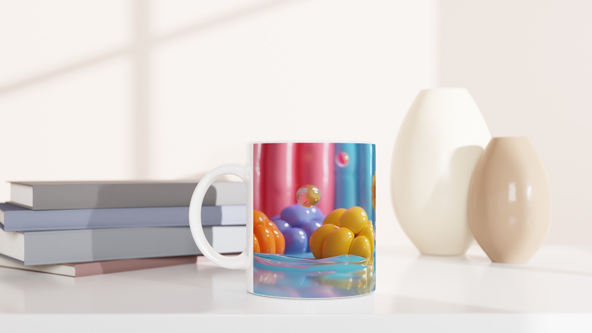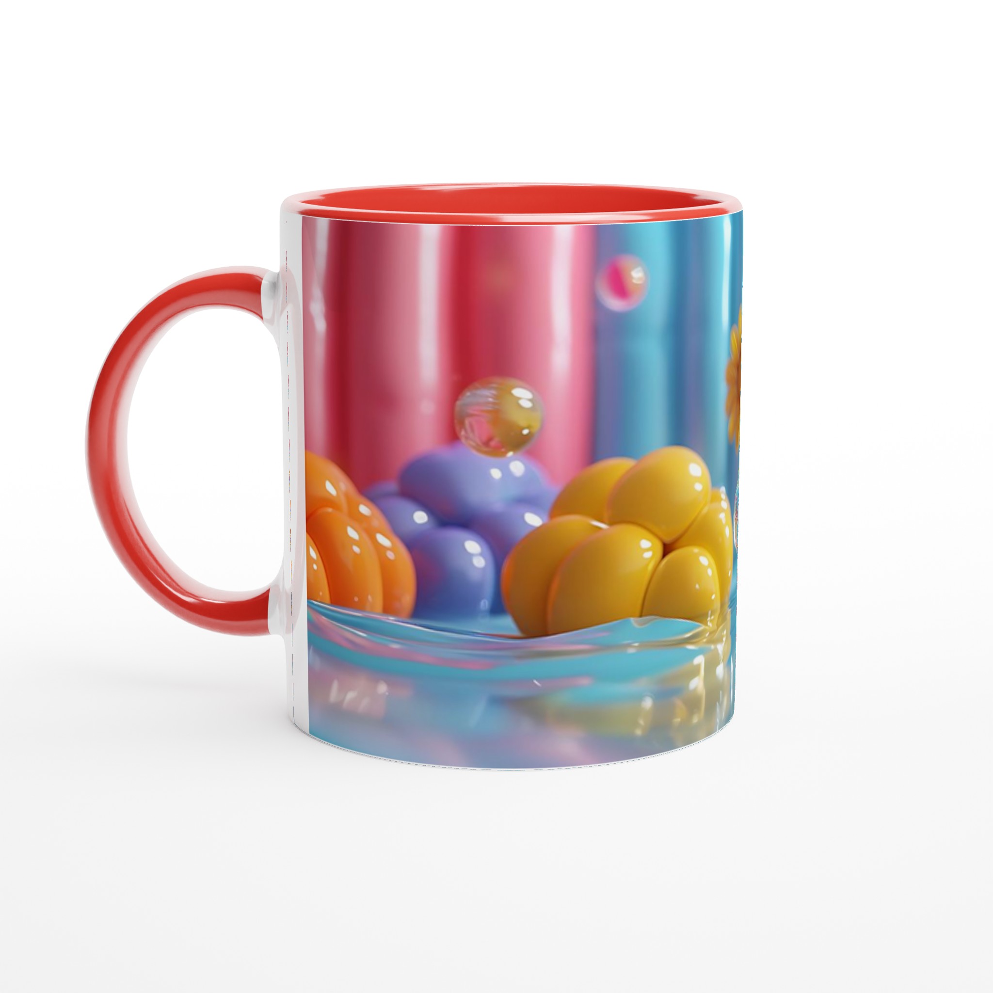 Lys upp din dag med vår färgglada keramiska mugg! Inspirerad av bilden, med dess lekfulla ”godisvärld”-känsla och levande nyanser av rosa, gult, blått och orange, är denna mugg designad för att sprida glädje. Den här stilrena keramiska muggen blir snabbt en vardagsfavorit. Perfekt för morgonkaffet, kvällens varma choklad eller när du bara vill njuta av en kopp te. Den blanka vita ytan gör att trycken framhävs med klara och levande färger, som håller sig fina även efter många turer i mikron och diskmaskinen.
