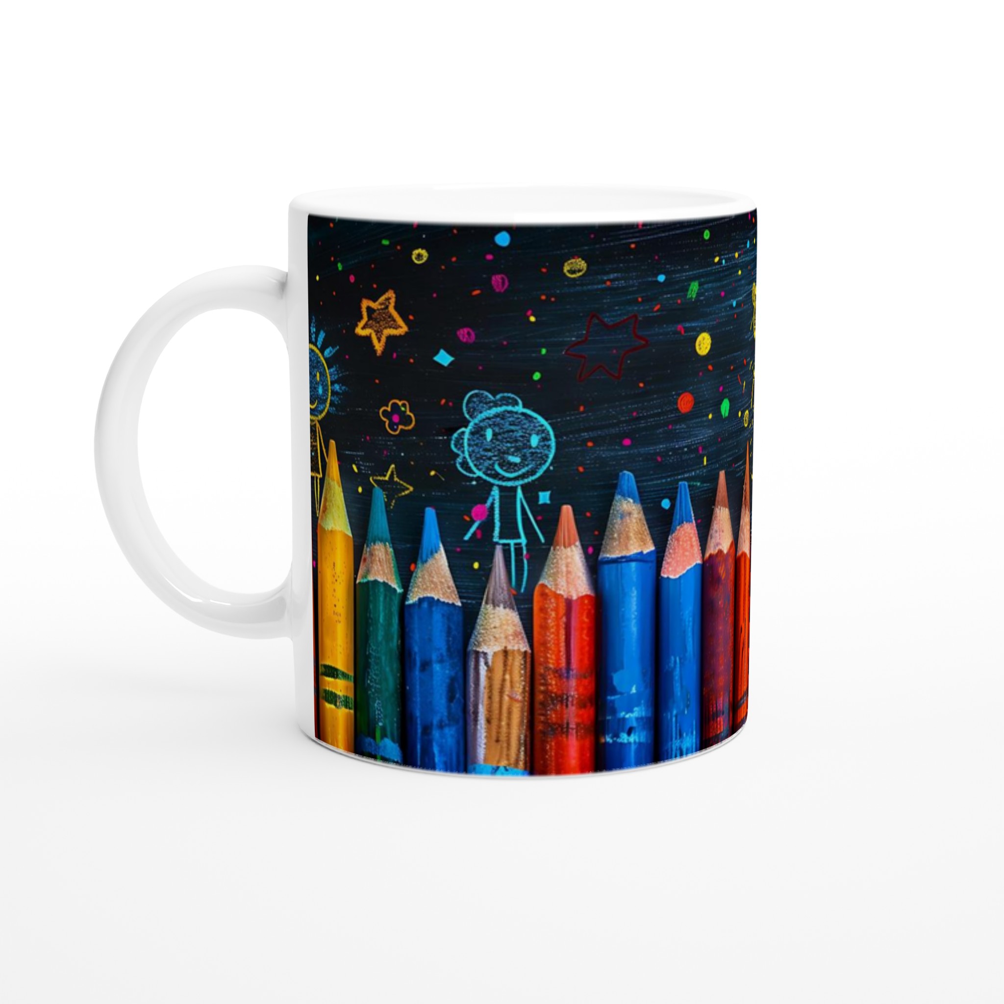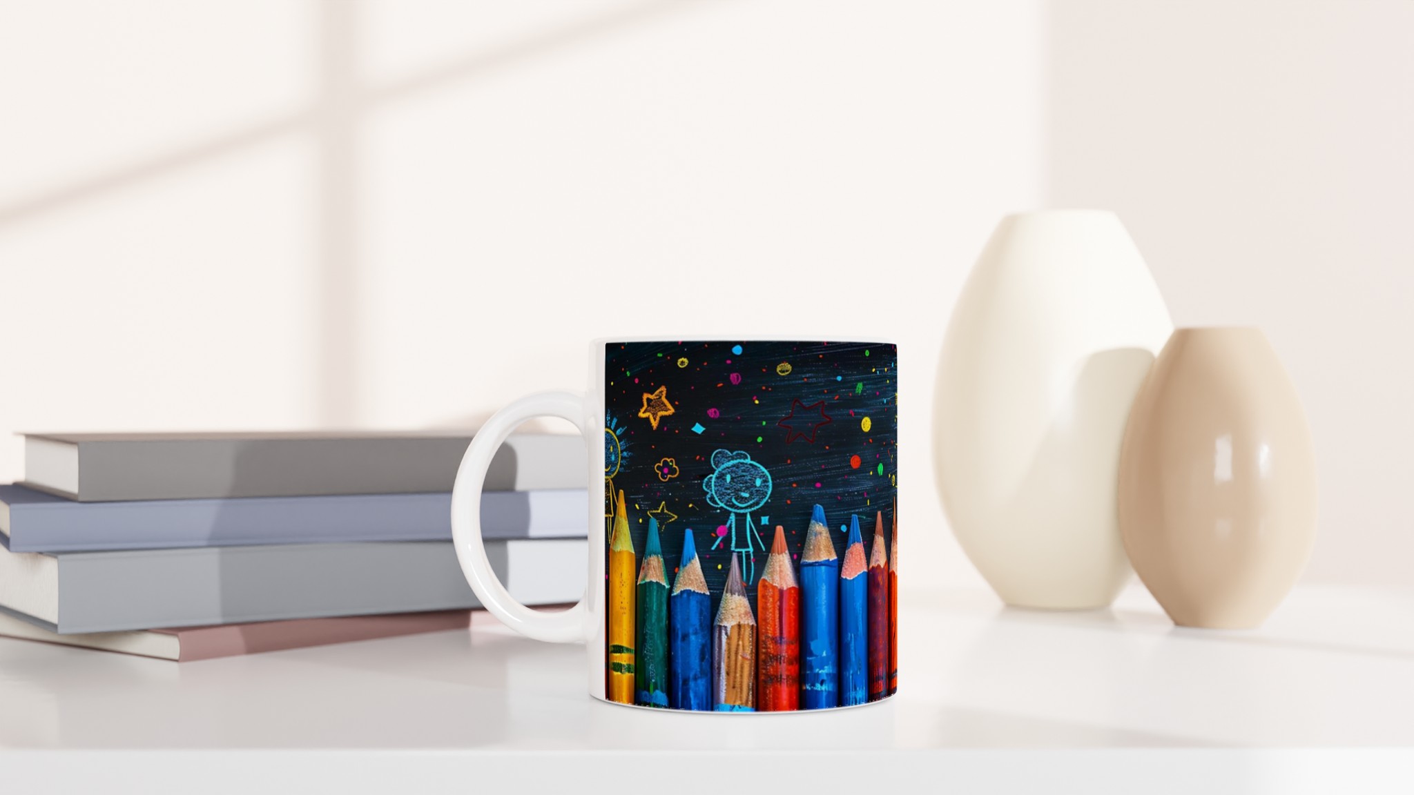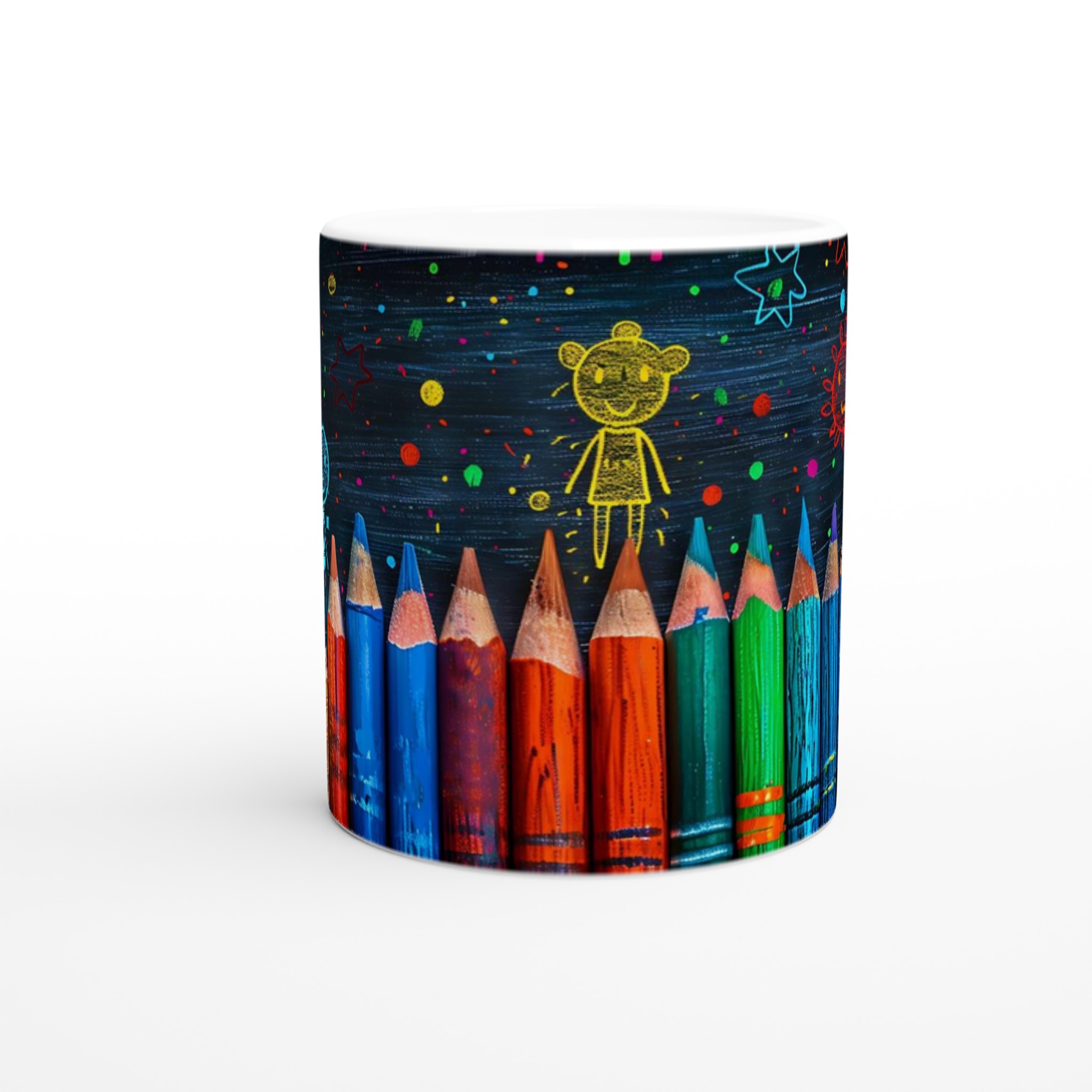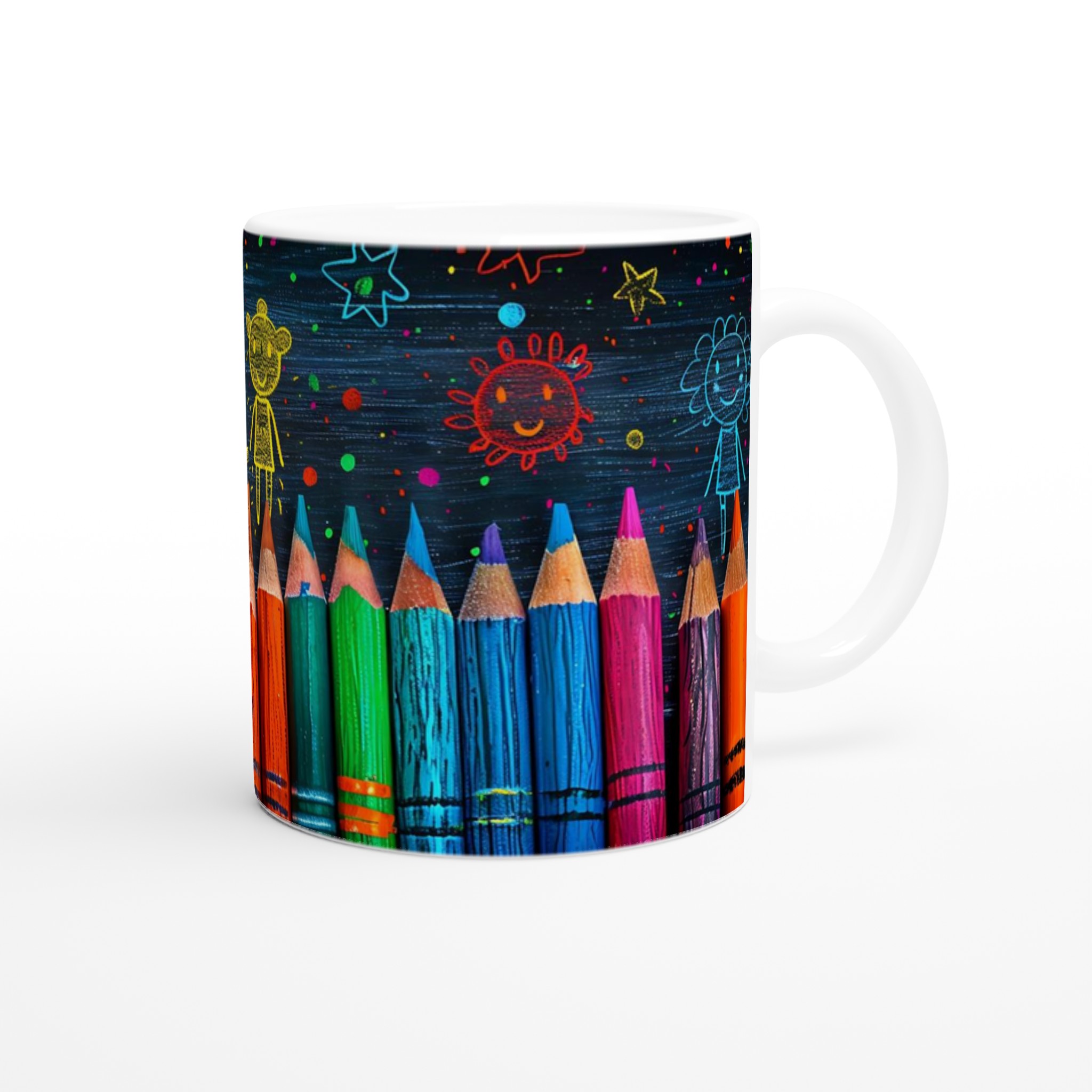 Väck din inre konstnär varje morgon med vår färgglada keramiska mugg! Inspirerad av den lekfulla charmen hos kritteckningar och en regnbåge av pennfärger, blir denna mugg snabbt en vardagsfavorit. Perfekt för morgonkaffet, kvällens varma choklad eller när du bara vill njuta av en kopp te och drömma dig bort till en värld av kreativitet. Den blanka vita ytan gör att trycken framhävs med klara och levande färger, som håller sig fina även efter många turer i mikron och diskmaskinen. Välj den färg som bäst speglar din personlighet eller samla flera för en explosion av färg i köket!