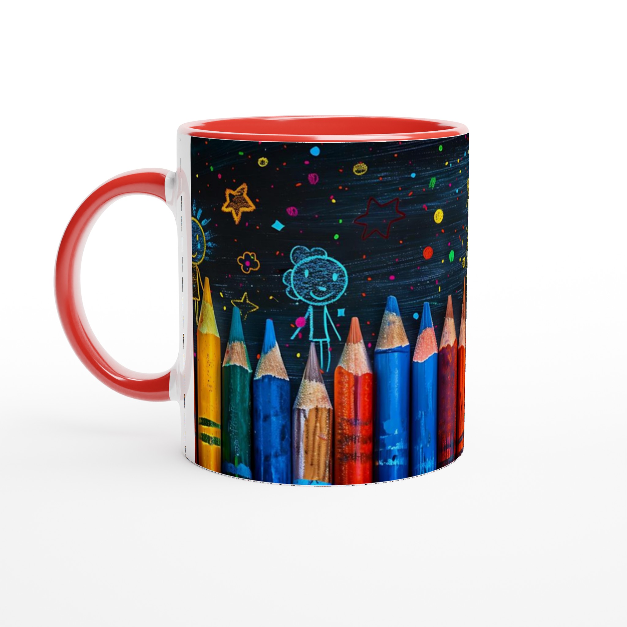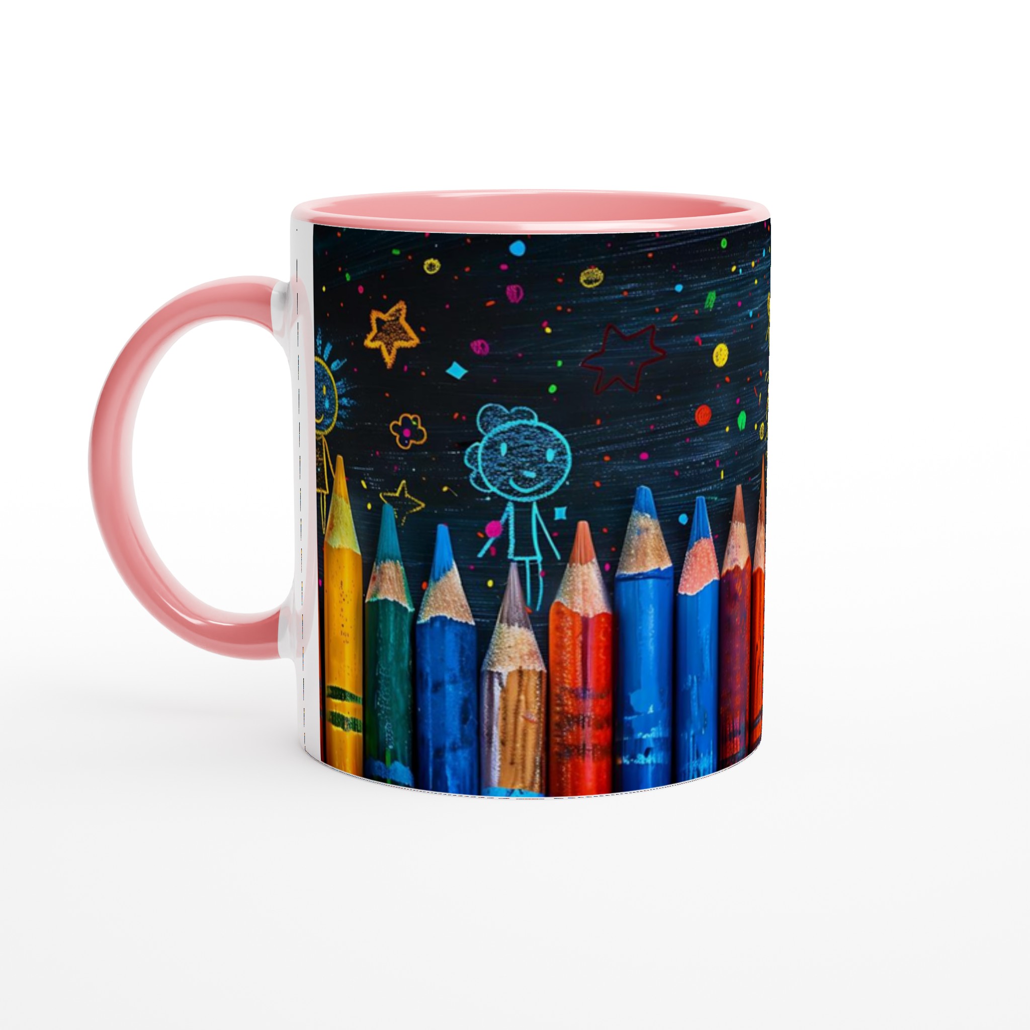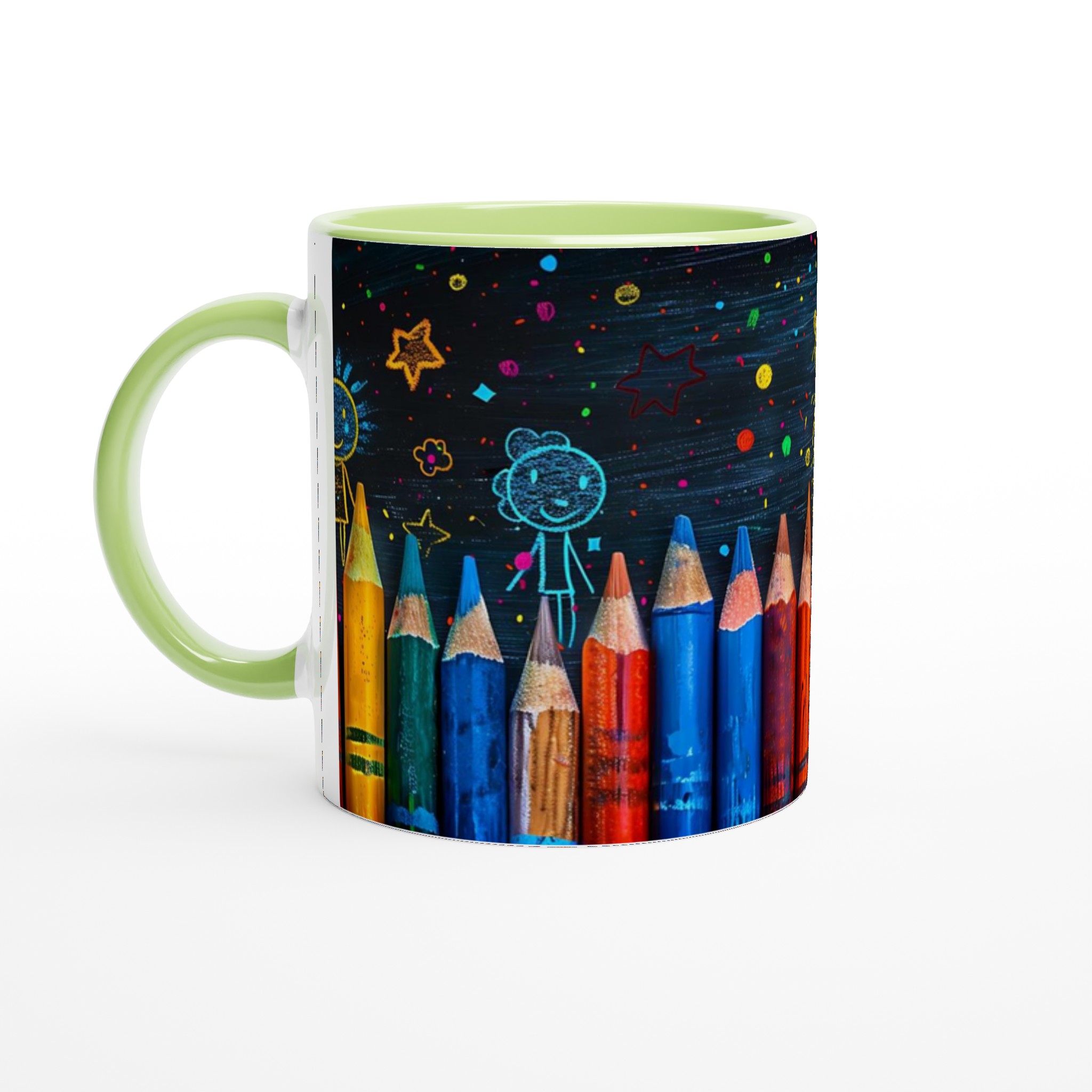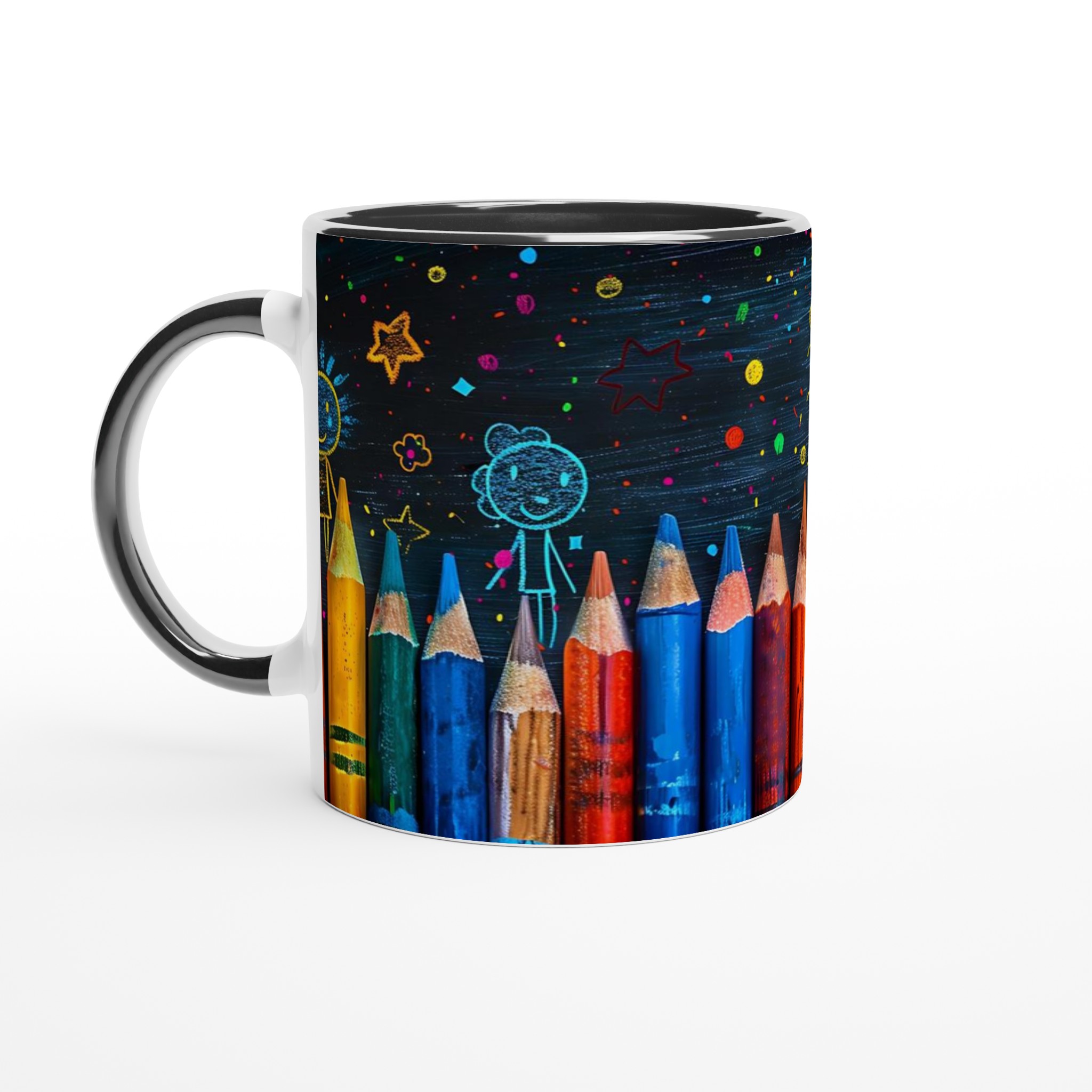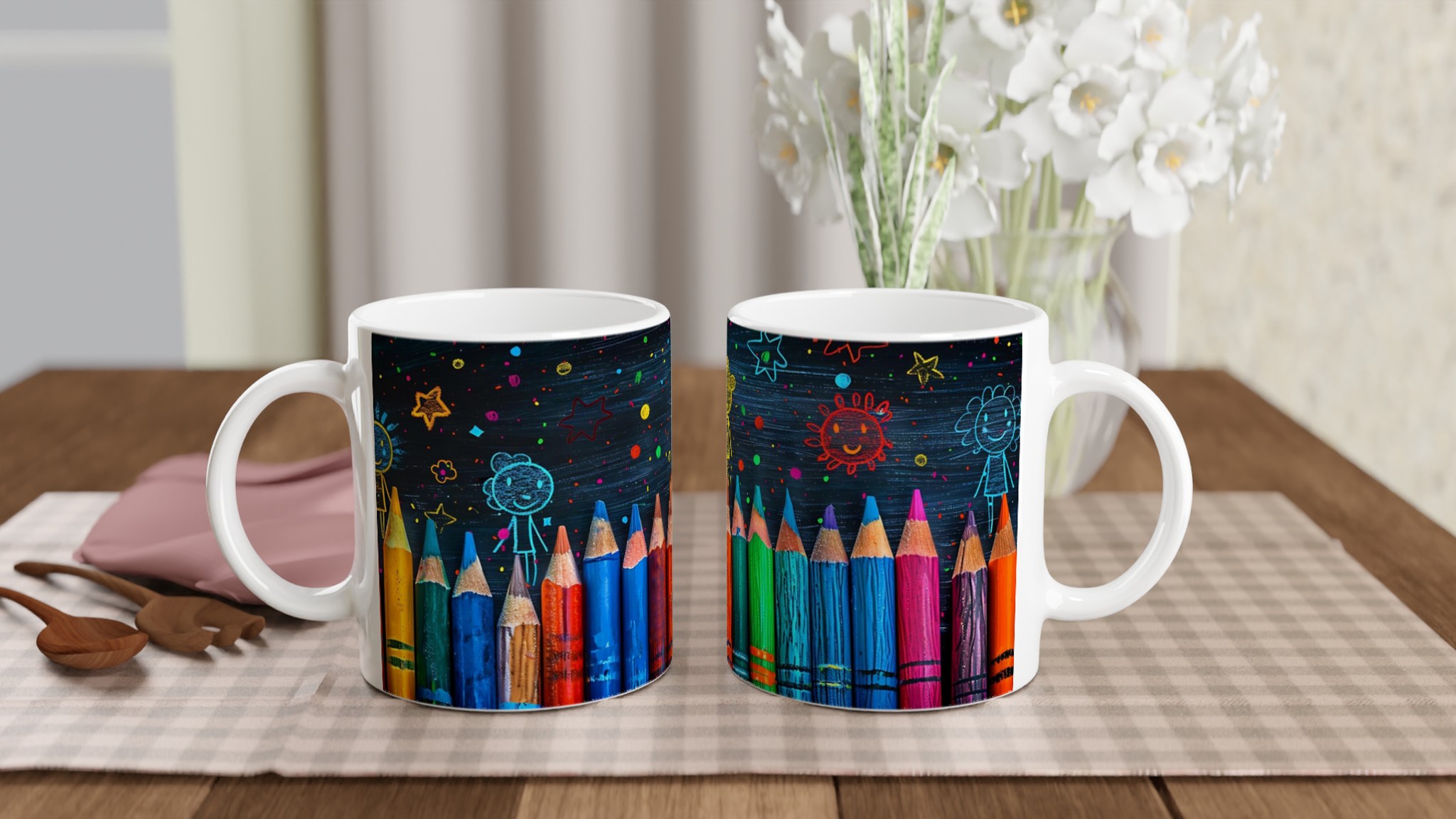 Väck din inre konstnär varje morgon med vår färgglada keramiska mugg! Inspirerad av den lekfulla charmen hos kritteckningar och en regnbåge av pennfärger, blir denna mugg snabbt en vardagsfavorit. Perfekt för morgonkaffet, kvällens varma choklad eller när du bara vill njuta av en kopp te och drömma dig bort till en värld av kreativitet. Den blanka vita ytan gör att trycken framhävs med klara och levande färger, som håller sig fina även efter många turer i mikron och diskmaskinen. Välj den färg som bäst speglar din personlighet eller samla flera för en explosion av färg i köket!