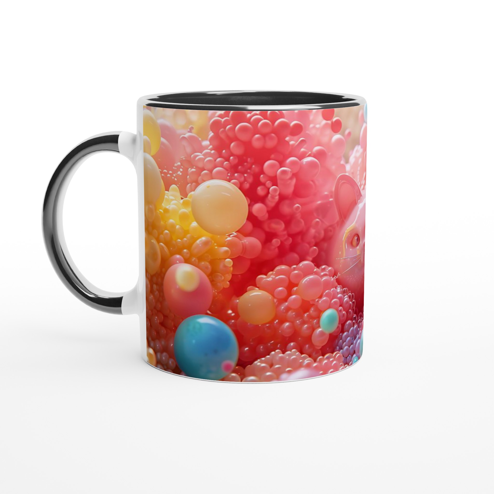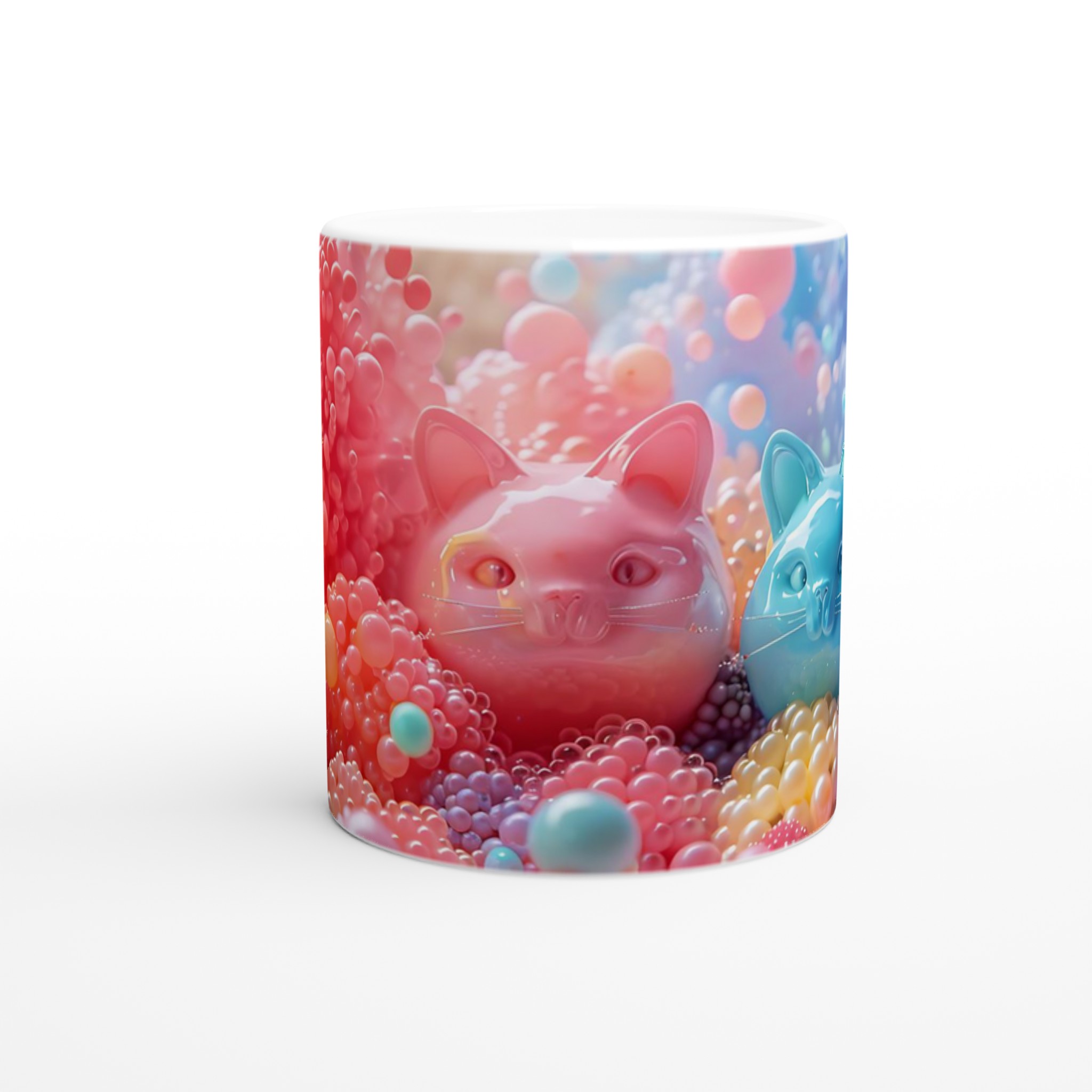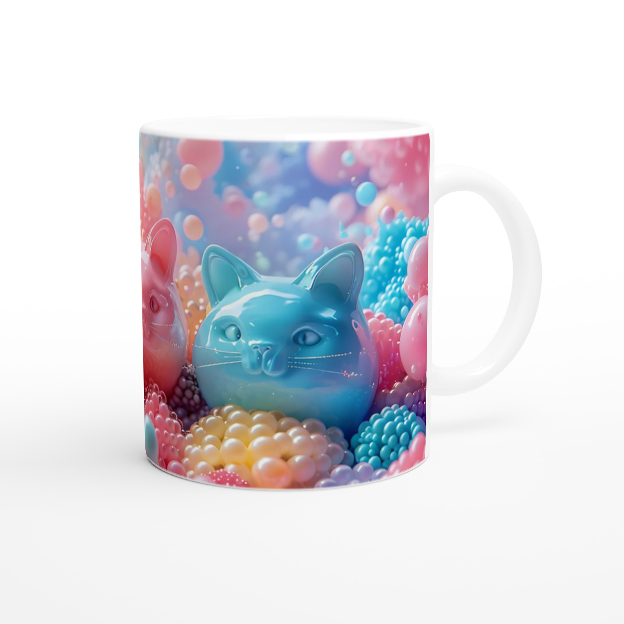 Låt dig förtrollas av denna lekfulla keramiska mugg, en sann färgexplosion som blir en glädjespridare i din vardag. Med bubbliga kattansikten som tittar fram bland en kaskad av glada, färgstarka bubblor, är denna mugg en hyllning till det söta och det surrealistiska. Den är perfekt för morgonkaffet, kvällens varma choklad eller när du bara vill njuta av en kopp te med ett leende på läpparna. Den blanka vita ytan gör att trycken framhävs med klara och levande färger, som håller sig fina även efter många turer i mikron och diskmaskinen.
