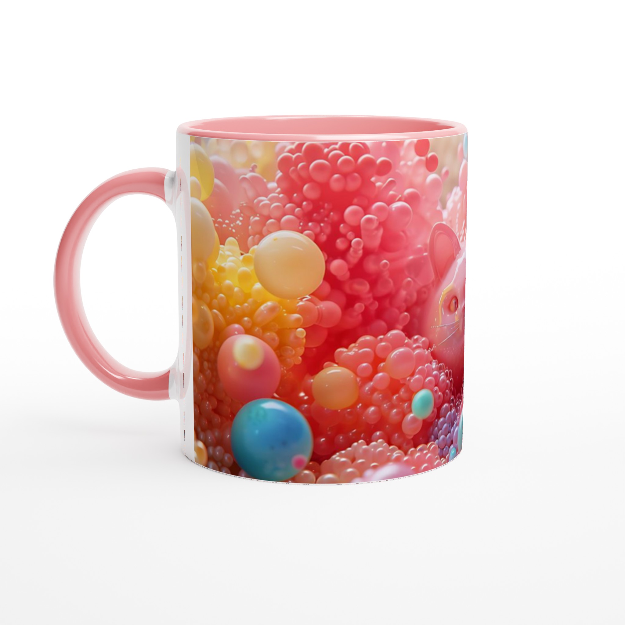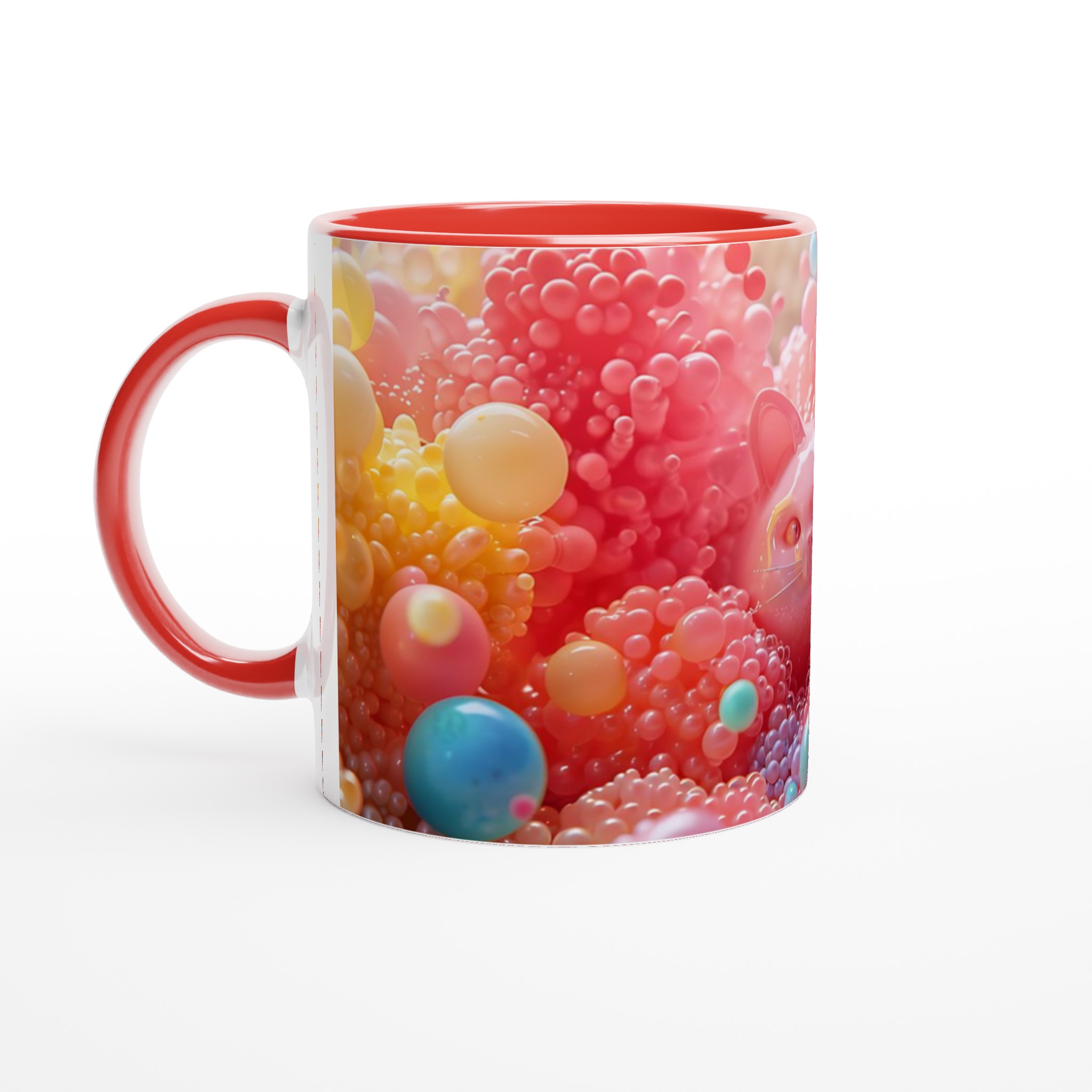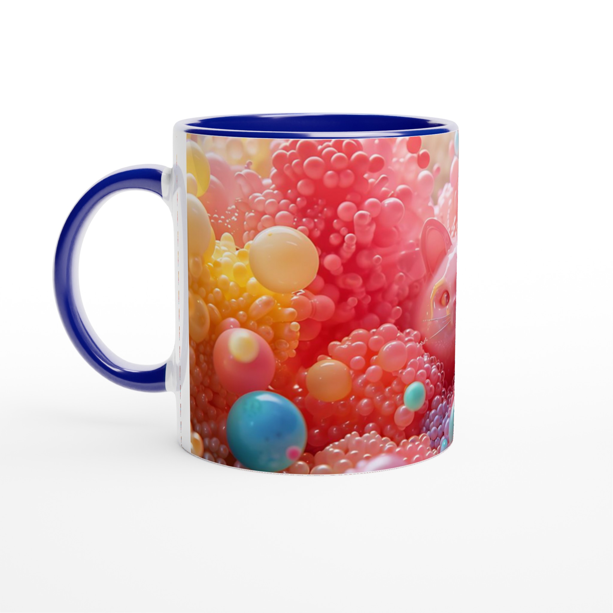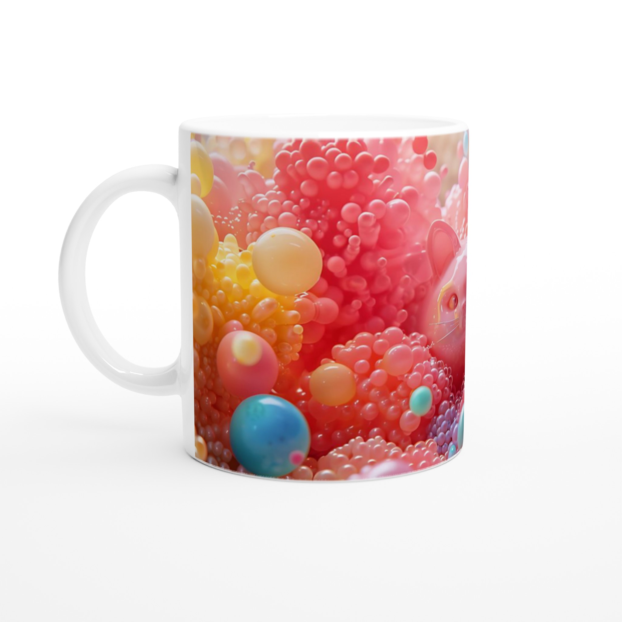 Låt dig förtrollas av denna lekfulla keramiska mugg, en sann färgexplosion som blir en glädjespridare i din vardag. Med bubbliga kattansikten som tittar fram bland en kaskad av glada, färgstarka bubblor, är denna mugg en hyllning till det söta och det surrealistiska. Den är perfekt för morgonkaffet, kvällens varma choklad eller när du bara vill njuta av en kopp te med ett leende på läpparna. Den blanka vita ytan gör att trycken framhävs med klara och levande färger, som håller sig fina även efter många turer i mikron och diskmaskinen.