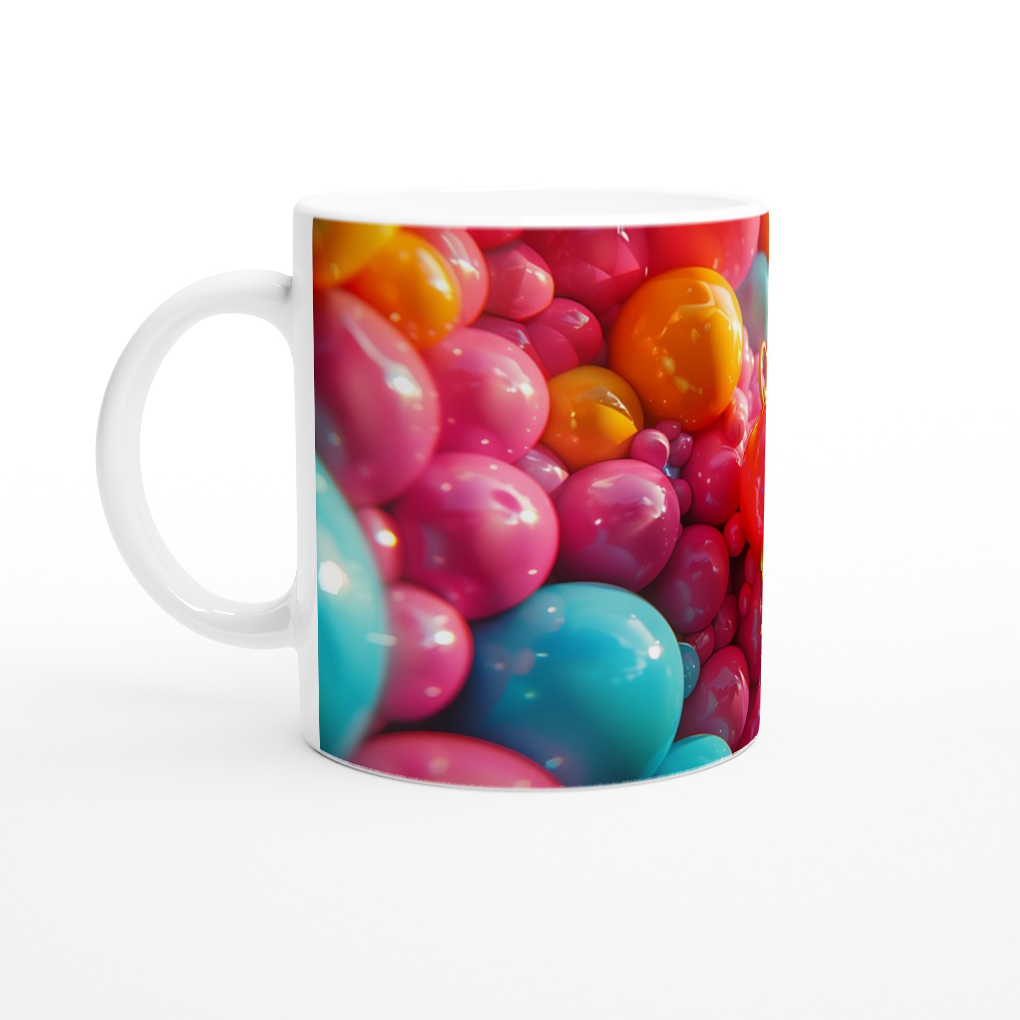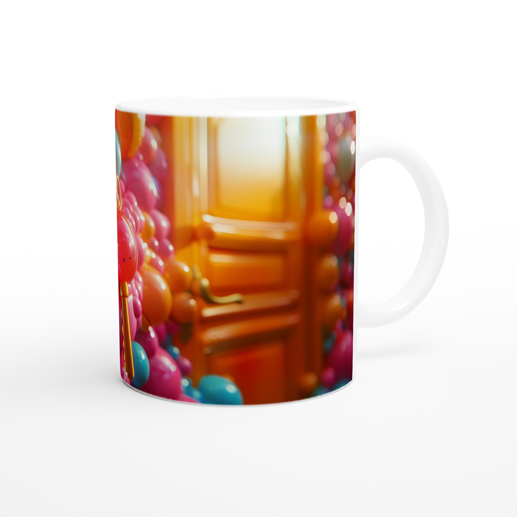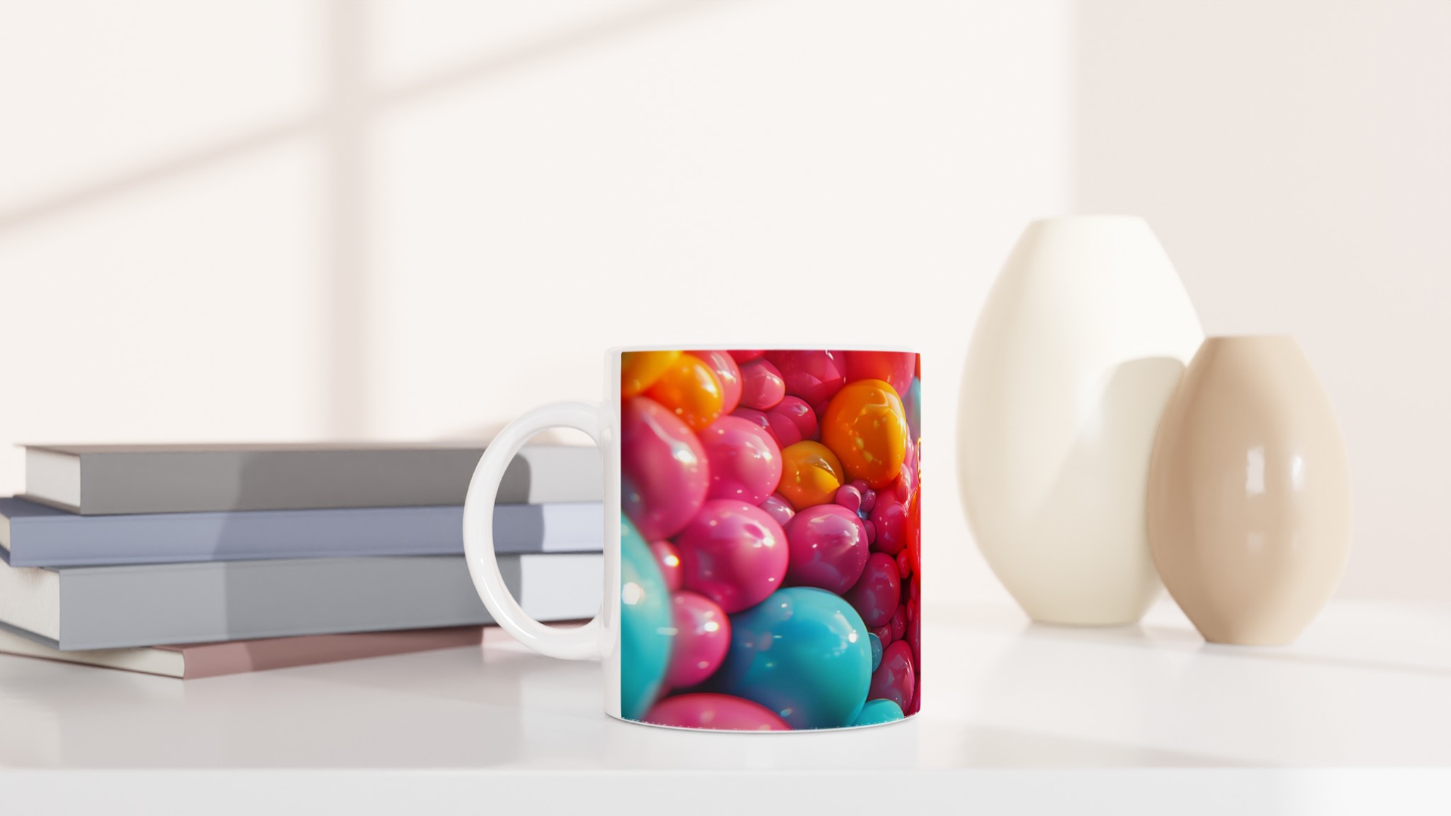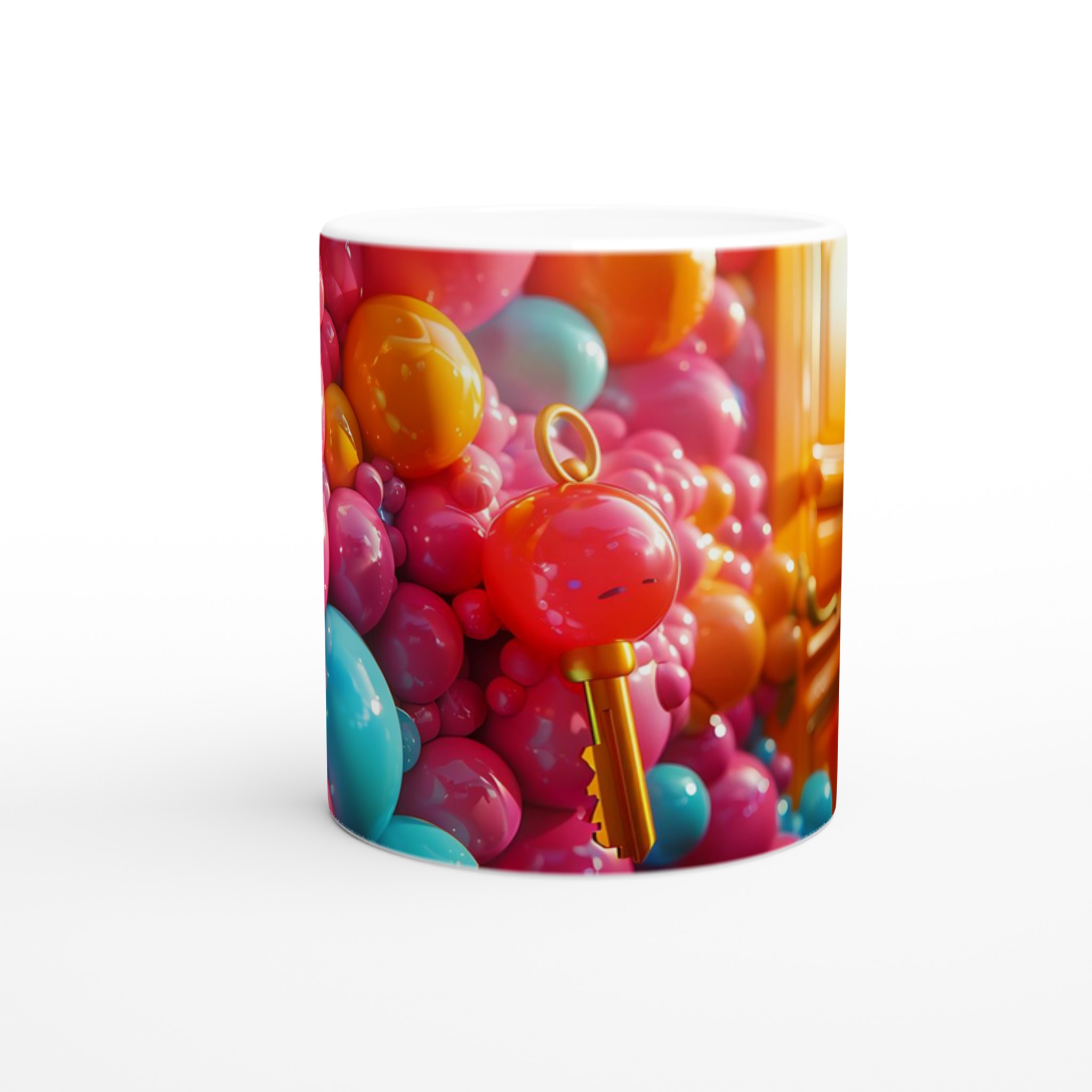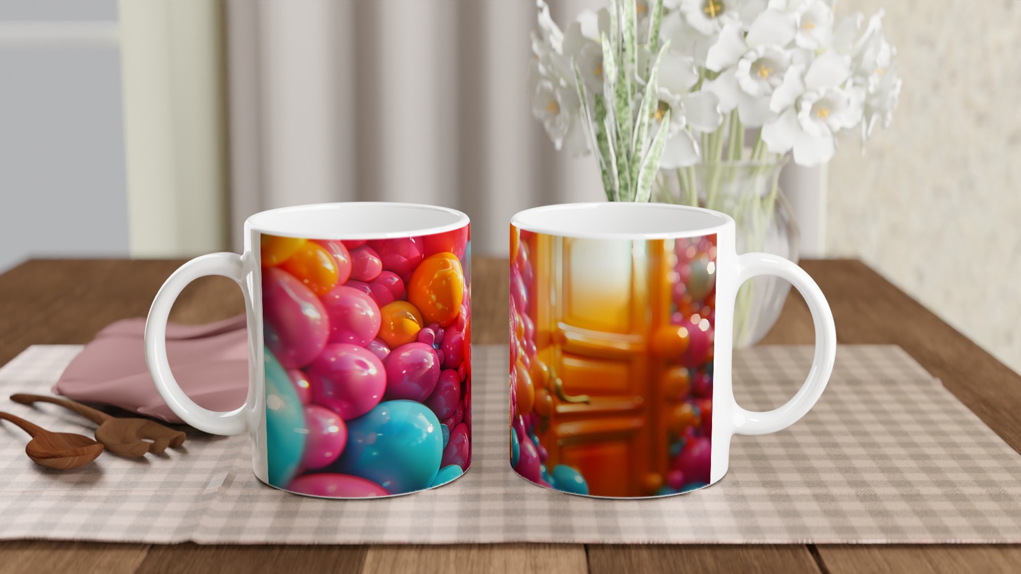 Öppna dörren till din perfekta fikapaus med den här livfulla keramiska muggen! Inspirerad av en värld av lekfulla färger och glänsande ytor, blir denna mugg snabbt en favorit som lyser upp din dag. Den är perfekt för morgonkaffet som väcker dig, kvällens mysiga varma choklad eller när du bara vill njuta av en lugn kopp te. Den blanka ytan får ditt valda tryck att framhävas med klara och levande färger, som håller sig fina även efter otaliga turer i mikron och diskmaskinen.
